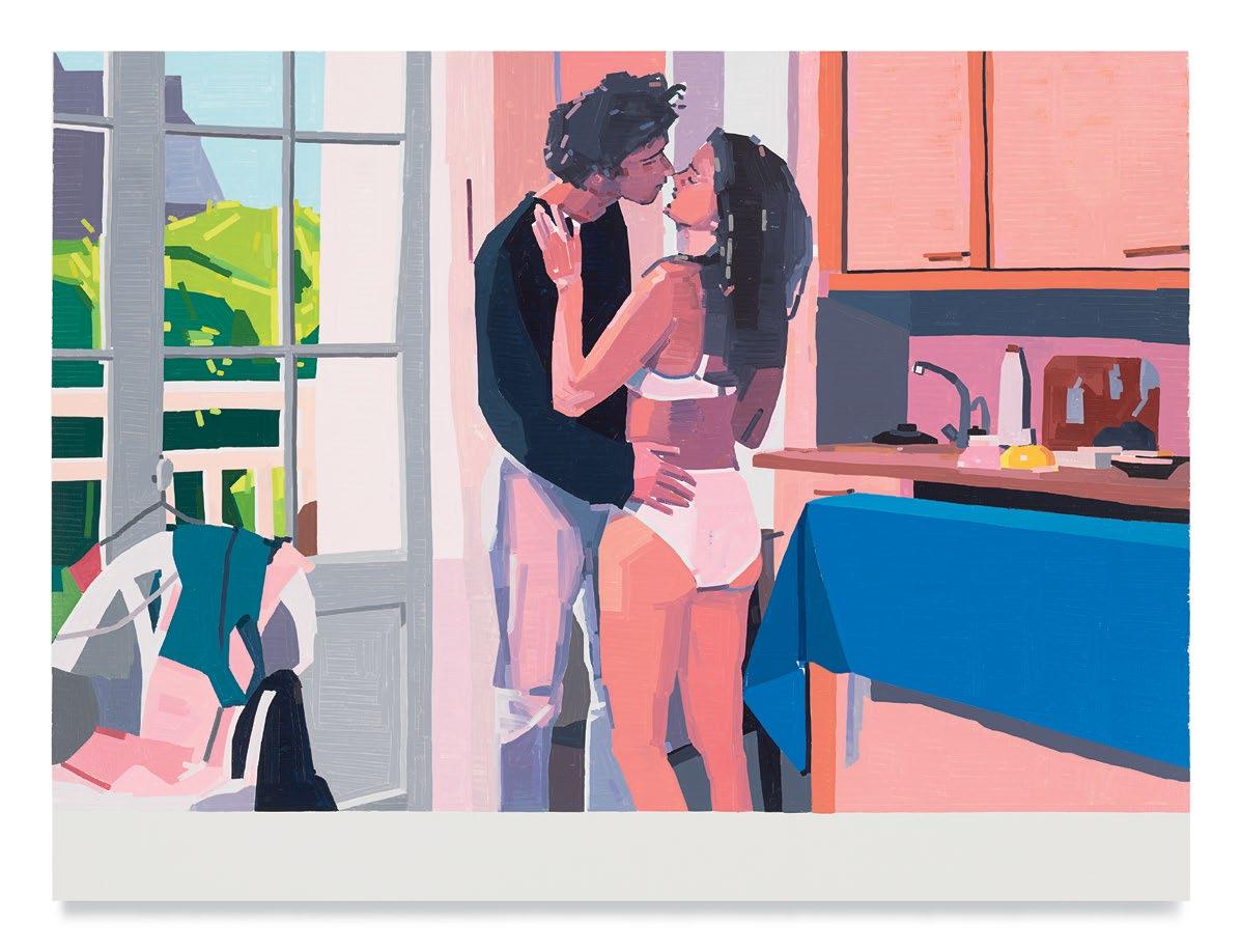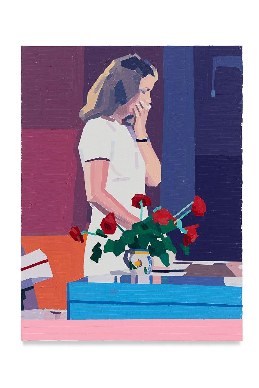 Yanai’s recent works, such as Claire and Her Boyfriend (2021), seem to harken back to Pierre and Hélène’s romance. In this instance, two lovers are embracing in a sundrenched driveway. A car sits idly in the corner, while the female figure—half-nude in a blue bikini bottom—lifts to the tips of her toes to meet her lover for a kiss, their faces blending in a deluge of auburn hair. The work recalls the opening scene of Sautet’s film, in which Pierre and Hélène, after getting up from bed, embrace each other passionately over Hélène’s typewriter. This moment is almost replicated in Yanai’s Saint-Malo (A Summer’s Tale) (2020): two figures—a fully dressed man and a woman clad in white underwear—about to touch lips in a kitchen fitted with pink cabinetry that complements the fleshy tone of the female figure’s naked skin. These scenes feel as if they were ripped out of the film, and in some case they were. At the Hospital (Romy Schneider) (2021) shows Hélène at the hospital with her hand to her mouth, as she gets the news that Pierre has passed away; a bouquet of red roses sits in the foreground. Other examples include The Accident, The Letter, and The Café at Rennes (all 2021)—reimagined stills from the movie that speak to moments of heartbreak and tragedy, but also to unbridled intimacy, evoking a nostalgia for what was perhaps lost during the lonely months of the lockdown.