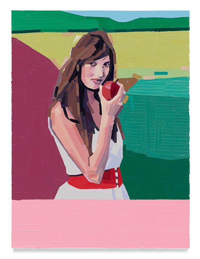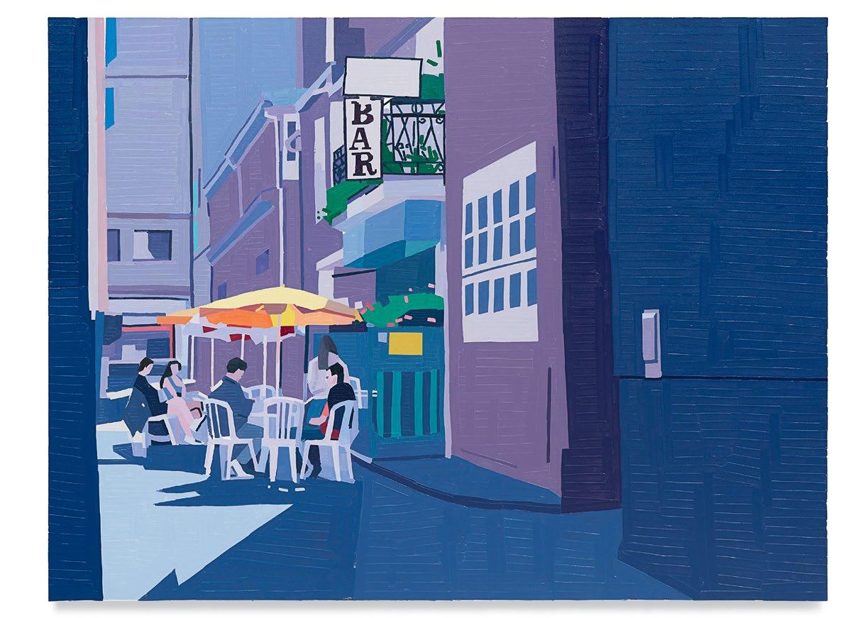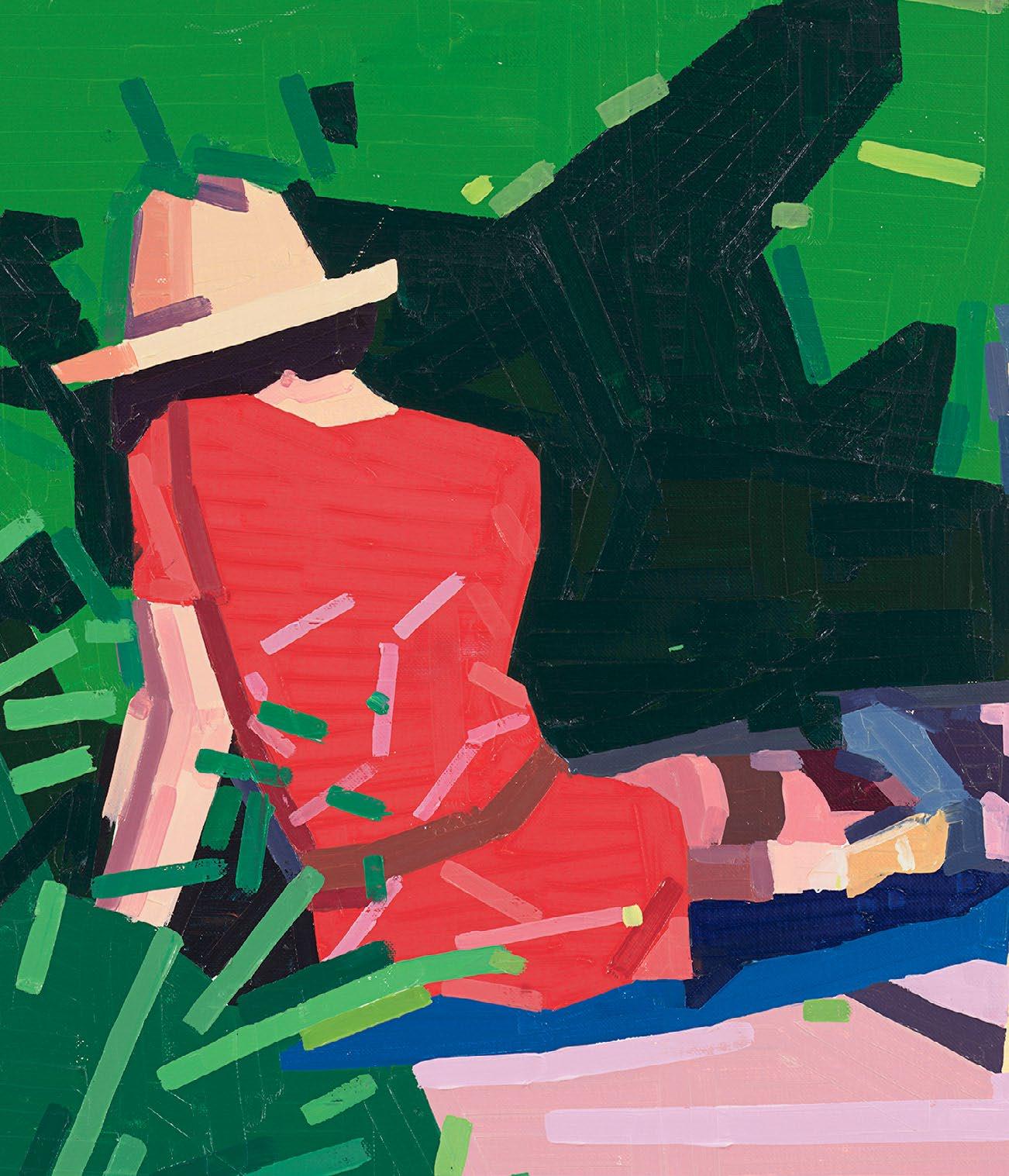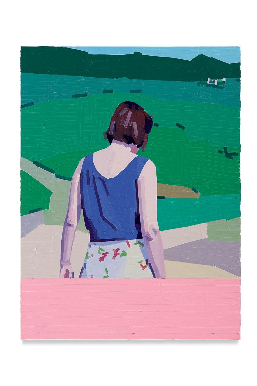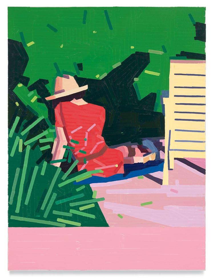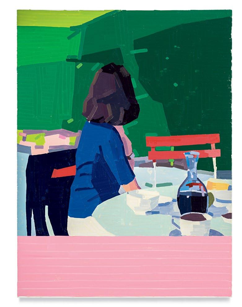 lighter more joyful mood, which is in sharp contrast to the woman’s somber gesture. Conversely, in Aurora and Mirabelle Outside (both 2021), the figures have their backs turned to the viewer; their visages are only a figment of our imagination. They look withdrawn, distant, emotionless, as if they’re just another object in the space. This refusal to interface with the audience draws the figures back into the picture plane, bringing the focus to the other elements in the paintings—the shrubbery, trees, wine glass, lounge chair—and also to the quality and dynamism of Yanai’s effortless brushstrokes and treatment of the surface of his paintings. We are left to wonder what these lonely bodies are thinking, what their stories are. But in the end, we get lost in the formal aspects of the work: its composition, colors, and brushstrokes.