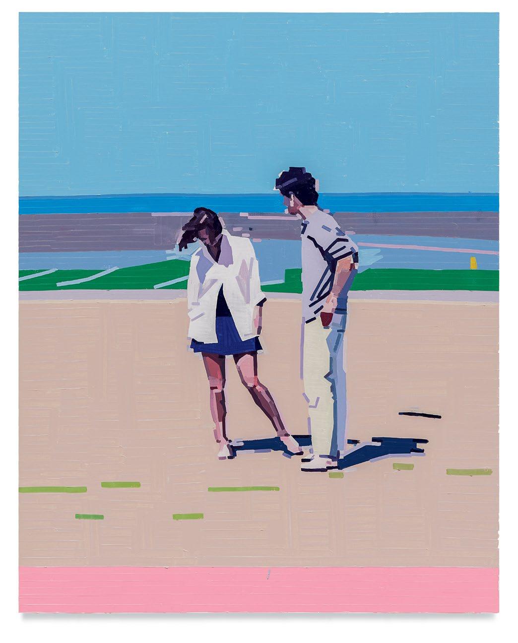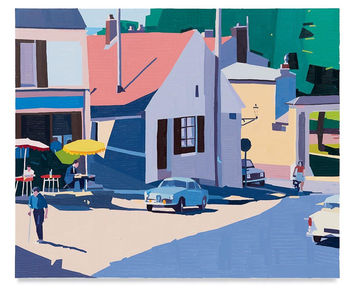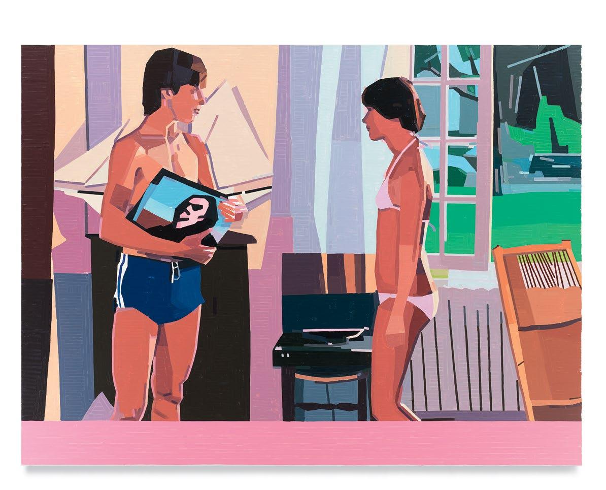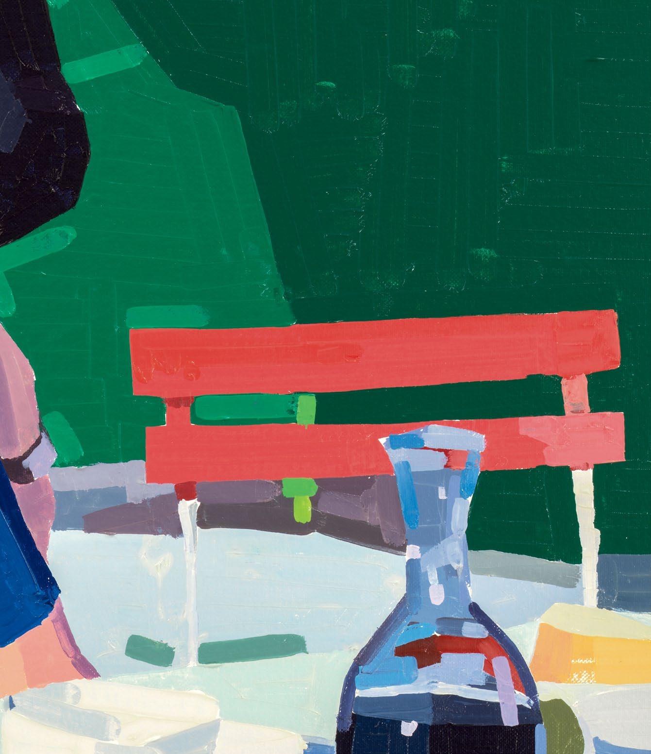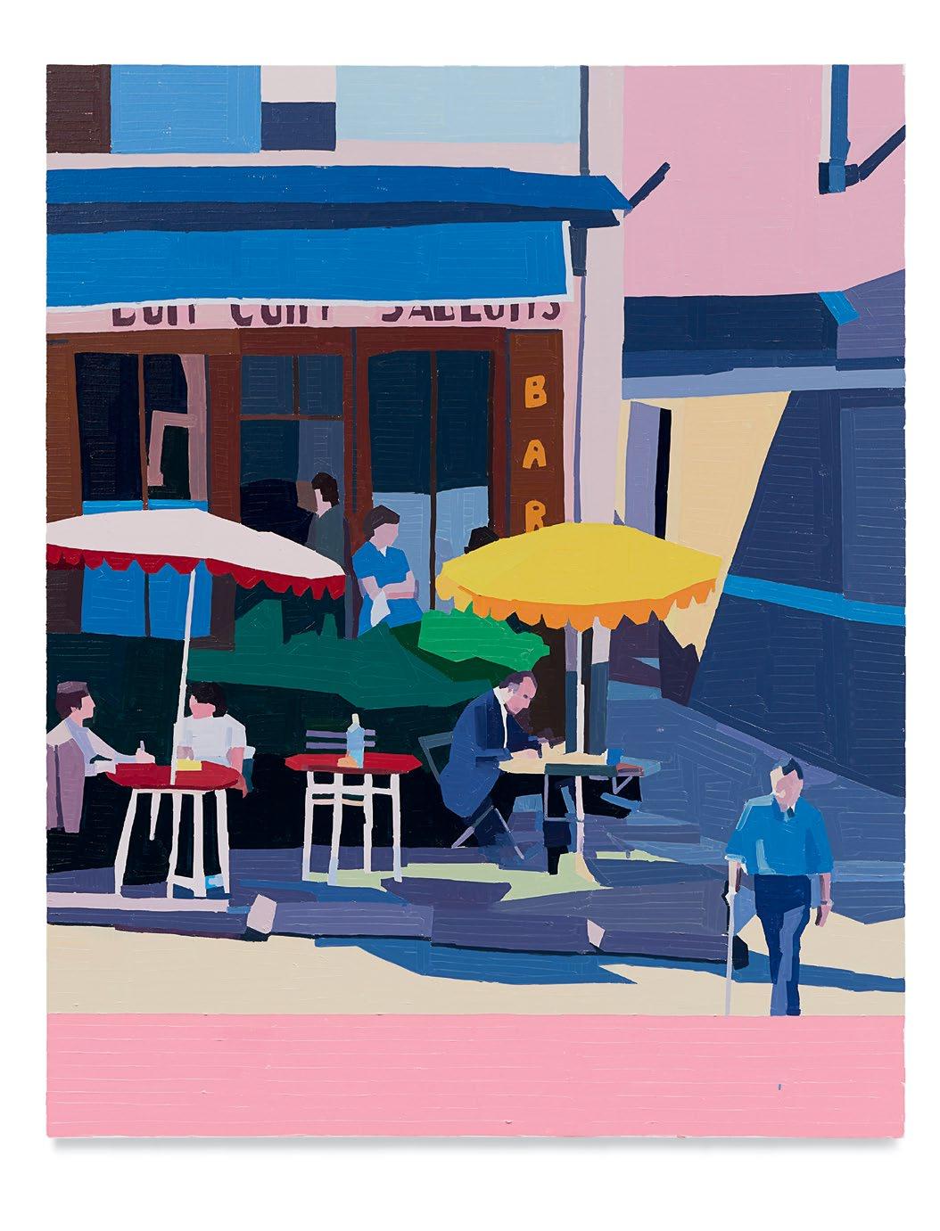 lighter more joyful mood, which is in sharp contrast to the woman’s somber gesture. Conversely, in Aurora and Mirabelle Outside (both 2021), the figures have their backs turned to the viewer; their visages are only a figment of our imagination. They look withdrawn, distant, emotionless, as if they’re just another object in the space. This refusal to interface with the audience draws the figures back into the picture plane, bringing the focus to the other elements in the paintings—the shrubbery, trees, wine glass, lounge chair—and also to the quality and dynamism of Yanai’s effortless brushstrokes and treatment of the surface of his paintings. We are left to wonder what these lonely bodies are thinking, what their stories are. But in the end, we get lost in the formal aspects of the work: its composition, colors, and brushstrokes.