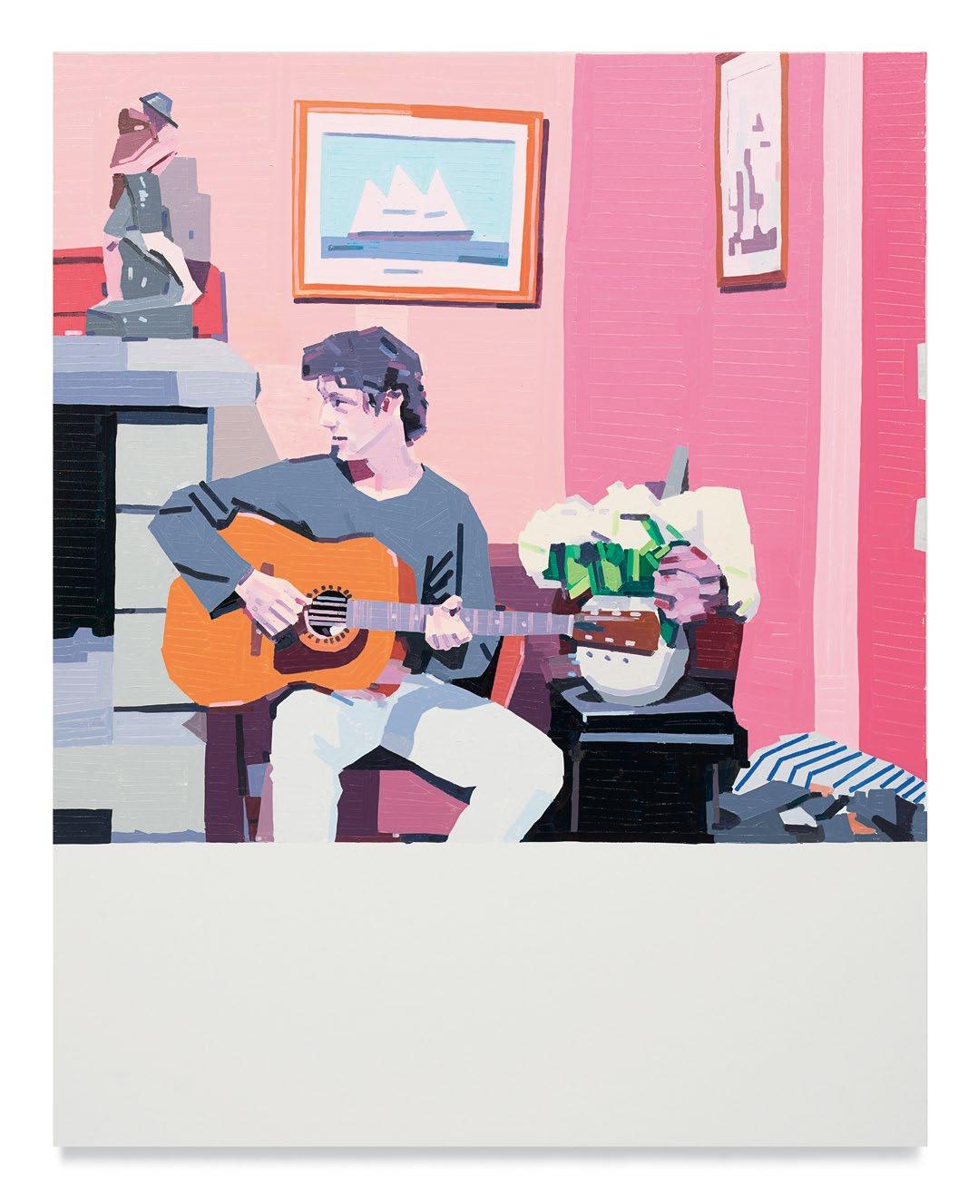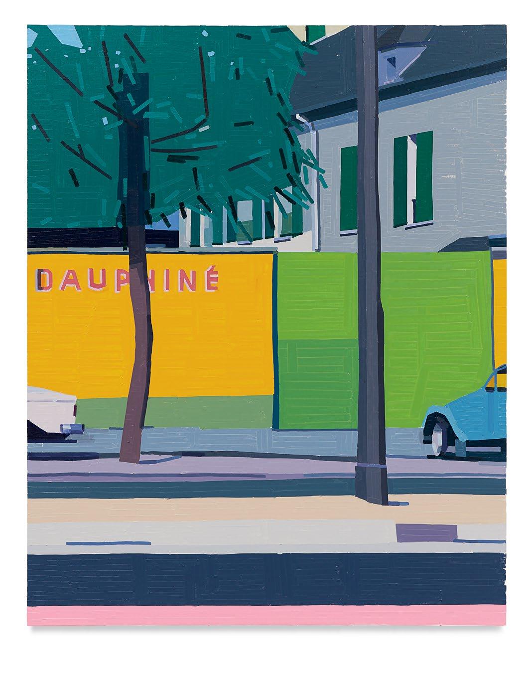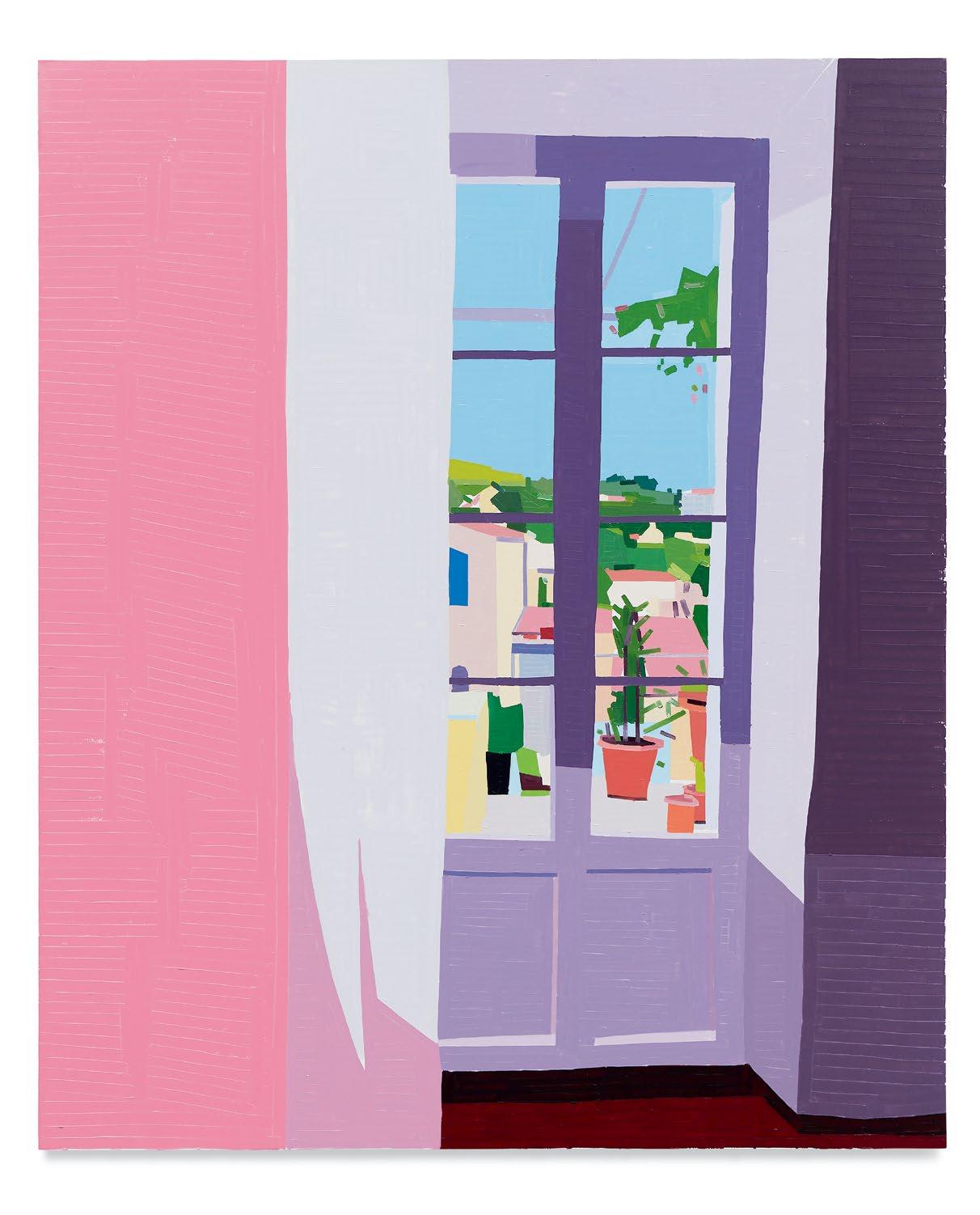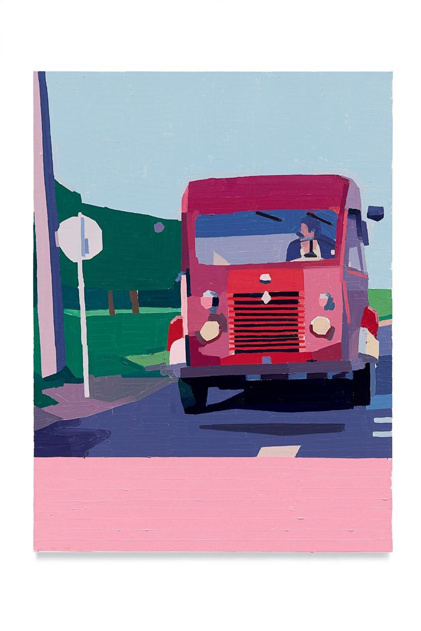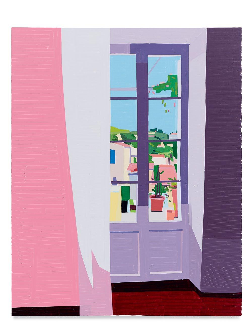 lighter more joyful mood, which is in sharp contrast to the woman’s somber gesture. Conversely, in Aurora and Mirabelle Outside (both 2021), the figures have their backs turned to the viewer; their visages are only a figment of our imagination. They look withdrawn, distant, emotionless, as if they’re just another object in the space. This refusal to interface with the audience draws the figures back into the picture plane, bringing the focus to the other elements in the paintings—the shrubbery, trees, wine glass, lounge chair—and also to the quality and dynamism of Yanai’s effortless brushstrokes and treatment of the surface of his paintings. We are left to wonder what these lonely bodies are thinking, what their stories are. But in the end, we get lost in the formal aspects of the work: its composition, colors, and brushstrokes.