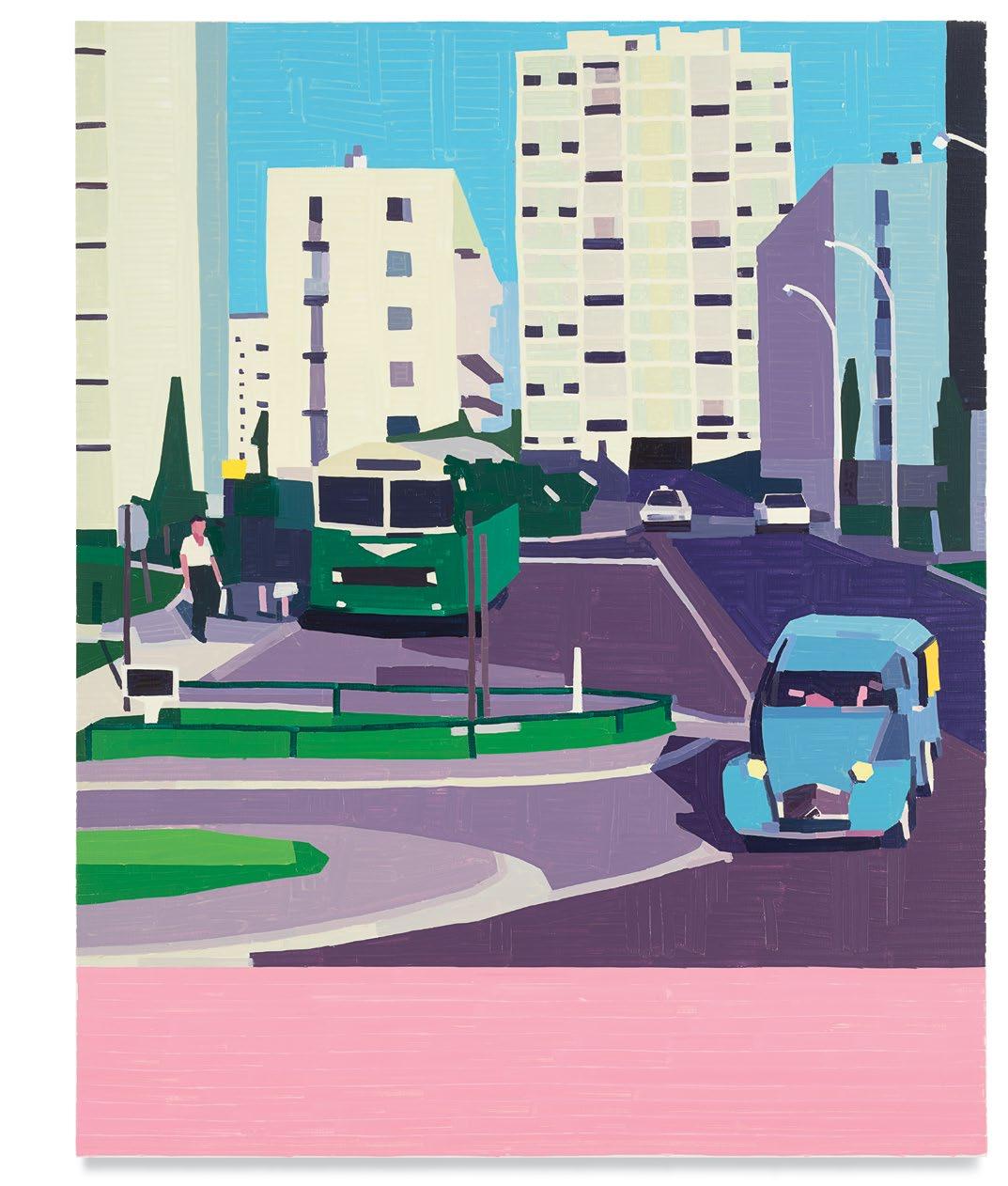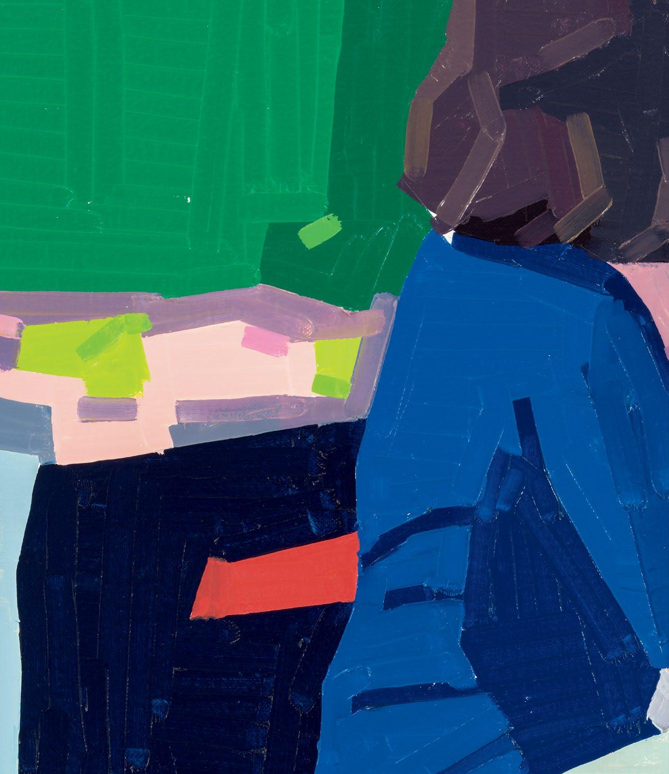 Beyond the allusions to David Hockney, Yanai’s virtuosity is also reminiscent of the Post-Impressionist painter Georges Seurat, and it additionally harkens back to Alma Thomas’s careful mark-making in her color field abstractions. The lozenge-style brushstrokes—oftentimes extending to long rectangular strips of paint—build upon each other to create beautiful, jagged images of time and space. The accumulation of these colorful streaks of pigment feels like a frenzied mess carefully arranged in perfect harmony—as if Yanai were building a house made of match sticks. There’s uncertainty, precarity to his tableaux. His marks do as much to tell a narrative as do his cast of characters. Together, they complement each other, helping us to find room and time to sit still and think about art, gesture, form, and life—to remove ourselves from the daily clatter, and from our screens.