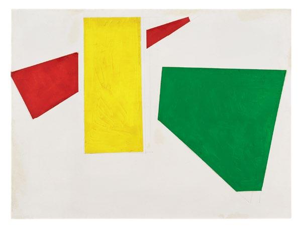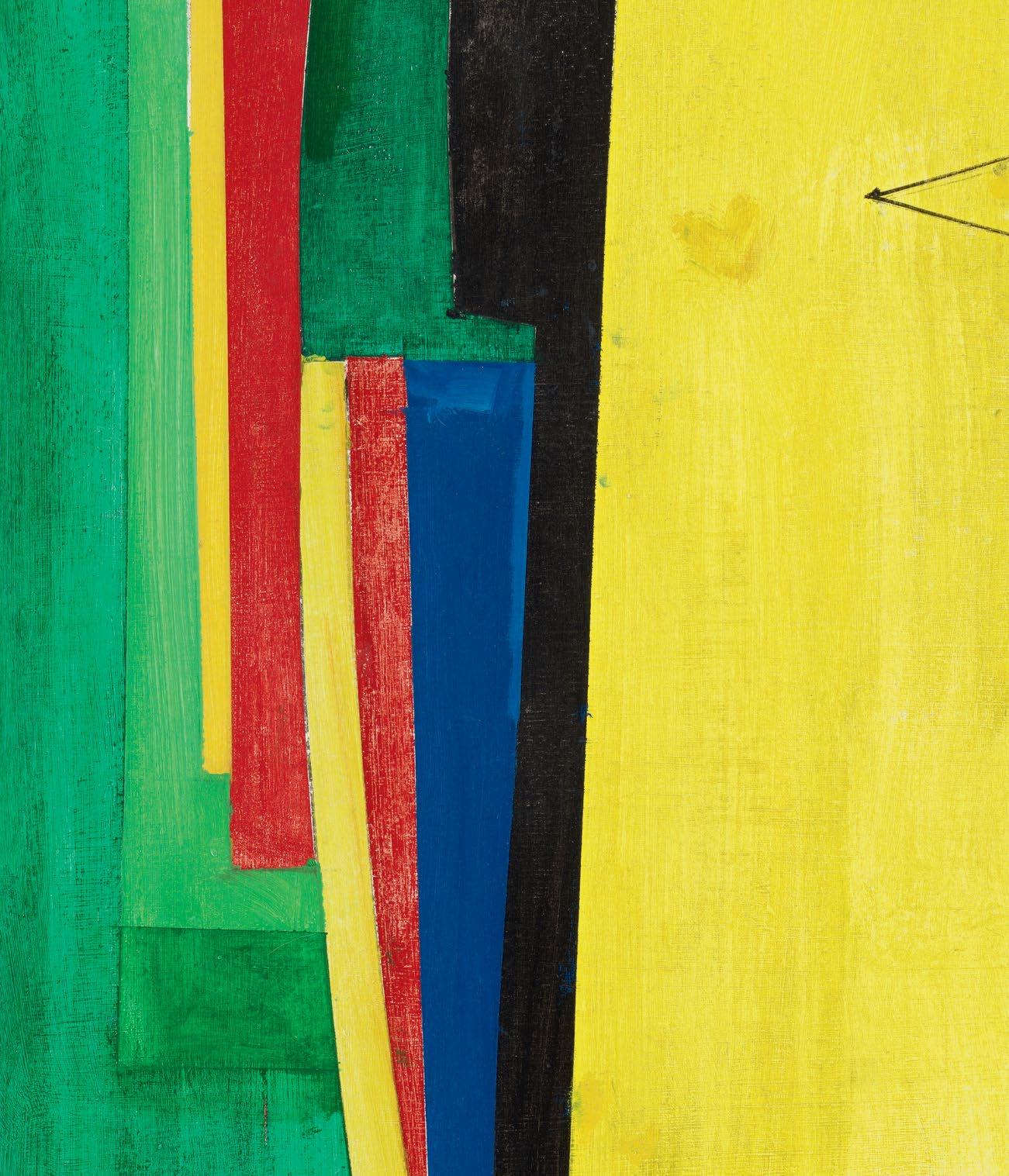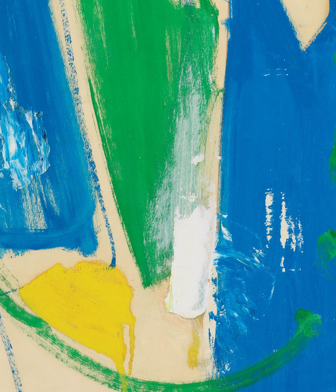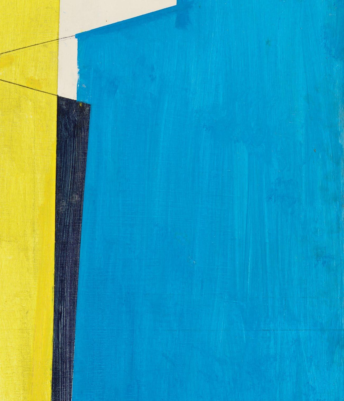 Layered, sharp azure blue and yellow geometric forms in Chimbote Mural Fragment of Part 1 [Study for Chimbote Mural], appear to self-referentially draw a ention to the flat surface of the work and the slick materiality of the board onto which Hofmann painted. In this way, he employed a quintessential modernist strategy in alerting the viewer to the materiality of the work itself while simultaneously alluding to the materiality’s illusionistic potential.