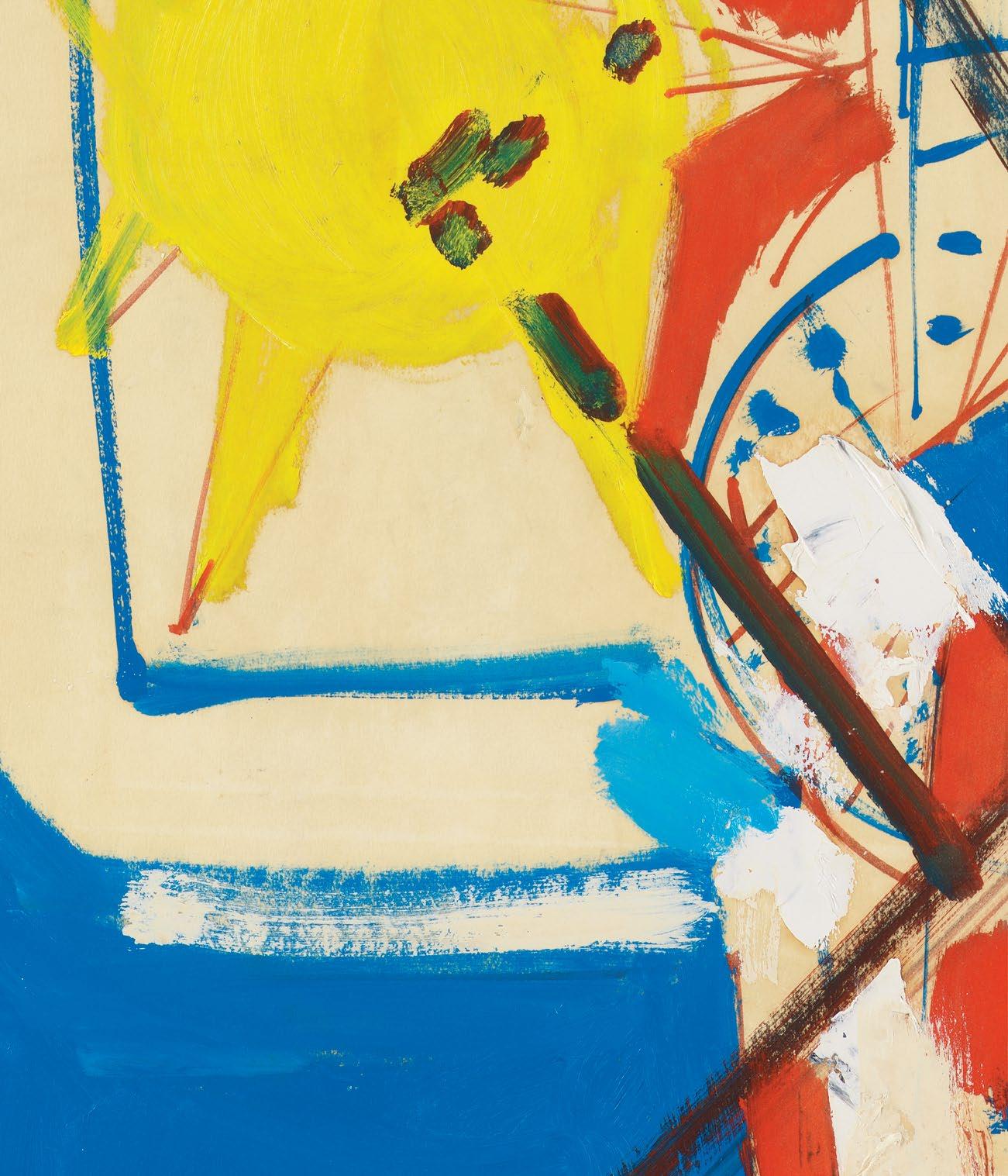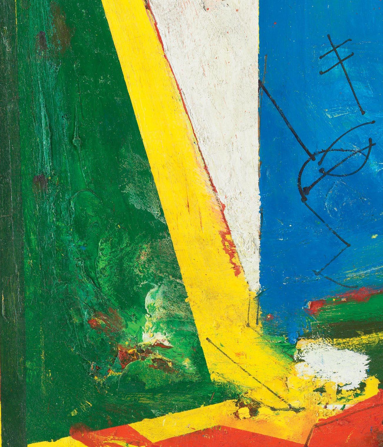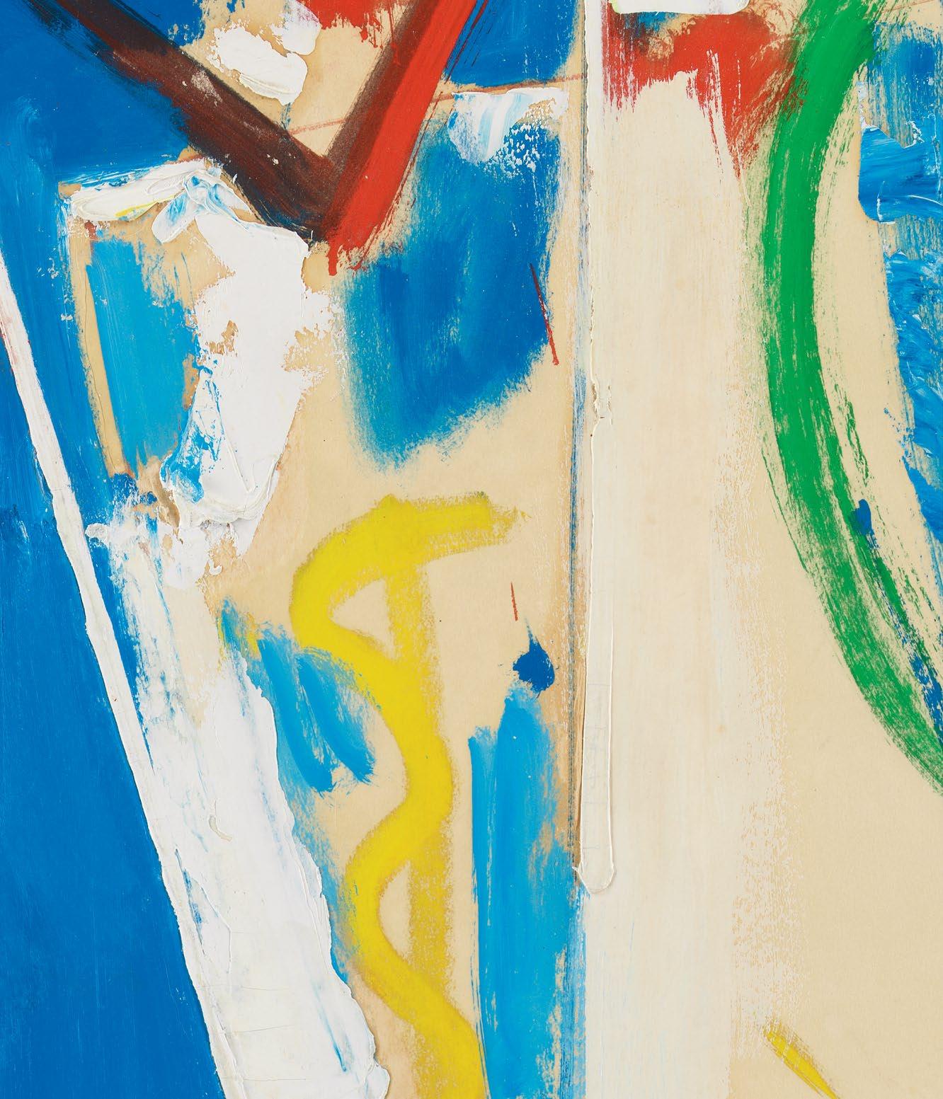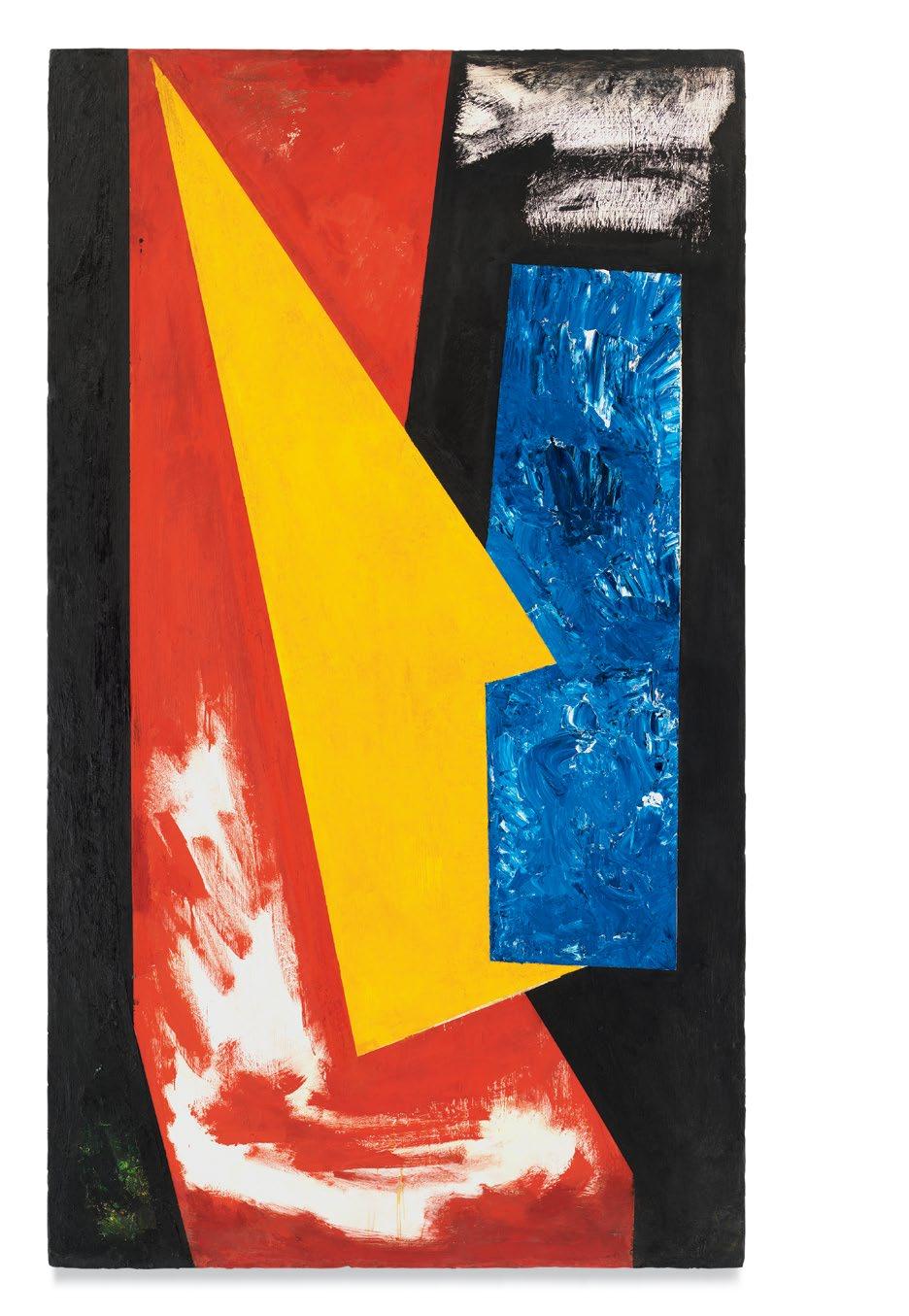 Layered, sharp azure blue and yellow geometric forms in Chimbote Mural Fragment of Part 1 [Study for Chimbote Mural], appear to self-referentially draw a ention to the flat surface of the work and the slick materiality of the board onto which Hofmann painted. In this way, he employed a quintessential modernist strategy in alerting the viewer to the materiality of the work itself while simultaneously alluding to the materiality’s illusionistic potential.