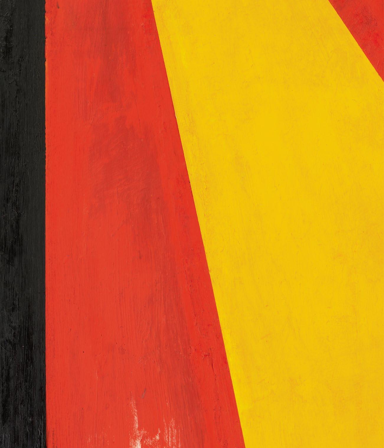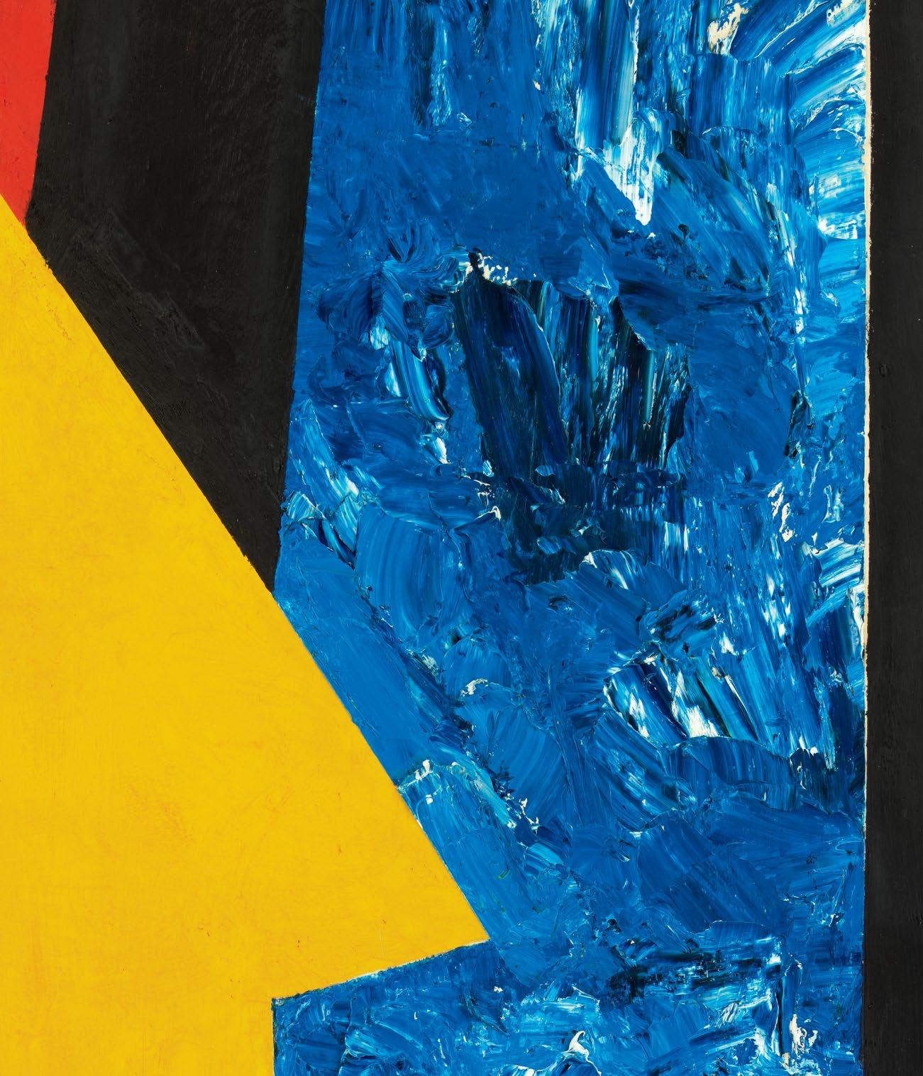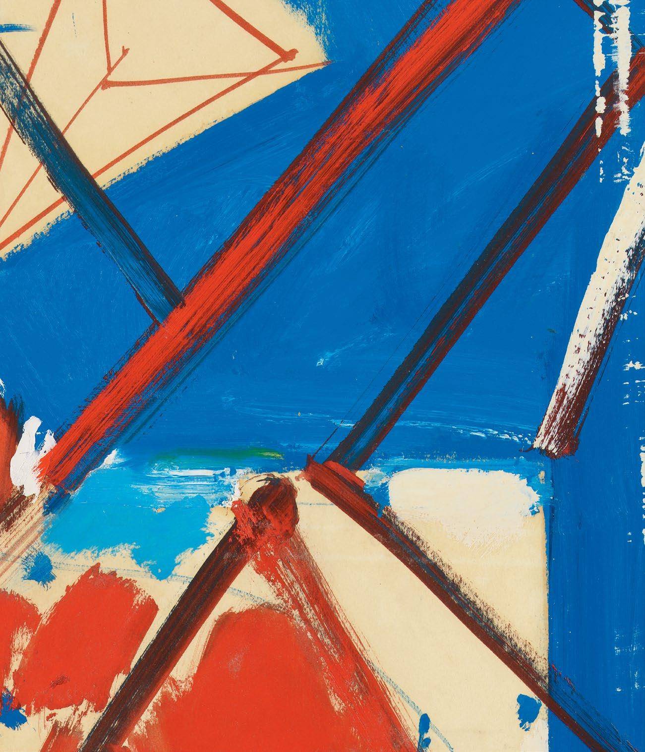 In Chimbote Mural (Fragment of Part 1), Chimbote Red Yellow Blue Black [Study for Chimbote Mural], the pictorial surface is itself constructed through a fractured, geometric form. A shard of saturated yellow intersects with painterly crimson, blue, and black. Hofmann conveys his awareness of the architectural site for which these works were intended, but he also evokes the fragmented and fractured mode of seeing the works that the viewers would have experienced from multiple viewpoints within the architectural site of Chimbote.