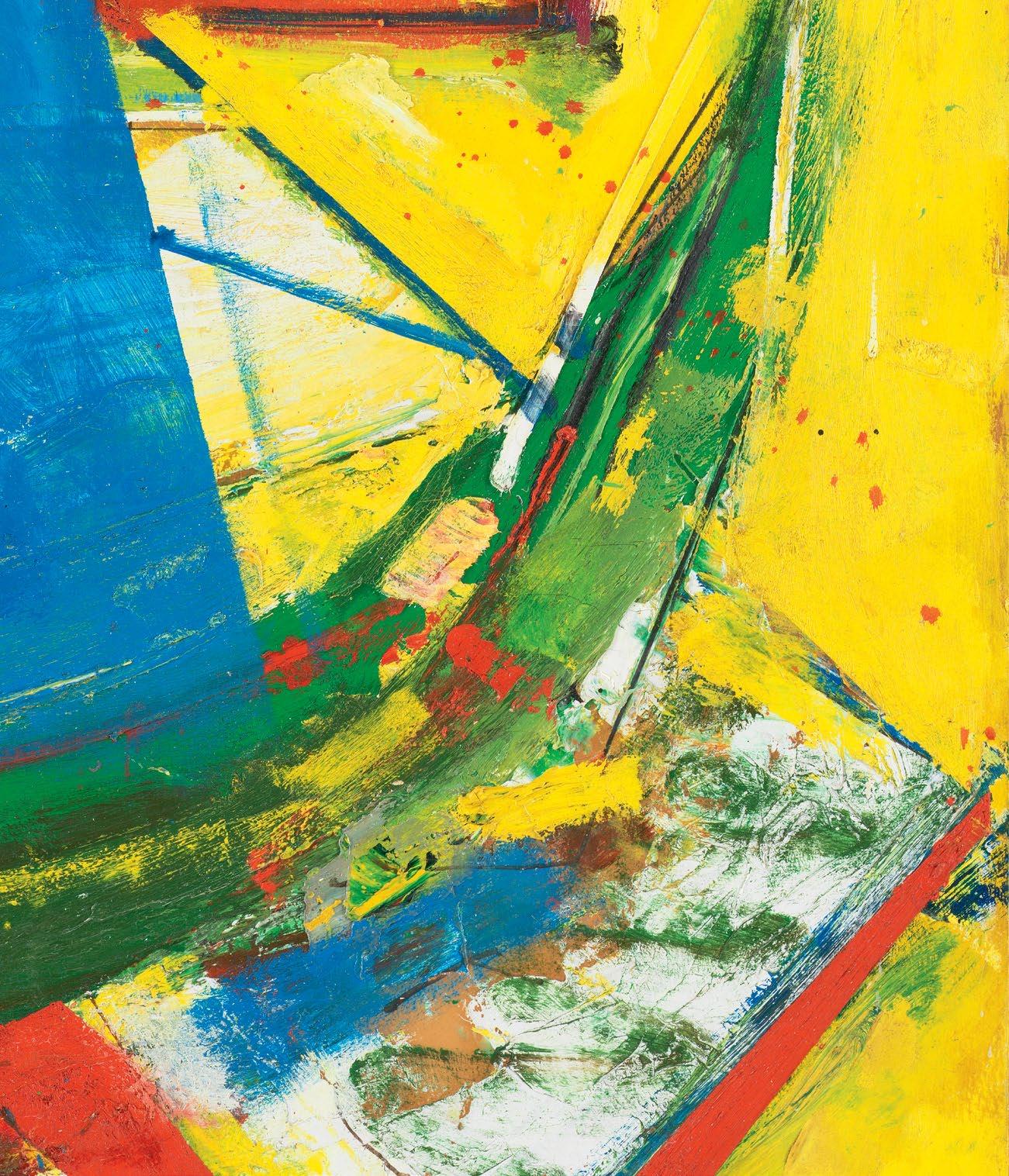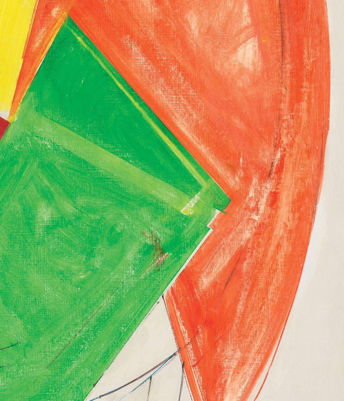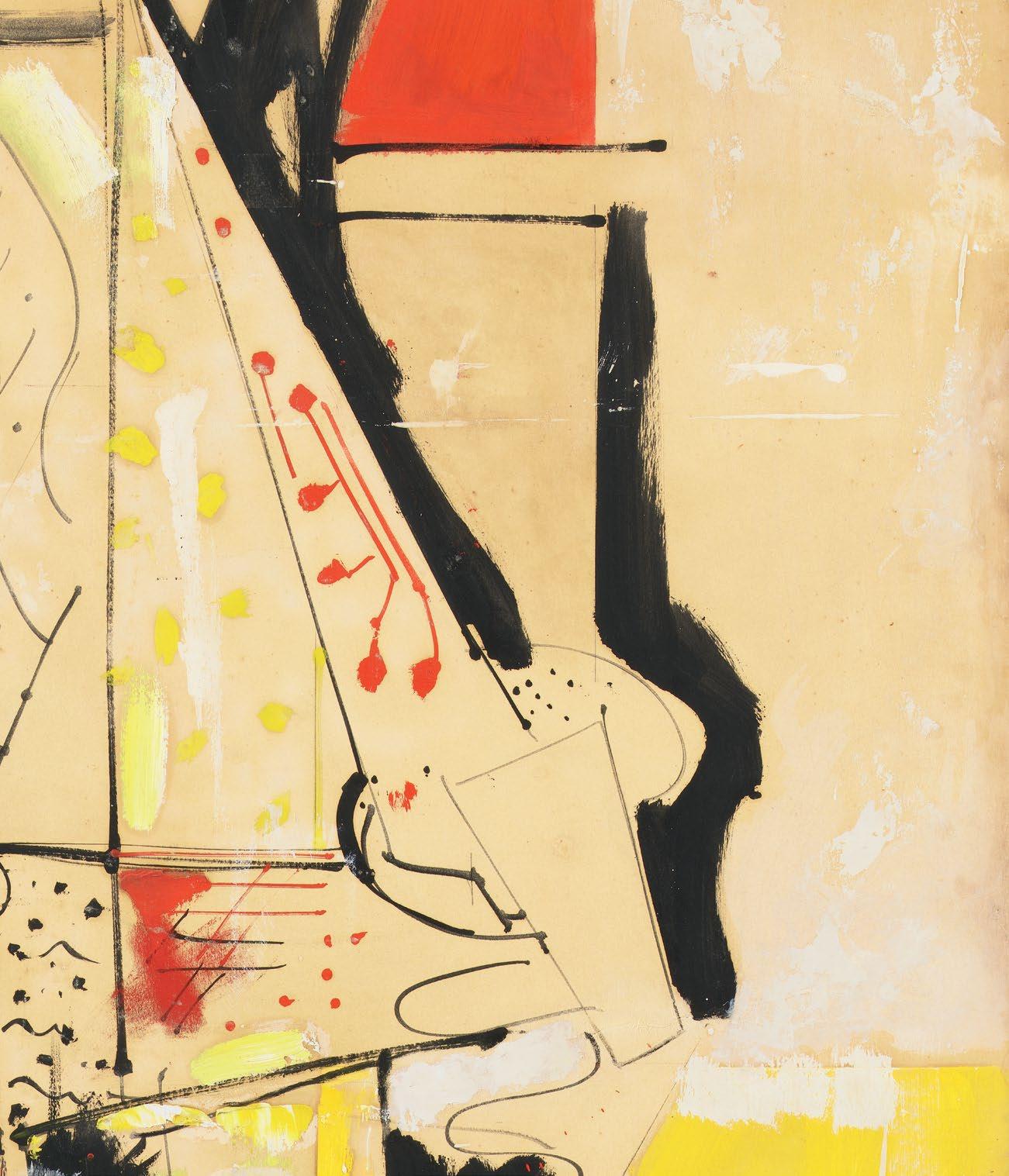 In Chimbote Mural (Fragment of Part 1), Chimbote Red Yellow Blue Black [Study for Chimbote Mural], the pictorial surface is itself constructed through a fractured, geometric form. A shard of saturated yellow intersects with painterly crimson, blue, and black. Hofmann conveys his awareness of the architectural site for which these works were intended, but he also evokes the fragmented and fractured mode of seeing the works that the viewers would have experienced from multiple viewpoints within the architectural site of Chimbote.