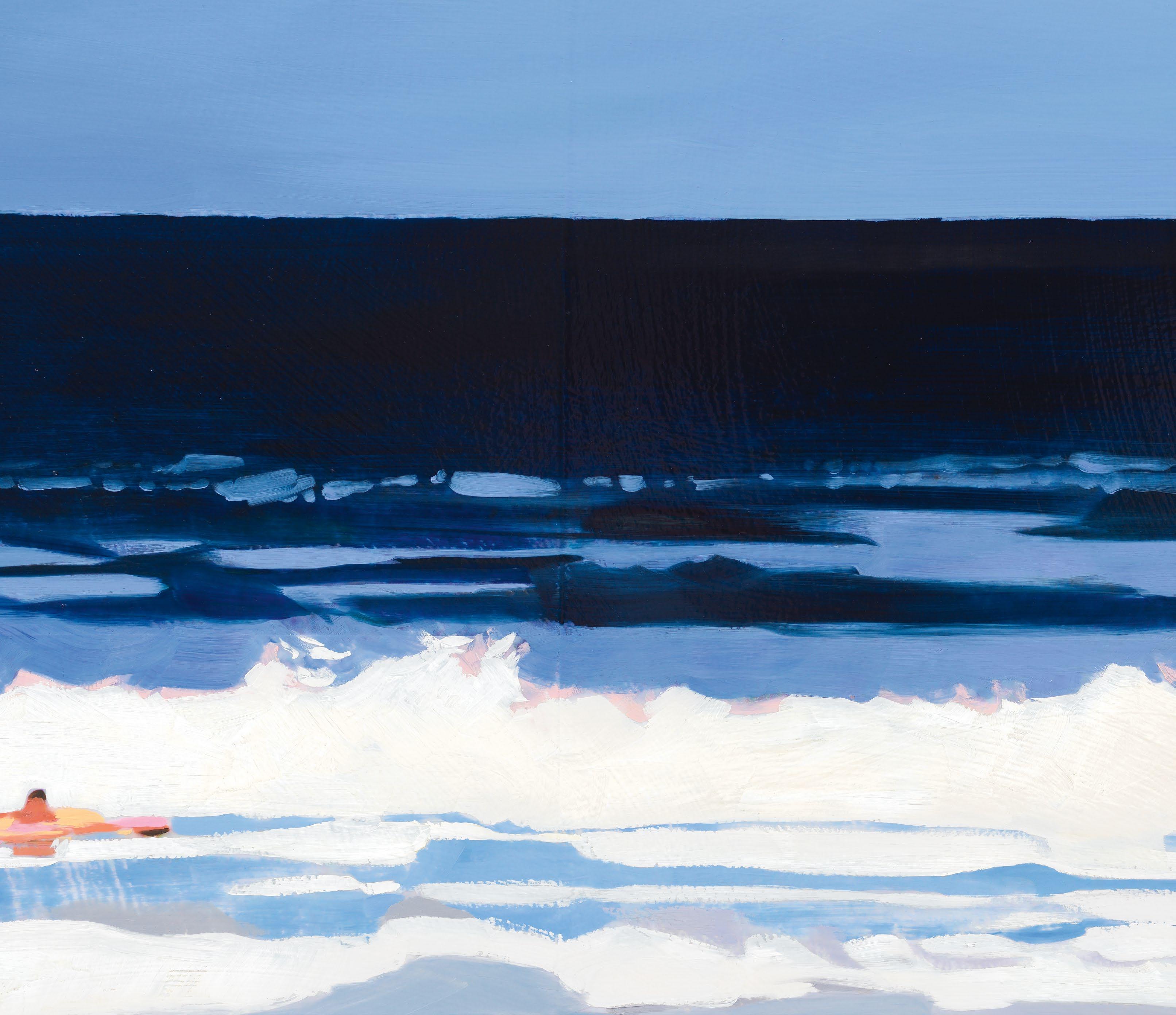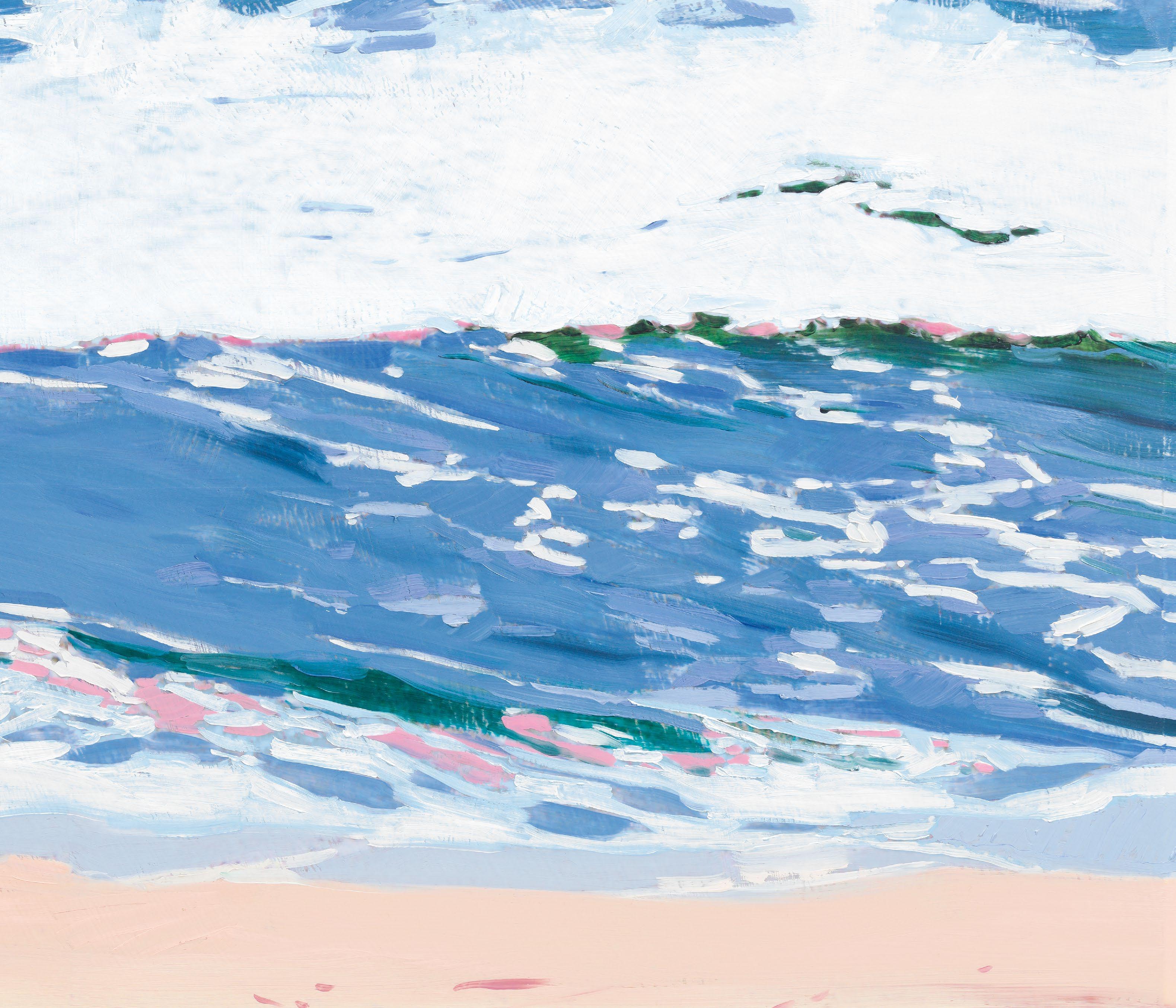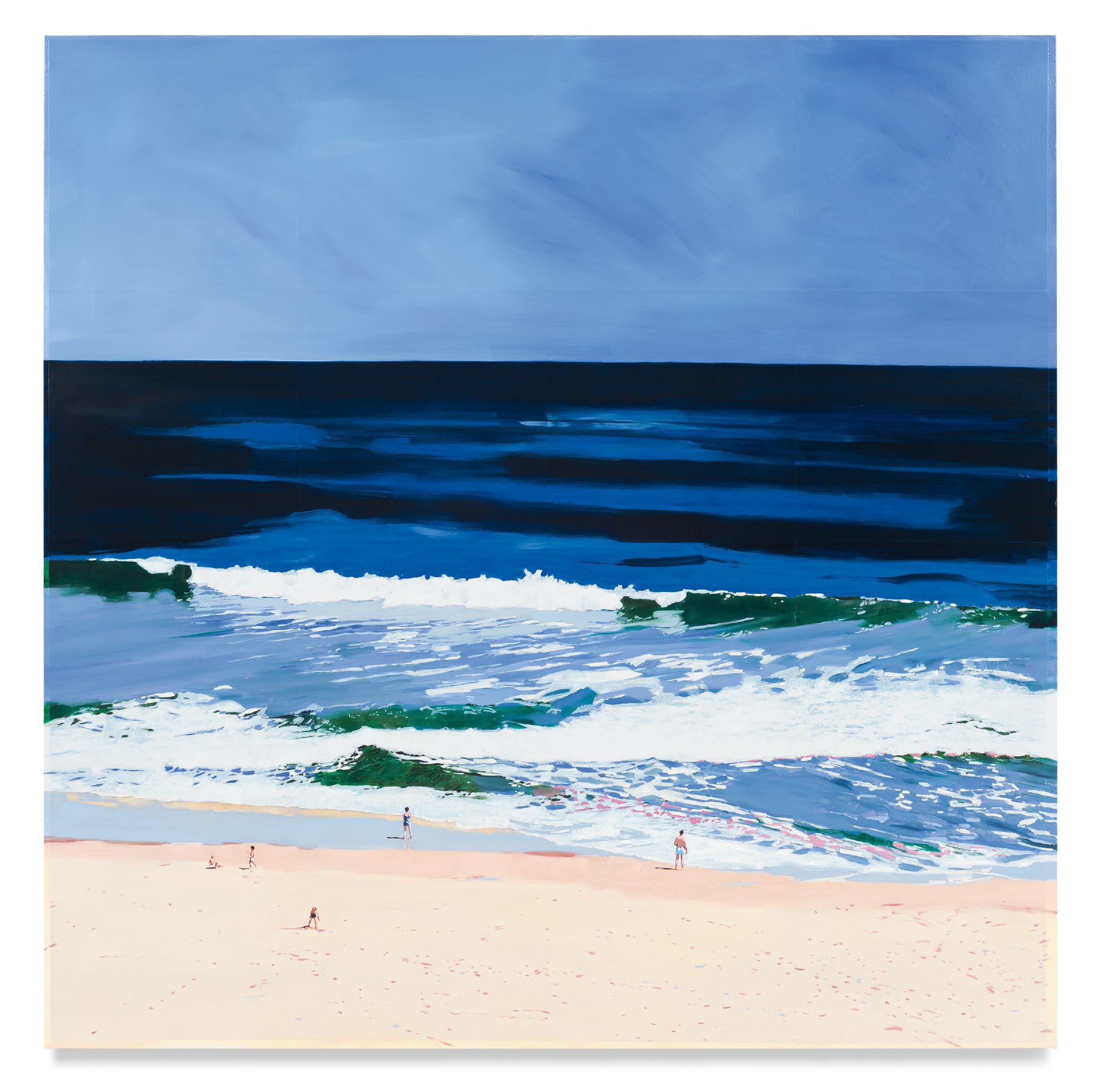 Greenfield-Sanders’s latest paintings of beaches, including Silver Beach (Blue), Pink Wave (Detail), Blue Wave (Detail), Aerial Beach, and Bathers, illuminate the variety of approaches that inform her art. She carefully adjusts the vantage points for viewers. We do not consistently look straight ahead. Unsurprisingly, given its title, Aerial Beach presents a bird’s eye view of the scene below. From a great height, we look down on the bathers and the ocean. (If the figures were not there, we might not realize how high up we are made to feel.) Then, there are times when GreenfieldSanders puts us so close to the ocean, as in Blue Wave (Detail) or Pink Wave (Detail), that we can practically feel the tumultuous, roaring water splashing against our faces.