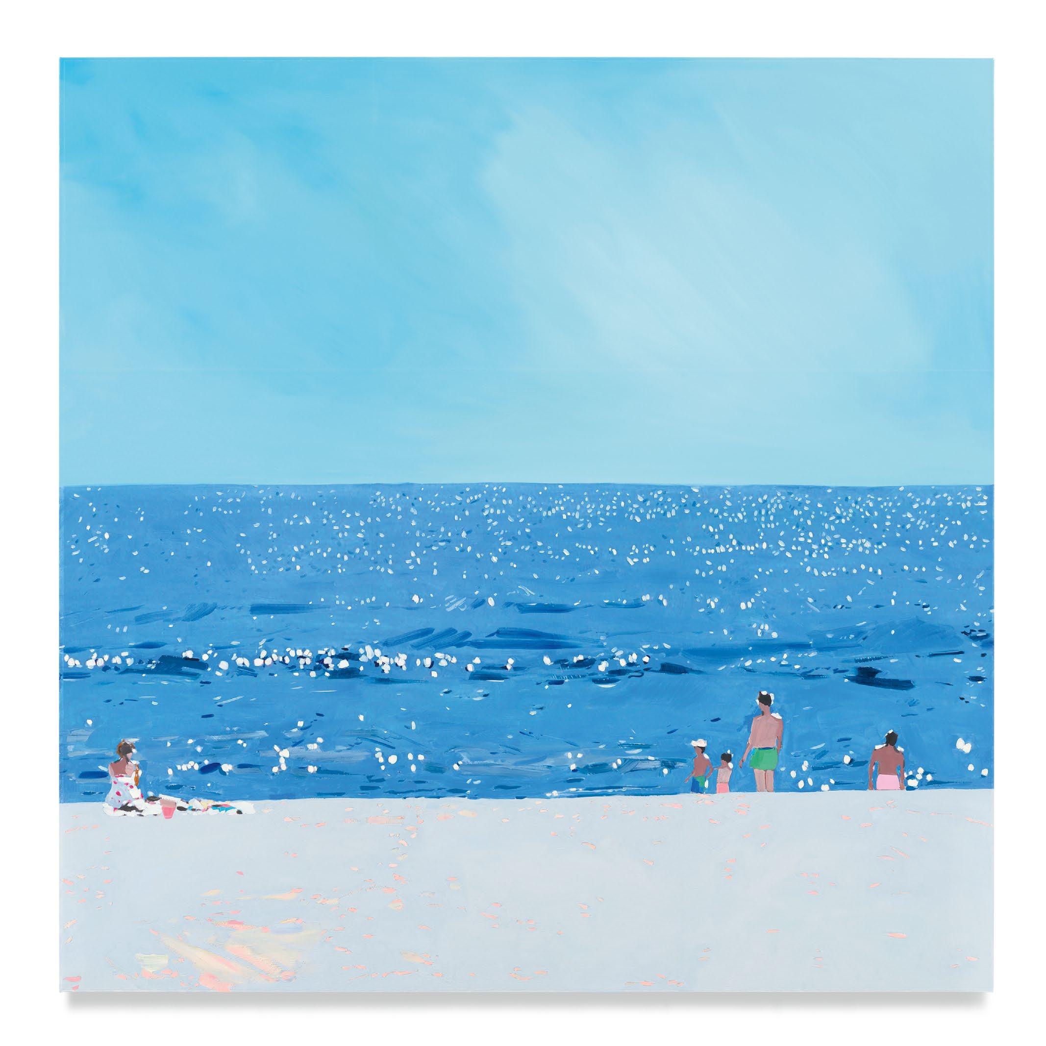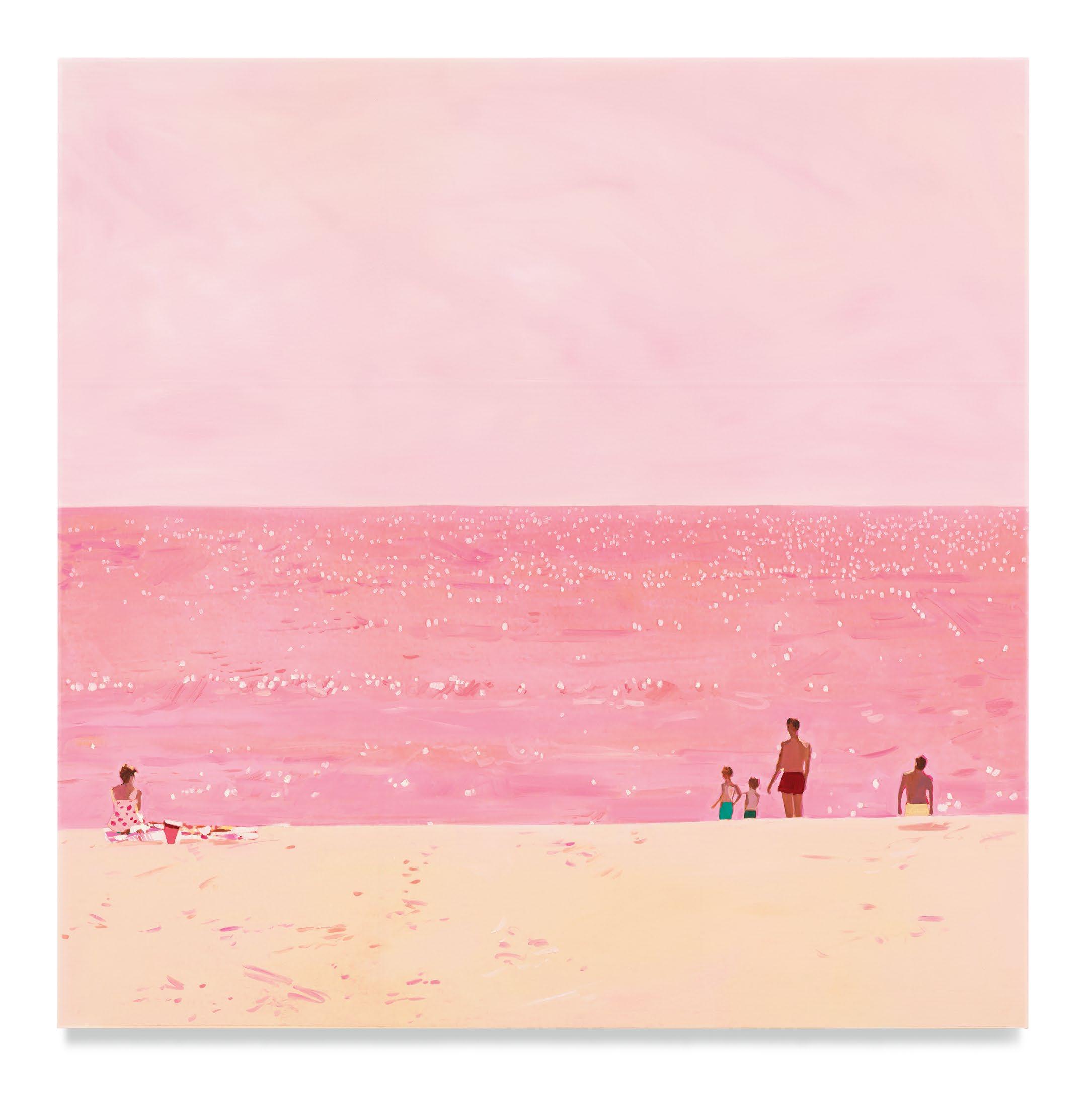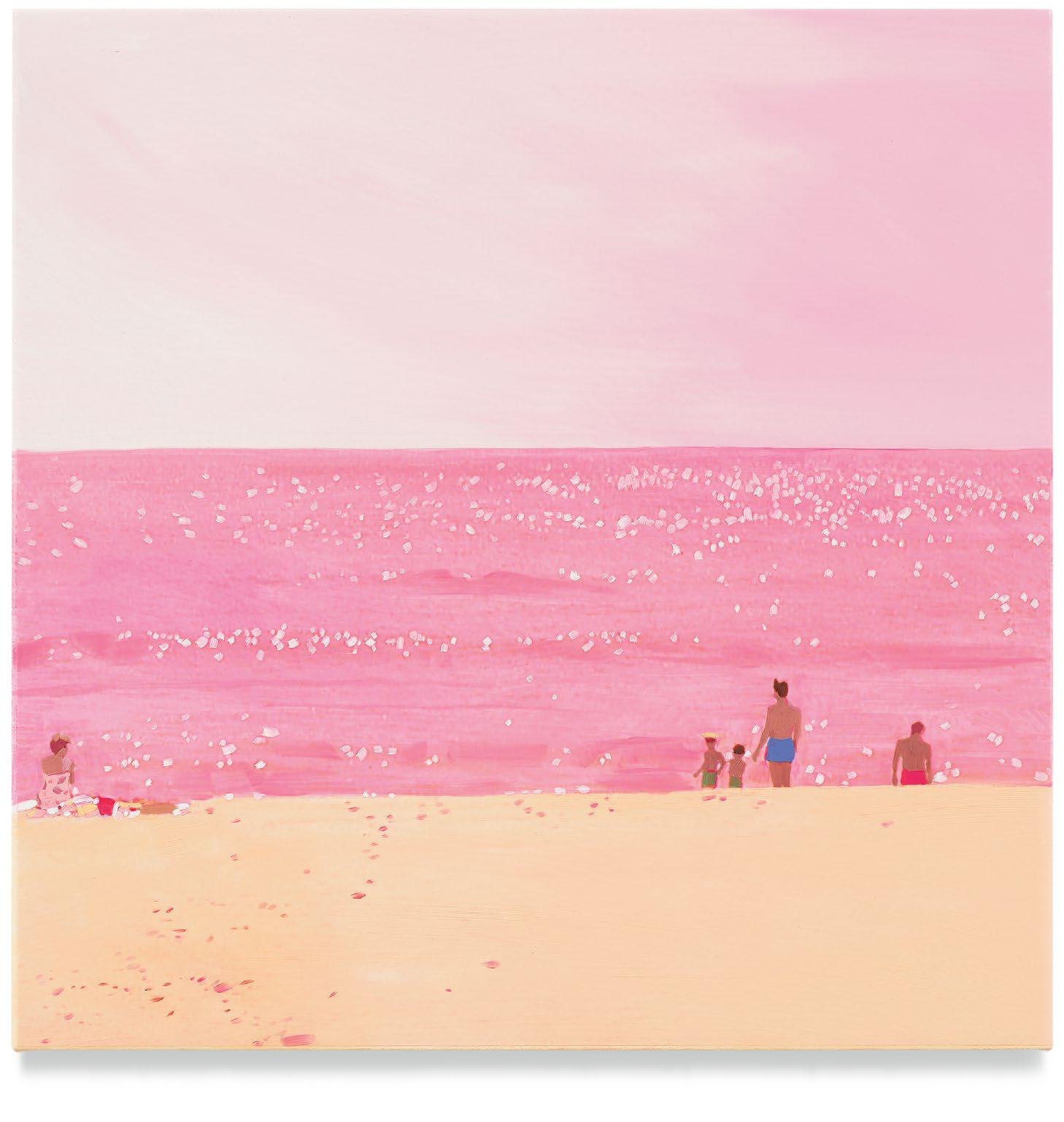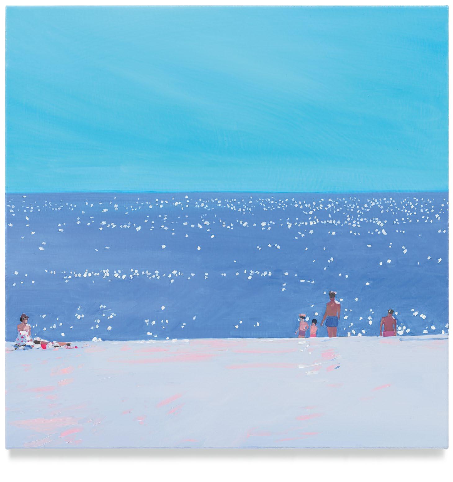 She also takes into account how she situates her bathers. They don’t face us. They are not looking at the camera and saying, “Cheese.” With their backs turned toward us, we’re gazing at what they are regarding. There is a term for these beachcombers: They are “Rückenfiguren,” which we are used to seeing in, say, paintings by Caspar David Friedrich, the German Romantic artist. There are not a lot of details to distract us. You won’t find product placements, as you would in a photorealist picture from the 1970s. Nor, for that matter, are we overly conscious of the types of bathing suits these figures wear. This allows us to identify even more with the scenes GreenfieldSanders paints.