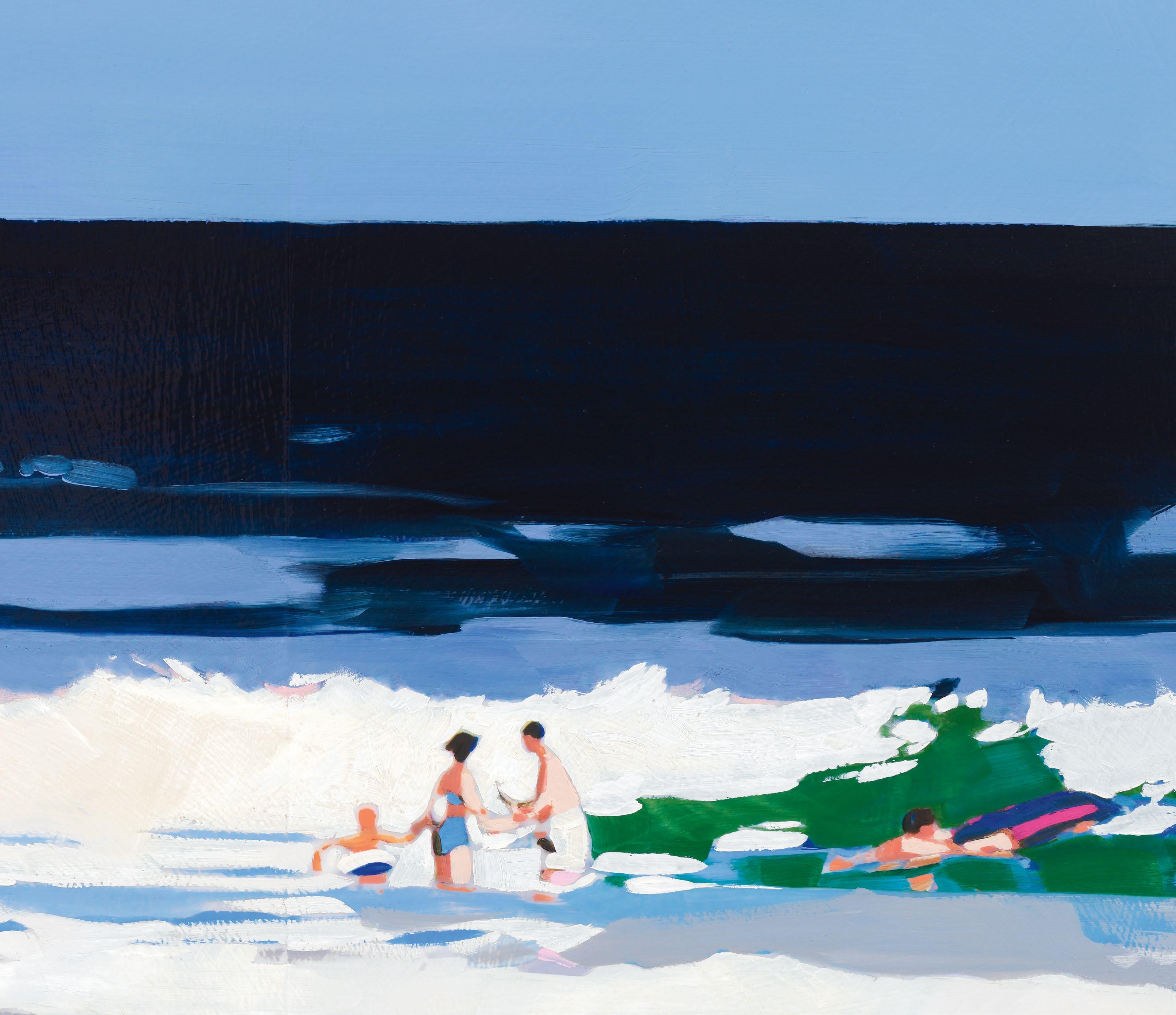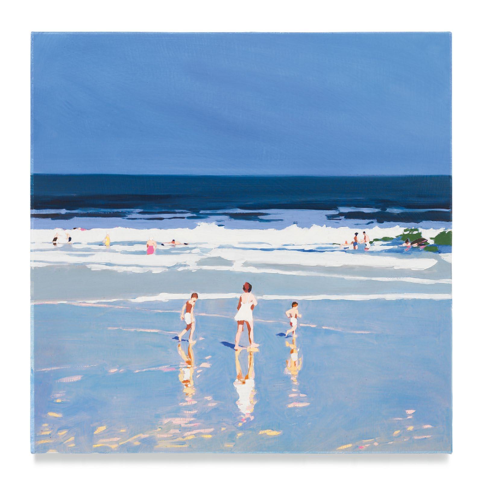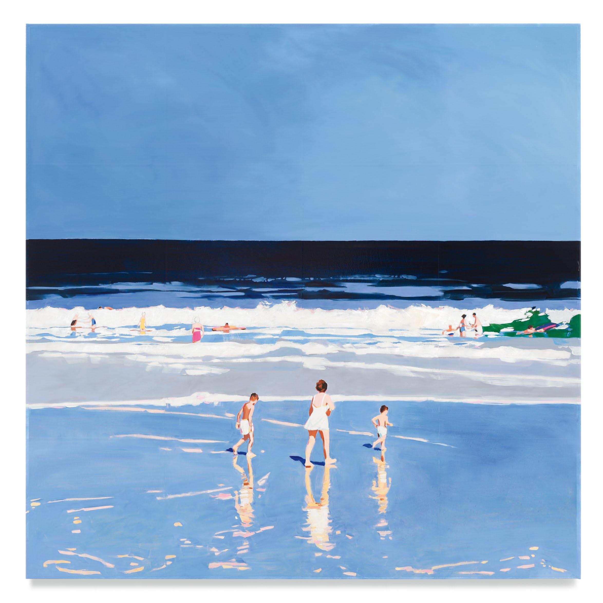 She also takes into account how she situates her bathers. They don’t face us. They are not looking at the camera and saying, “Cheese.” With their backs turned toward us, we’re gazing at what they are regarding. There is a term for these beachcombers: They are “Rückenfiguren,” which we are used to seeing in, say, paintings by Caspar David Friedrich, the German Romantic artist. There are not a lot of details to distract us. You won’t find product placements, as you would in a photorealist picture from the 1970s. Nor, for that matter, are we overly conscious of the types of bathing suits these figures wear. This allows us to identify even more with the scenes GreenfieldSanders paints.