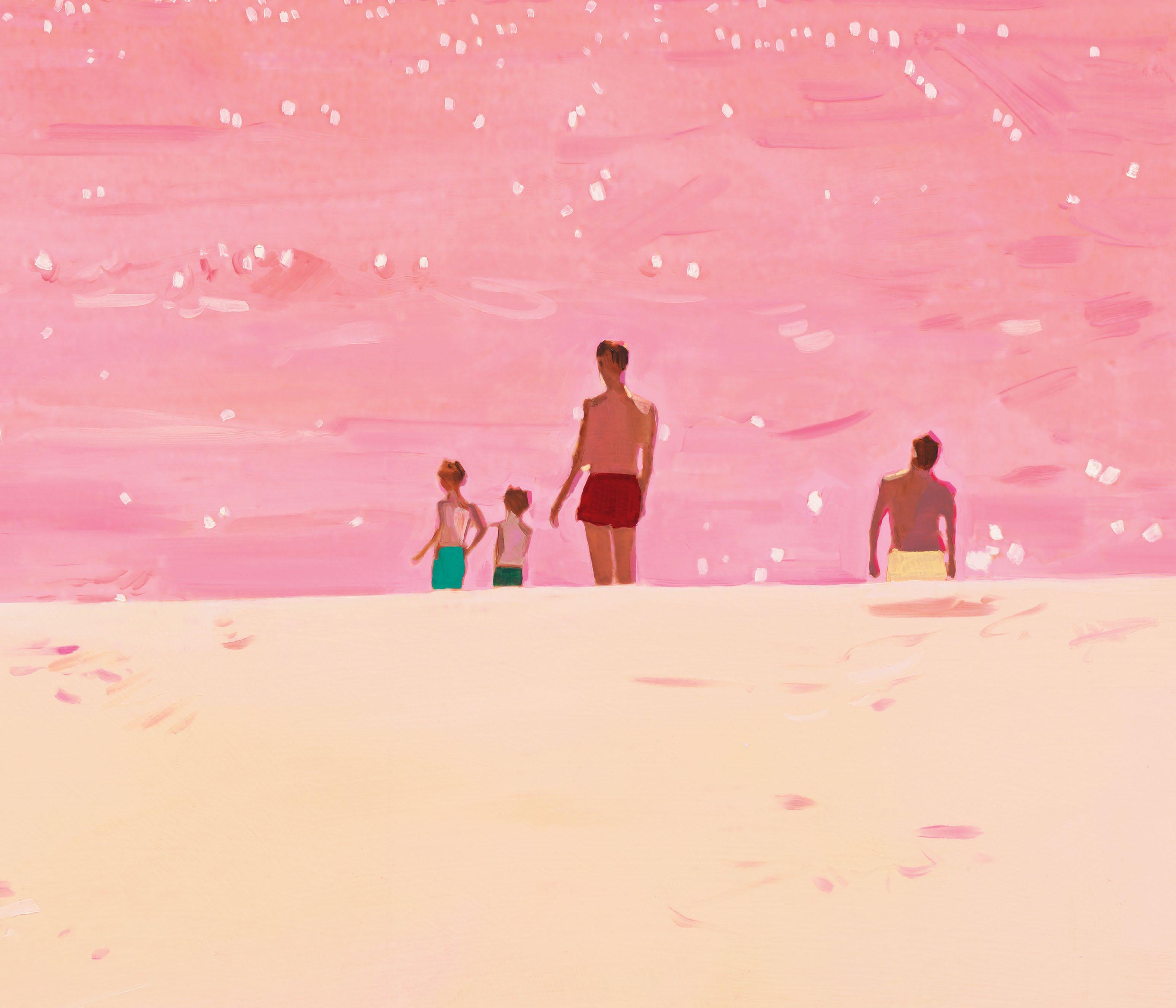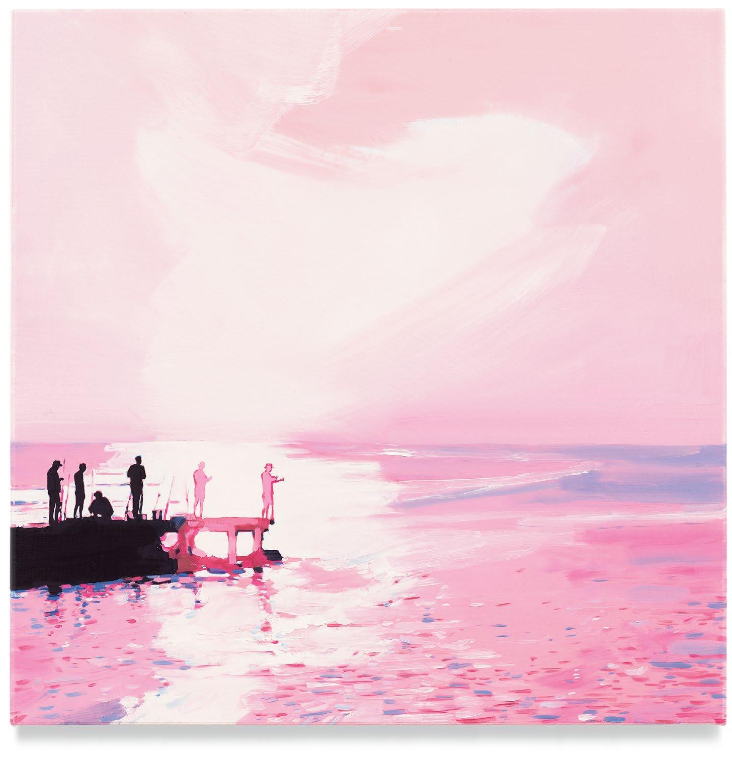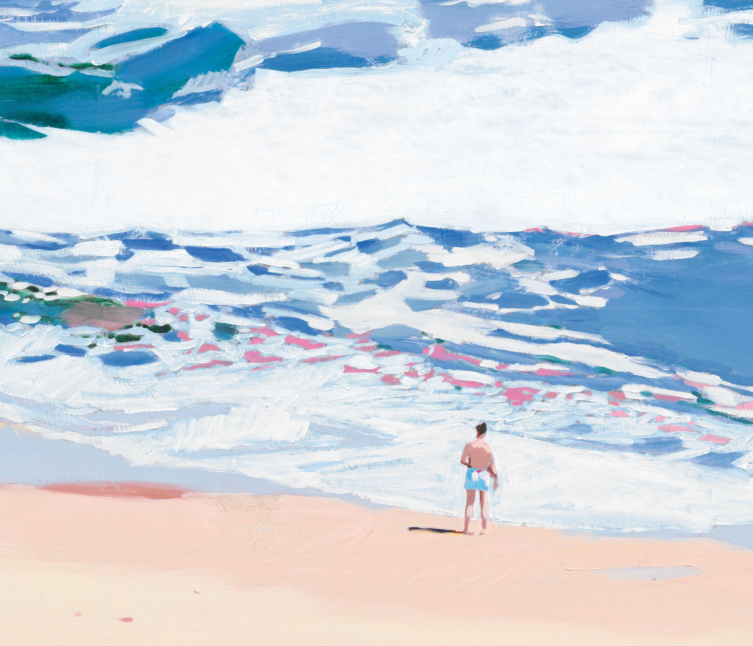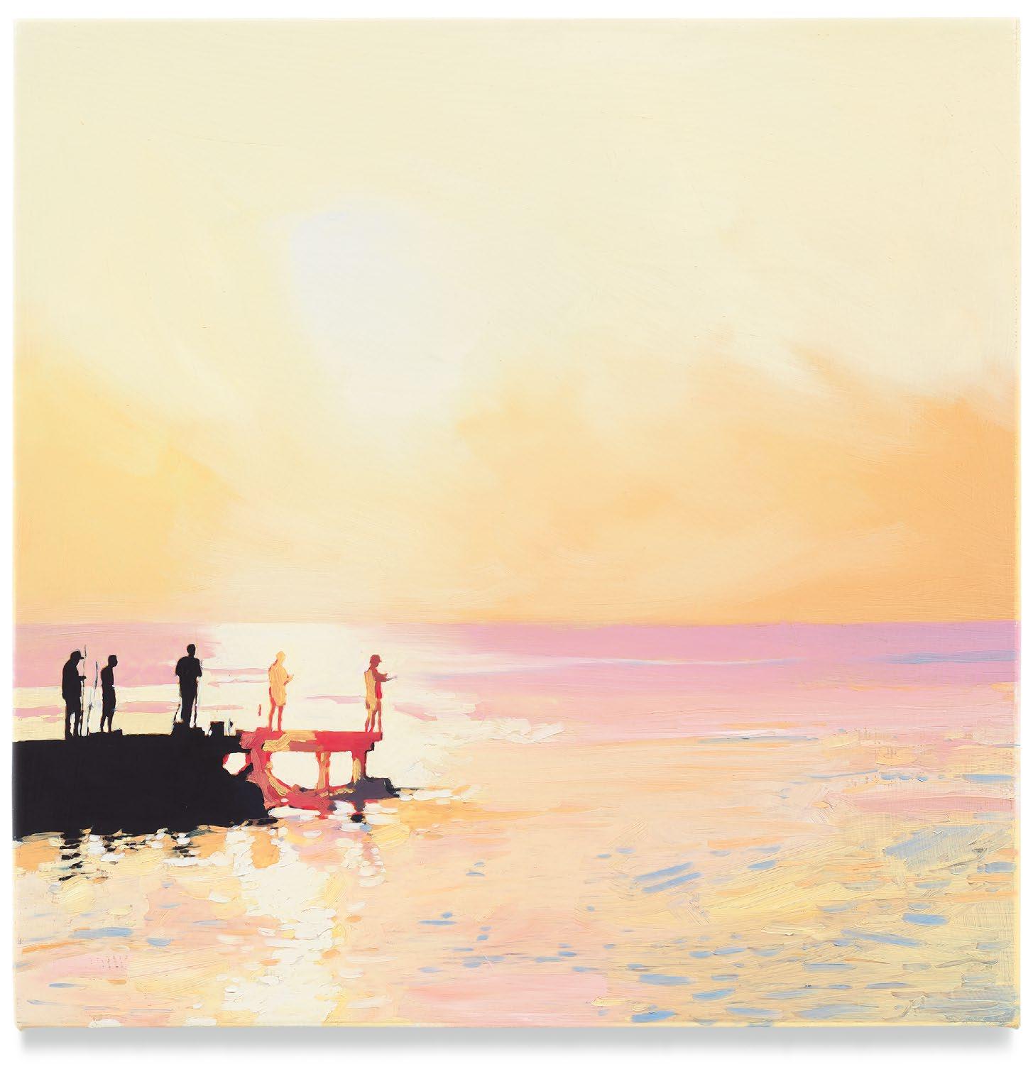 She also takes into account how she situates her bathers. They don’t face us. They are not looking at the camera and saying, “Cheese.” With their backs turned toward us, we’re gazing at what they are regarding. There is a term for these beachcombers: They are “Rückenfiguren,” which we are used to seeing in, say, paintings by Caspar David Friedrich, the German Romantic artist. There are not a lot of details to distract us. You won’t find product placements, as you would in a photorealist picture from the 1970s. Nor, for that matter, are we overly conscious of the types of bathing suits these figures wear. This allows us to identify even more with the scenes GreenfieldSanders paints.