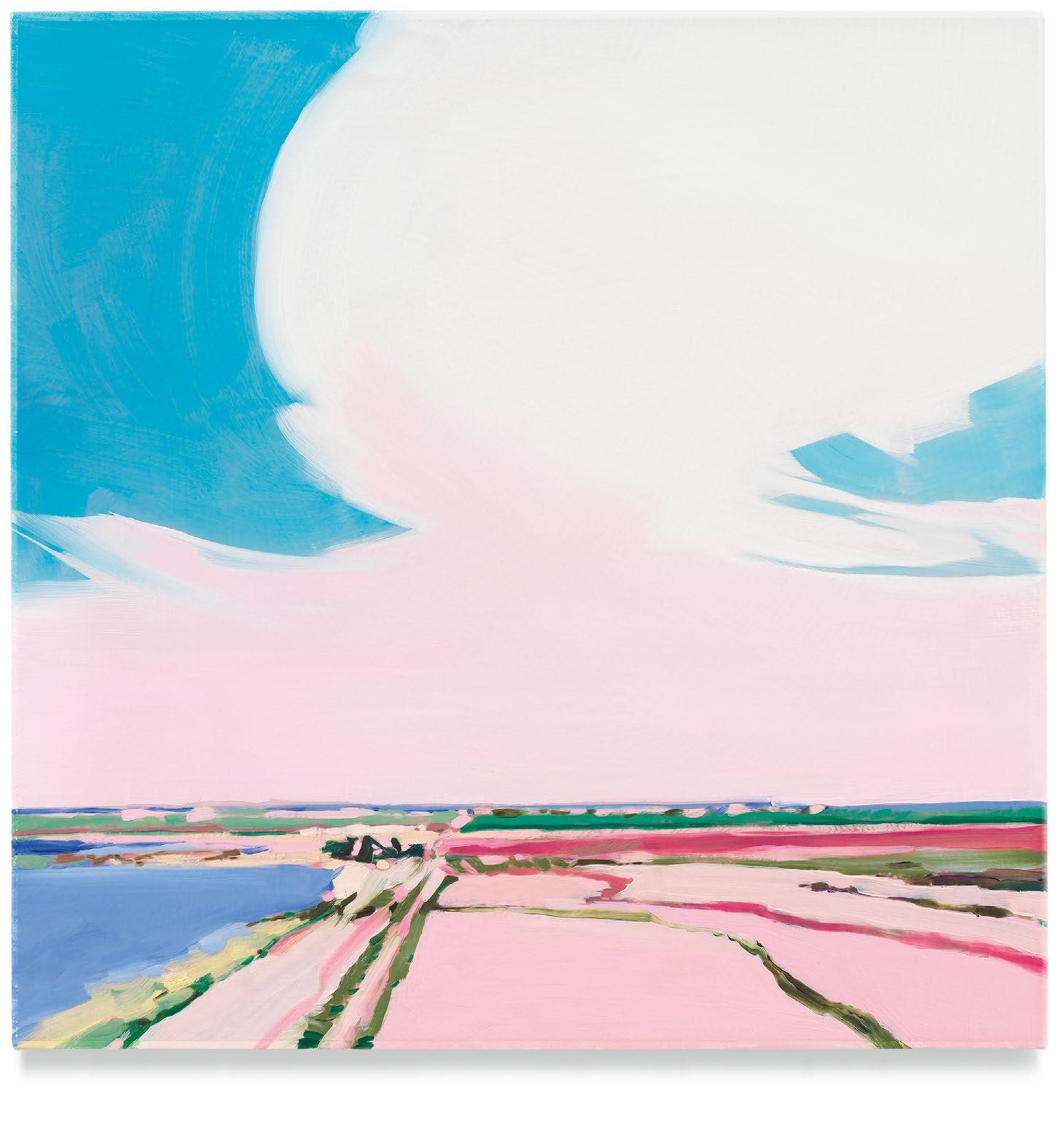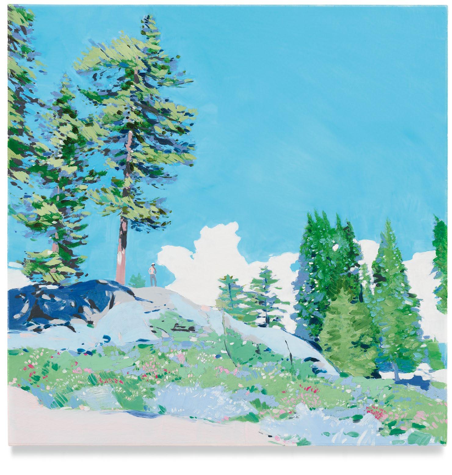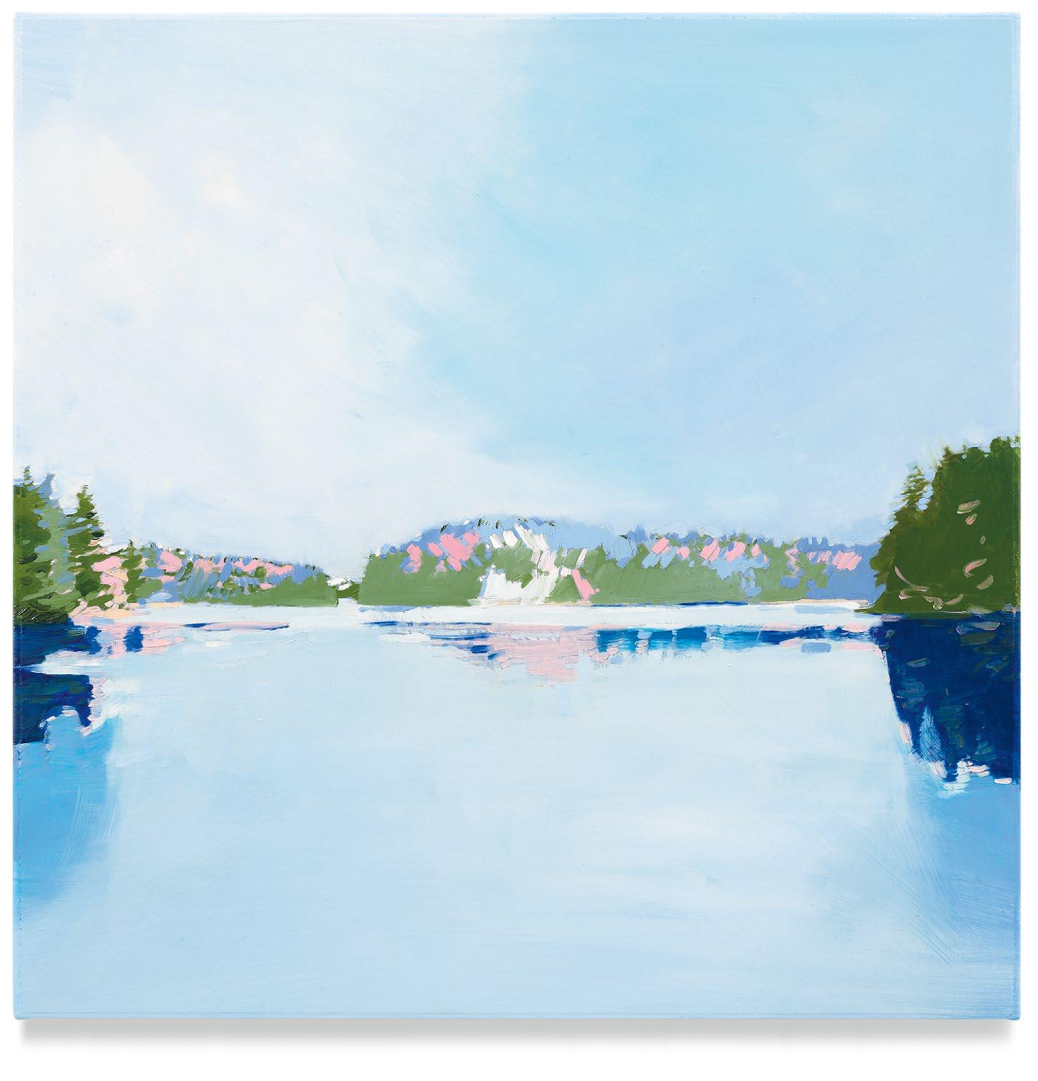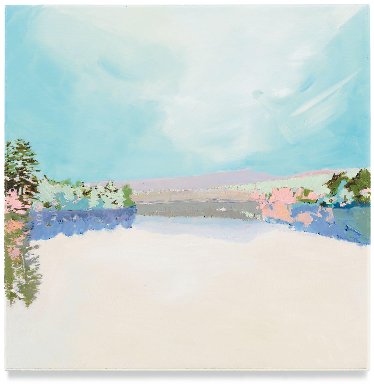 Isca Greenfield-Sanders’s figured landscapes1 transport viewers to light-dappled lakes, mountain trails, rustic sites where wild flowers bloom, and ocean shores bounded by sandy beaches and sunny skies. These are well-trodden places that people like to visit. Often, they appear to be startingly familiar. You might feel that you have already been there—or to somewhere very similar. There’s her noteworthy palette to consider, too. It’s unobtrusive. Though you immediately notice how this third-generation artist2 occasionally swaddles her scenic vistas in pinks or blues, you probably remain unaware that she also practices restraint. She doesn’t overload her canvases with lots of different colors.
