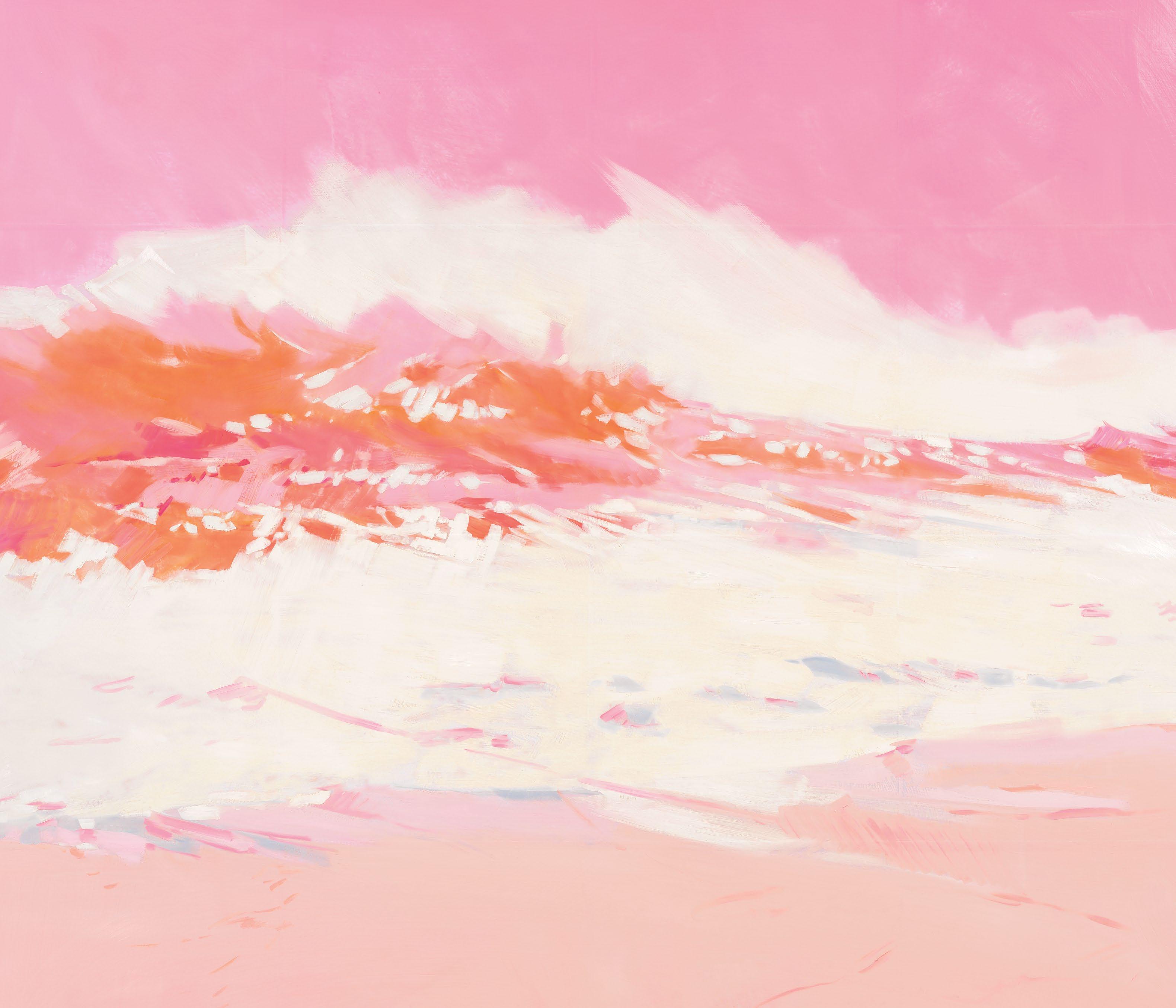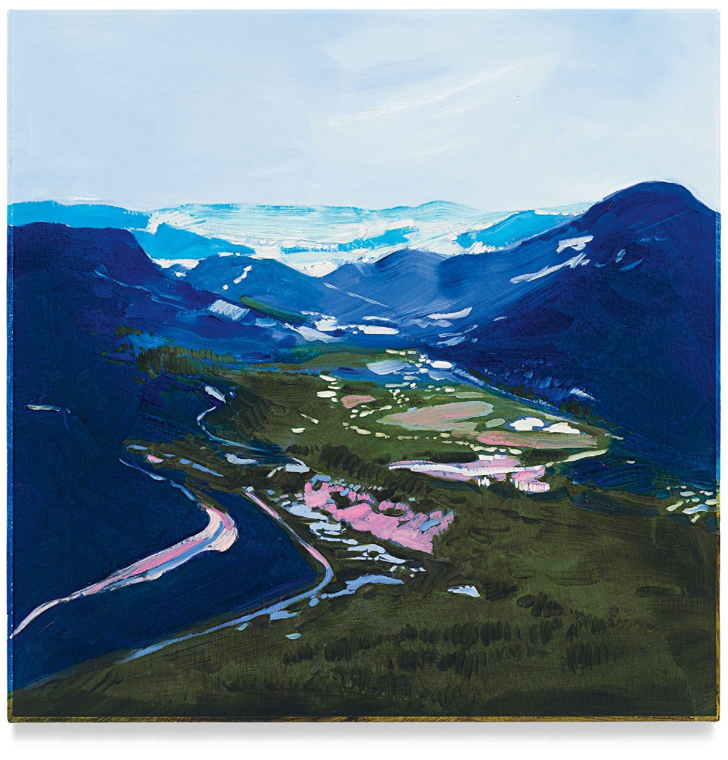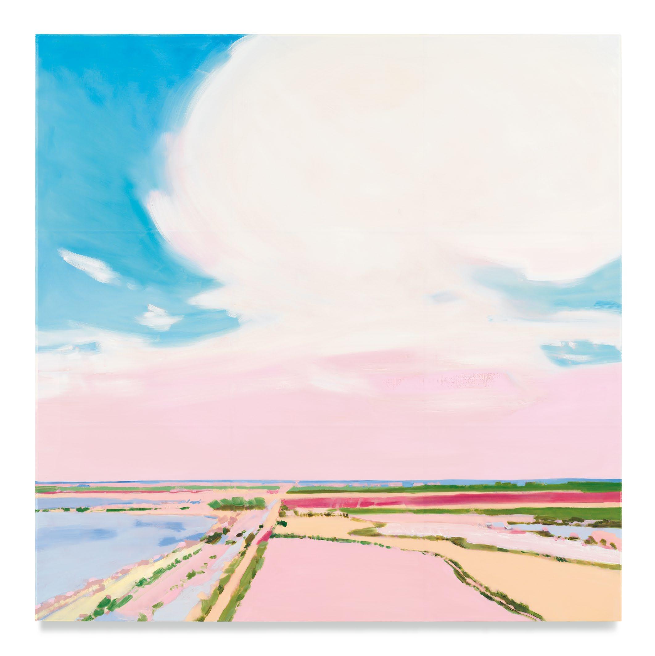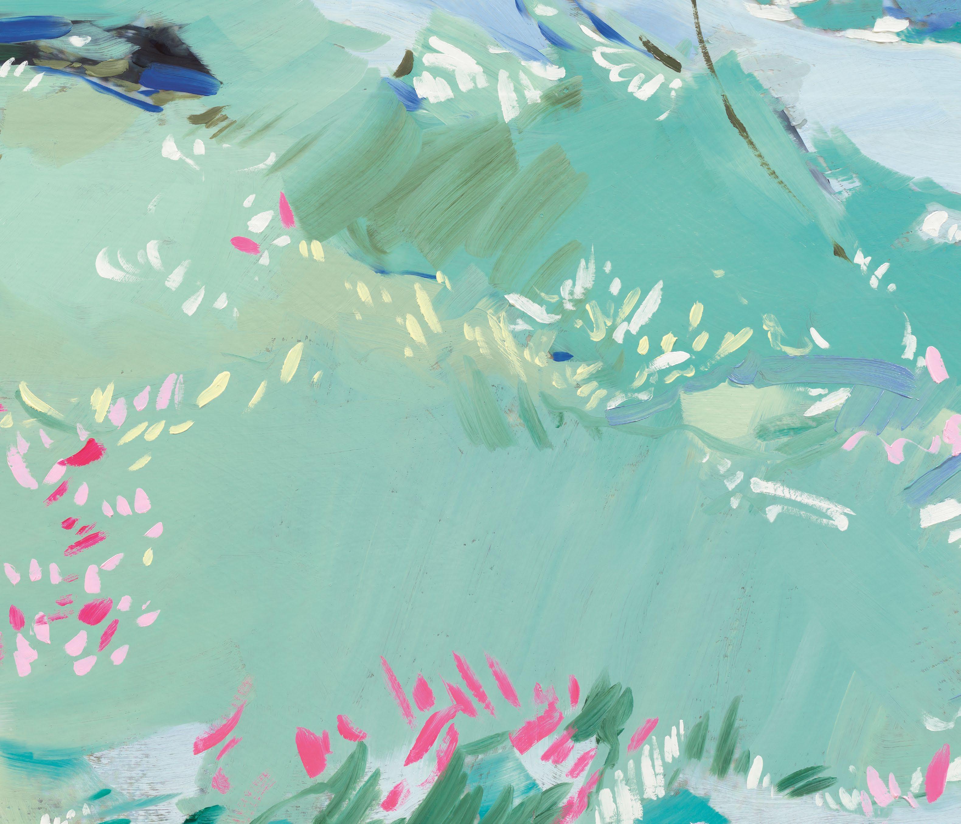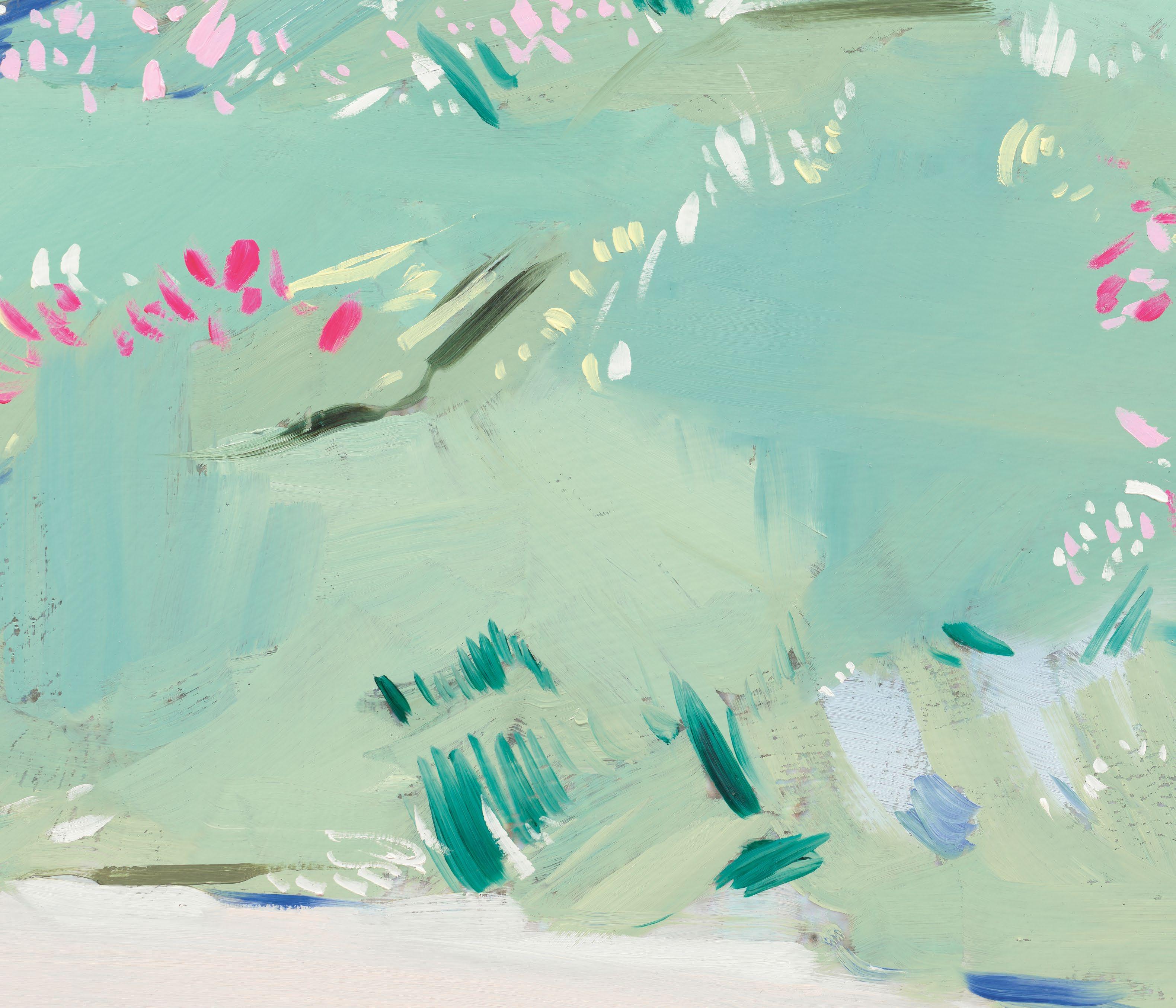 Isca Greenfield-Sanders’s figured landscapes1 transport viewers to light-dappled lakes, mountain trails, rustic sites where wild flowers bloom, and ocean shores bounded by sandy beaches and sunny skies. These are well-trodden places that people like to visit. Often, they appear to be startingly familiar. You might feel that you have already been there—or to somewhere very similar. There’s her noteworthy palette to consider, too. It’s unobtrusive. Though you immediately notice how this third-generation artist2 occasionally swaddles her scenic vistas in pinks or blues, you probably remain unaware that she also practices restraint. She doesn’t overload her canvases with lots of different colors.