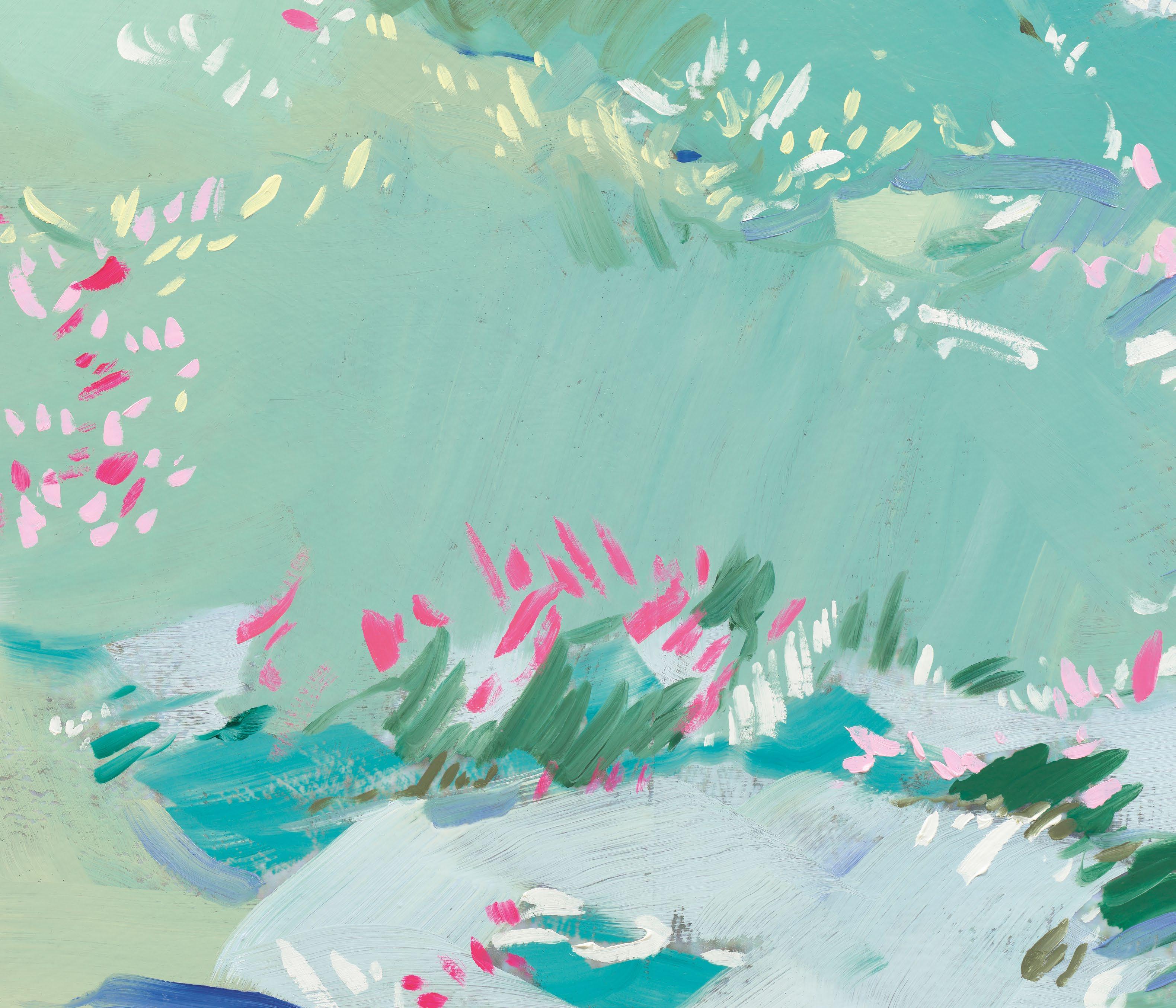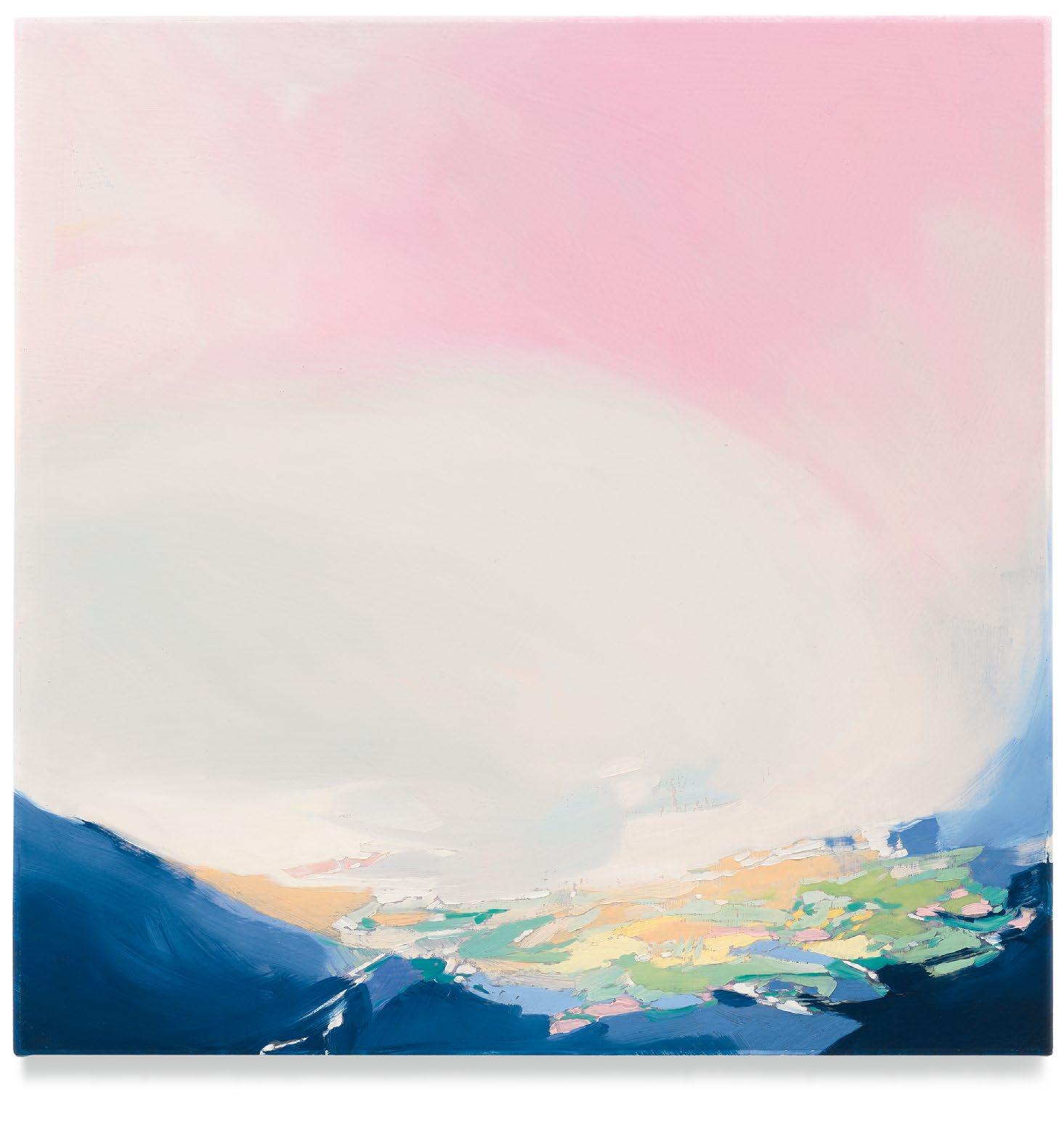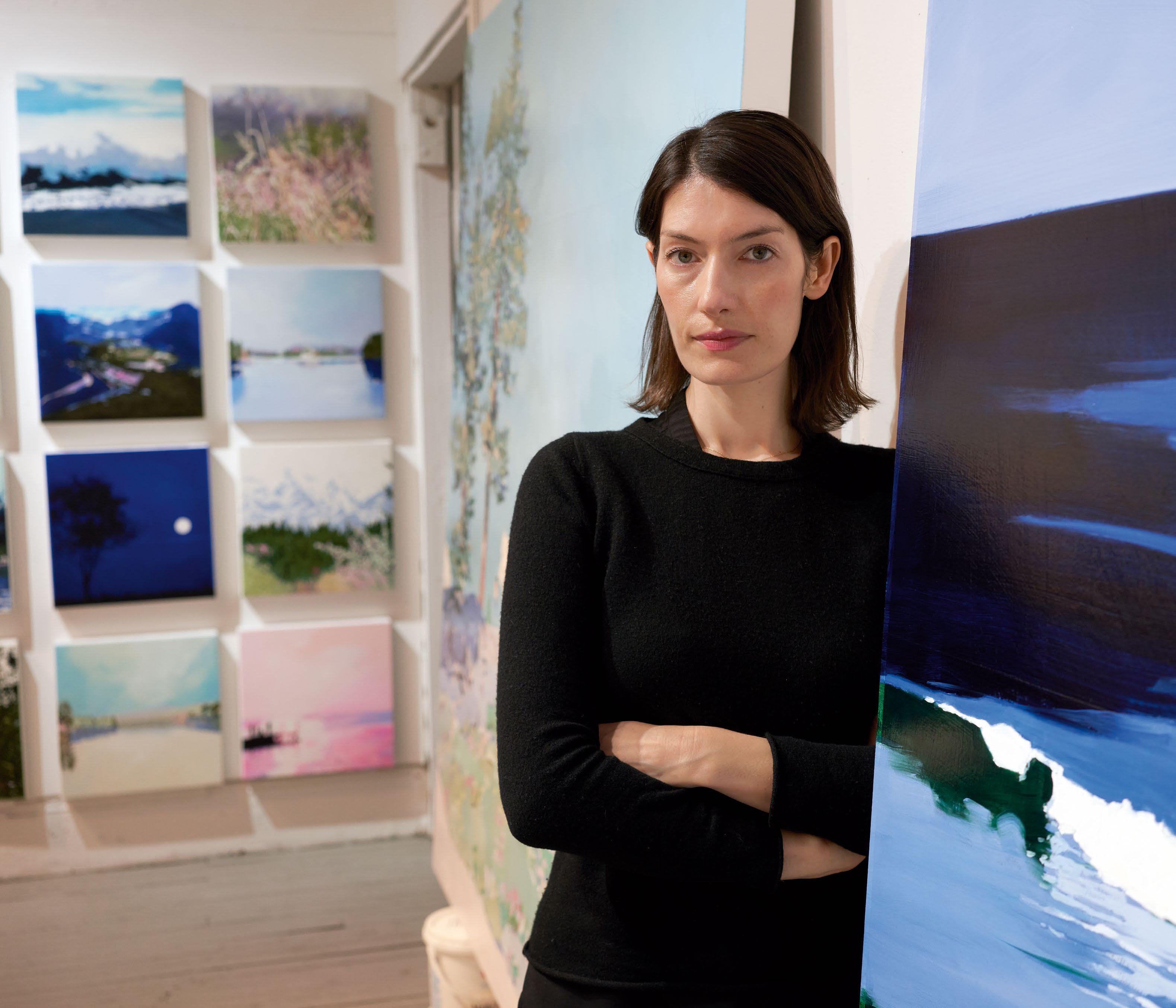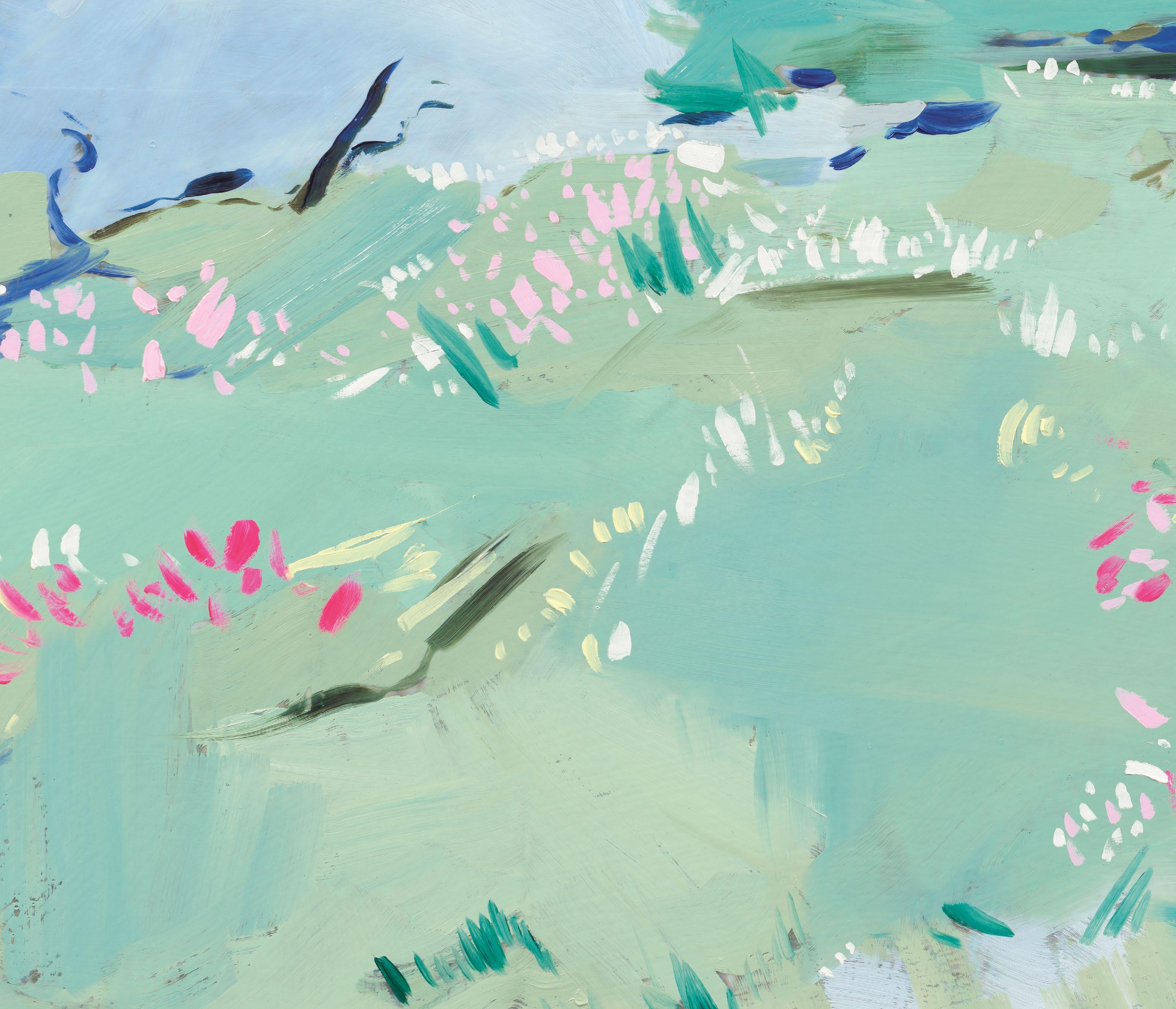 Isca Greenfield-Sanders’s figured landscapes1 transport viewers to light-dappled lakes, mountain trails, rustic sites where wild flowers bloom, and ocean shores bounded by sandy beaches and sunny skies. These are well-trodden places that people like to visit. Often, they appear to be startingly familiar. You might feel that you have already been there—or to somewhere very similar. There’s her noteworthy palette to consider, too. It’s unobtrusive. Though you immediately notice how this third-generation artist2 occasionally swaddles her scenic vistas in pinks or blues, you probably remain unaware that she also practices restraint. She doesn’t overload her canvases with lots of different colors.