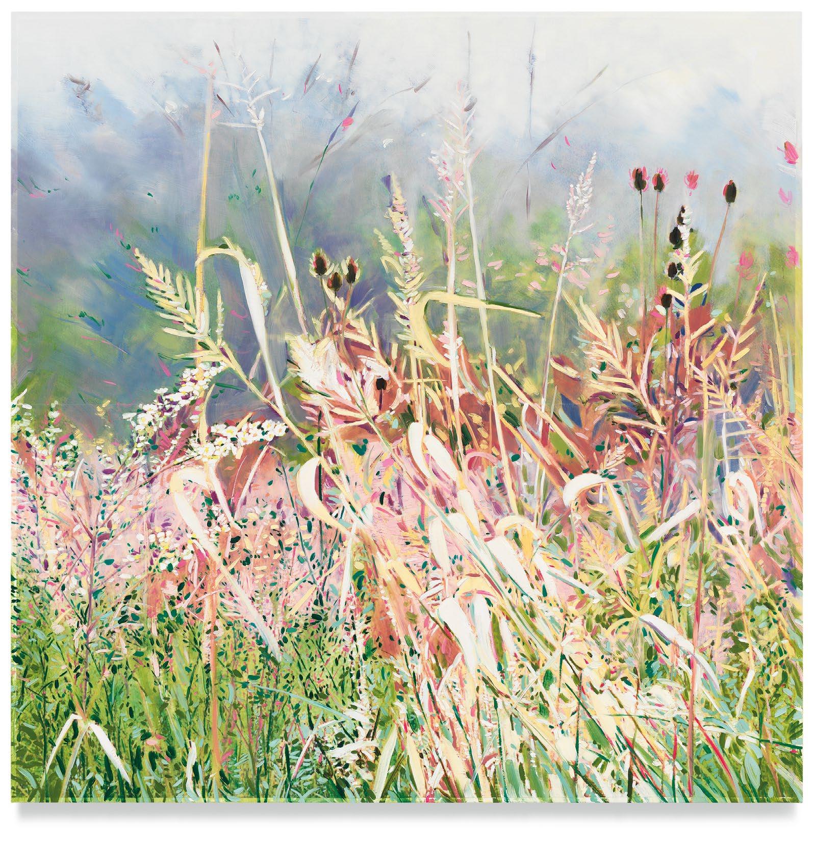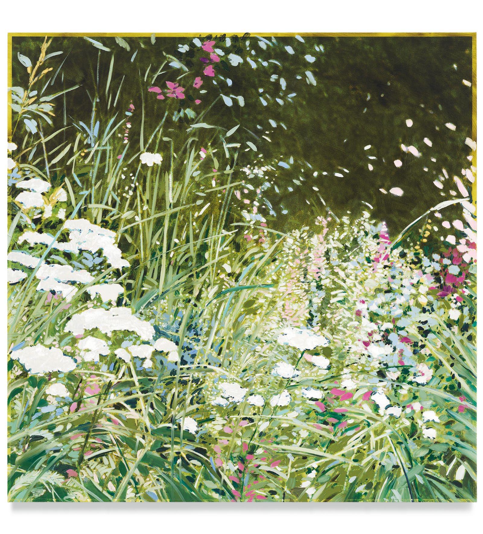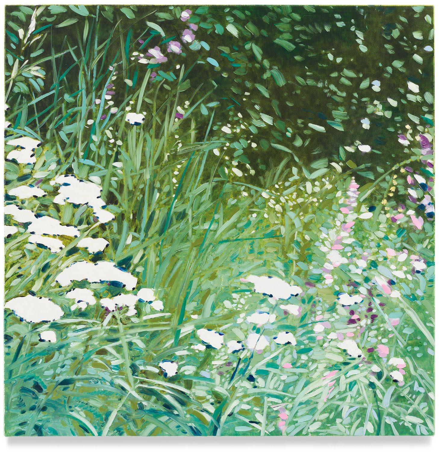 With Field Flowers and Queen Anne’s Lace, Greenfield-Sanders truly rounds out the diverse ways we experience her art. The wildflowers she depicts grow so densely and appear to be so close to us that we feel as if we are practically confronting a jungle. By filling her canvases with these growths, we occupy what’s called a worm’s eye view. These paintings, which feature so many plants and flowers, also are the most animated. Do we hear birds chirping? No, it is more like insects issuing a symphony of sounds. And, as we imagine their cacophonous tones, we realize just what a rich sensory experience Isca Greenfield-Sanders offers viewers of her art. This is landscape painting refreshed and practiced with understated originality.
