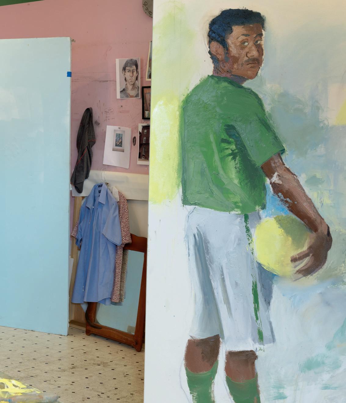 When I visited the studio, there was a large canvas with a composition of three sitters in soccer uniforms. Though it is a work in progress, it is easy to see that the painting achieves more than the sum of its parts. One sitter, who Sonsini informs me, is modeling for the very first time, stands with his back to the viewer and neck cocked back to meet the viewer’s gaze. While the subject is included in the composition it is clear that his position is slightly “o! stage,” acting as a third party or referee as he observes the session he is taking part in. Because Sonsini has had so many lived experiences with the sources of his imagery that a viewer seeing his work for the first time is not privy to, social contexts are ripe for invention or distortion. Nonetheless, Sonsini decidedly accepts every reaction to his work to allow viewers to uninterruptedly have the intellectual and emotional space to formulate their own point of view. Situating layers of identity on the canvas, Sonsini’s work encourages viewers to navigate the complex gaze of desire and content, just as he as a young man found something he simply couldn’t shake in the sports pages of The Valley Green Sheet