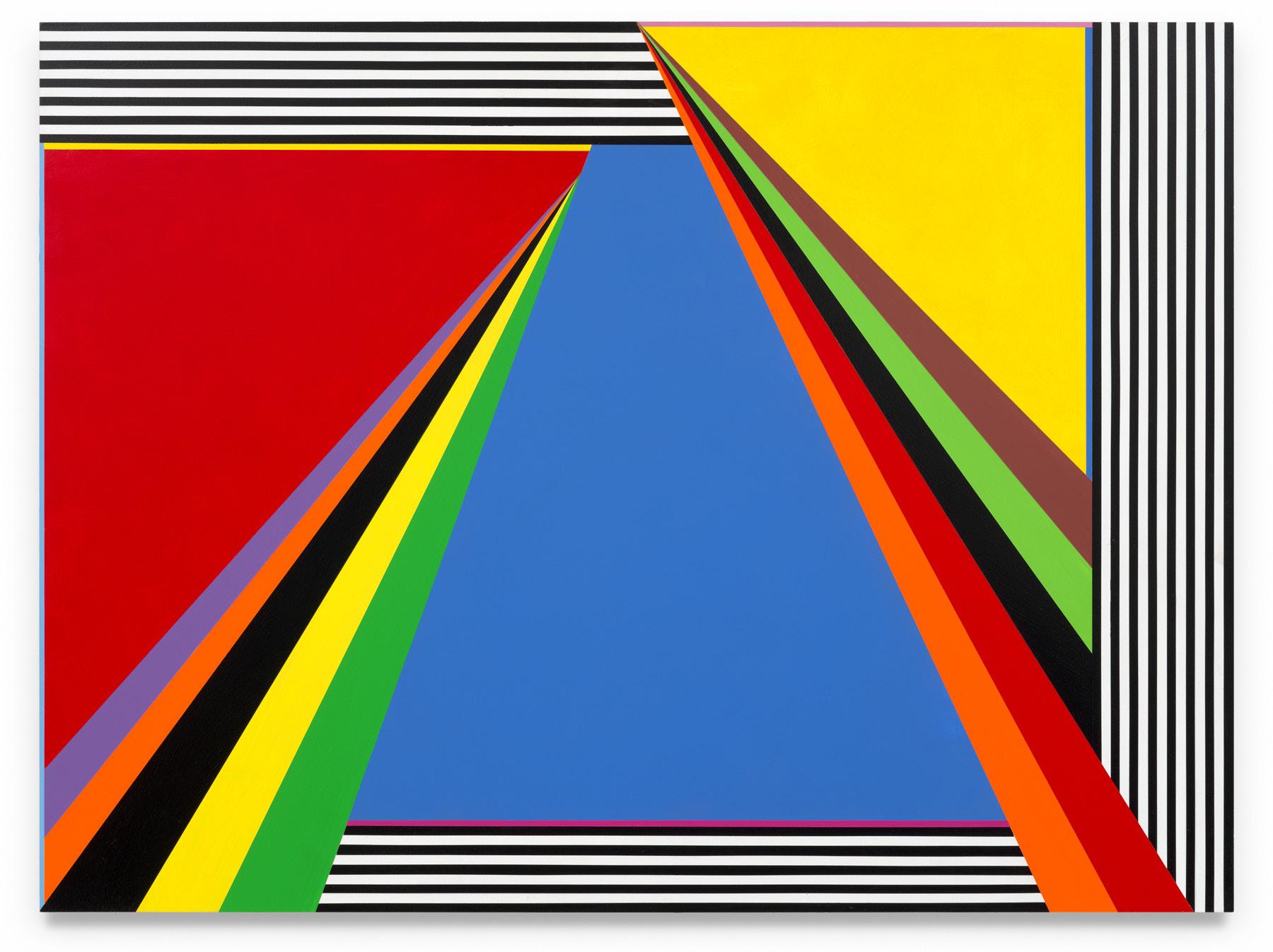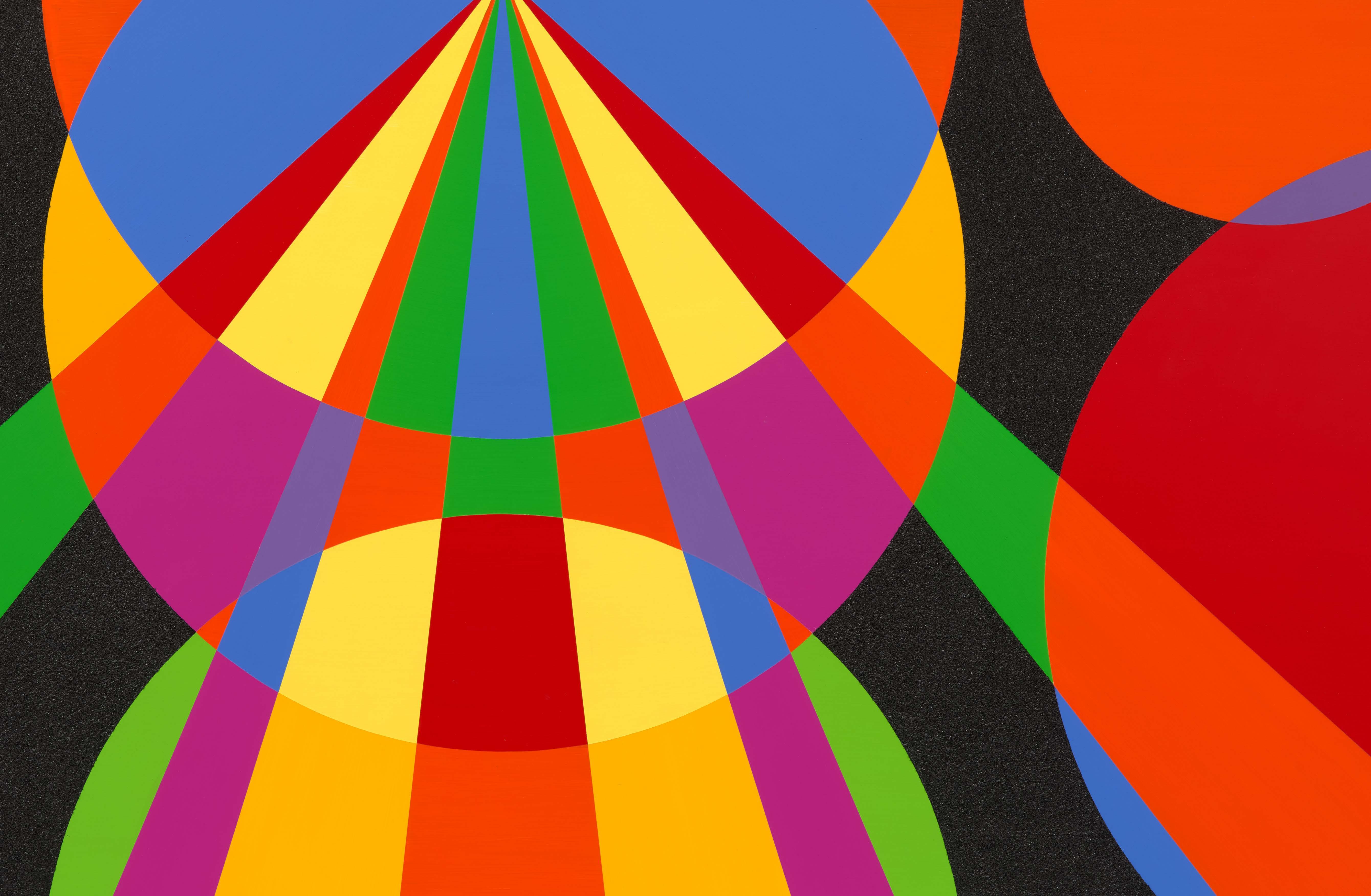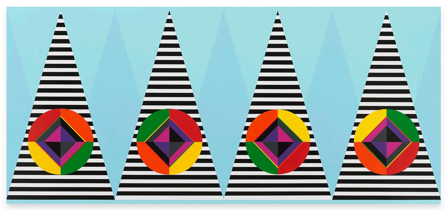 Triangles and inverted triangles, circles of various diameters, vertical or horizontal stripes in negative space, aligned segments, remain his favored graphical tactics to organize the feld. But new things are happening. The overlaps have grown more intense, their geometries more involved. The color decisions are intuitive and irregular. New forms are birthed in the vortex. Some are implicit, relying for their manifestation on the play of optics, the mind’s eye. Others are right there in the design. They break and tumble across the surface. Getting loose. Getting free.