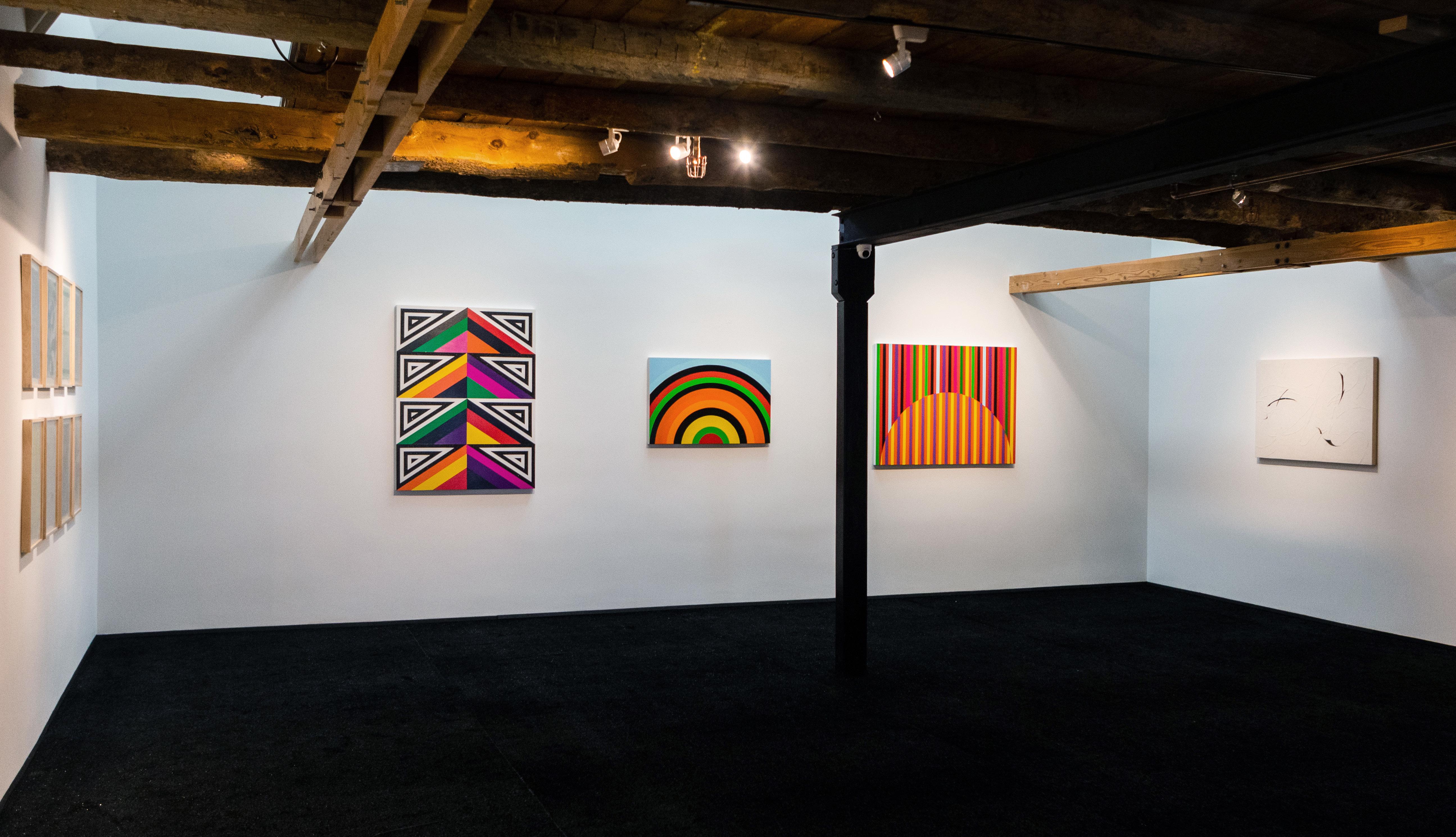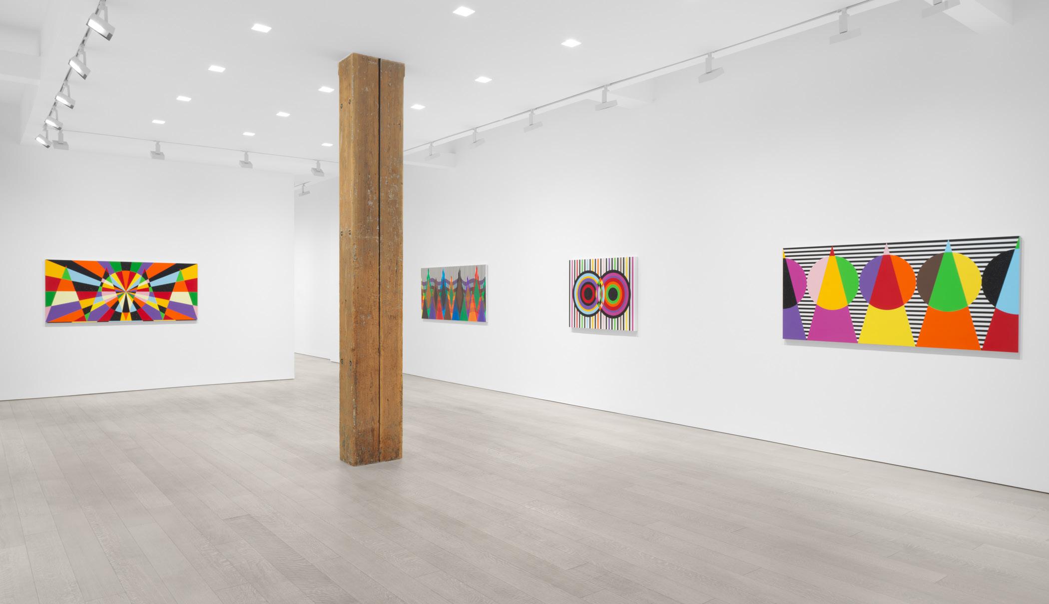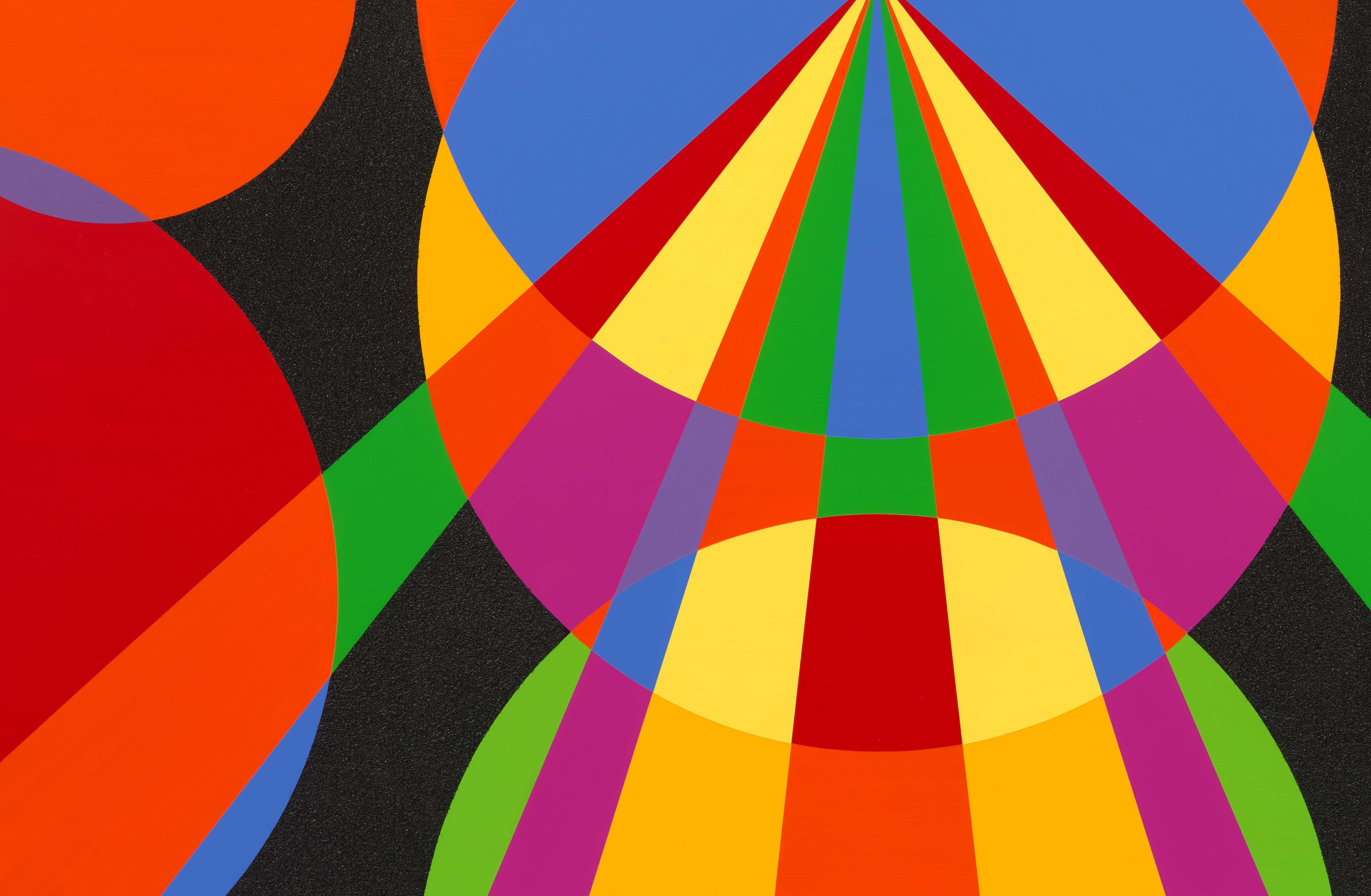 Triangles and inverted triangles, circles of various diameters, vertical or horizontal stripes in negative space, aligned segments, remain his favored graphical tactics to organize the feld. But new things are happening. The overlaps have grown more intense, their geometries more involved. The color decisions are intuitive and irregular. New forms are birthed in the vortex. Some are implicit, relying for their manifestation on the play of optics, the mind’s eye. Others are right there in the design. They break and tumble across the surface. Getting loose. Getting free.