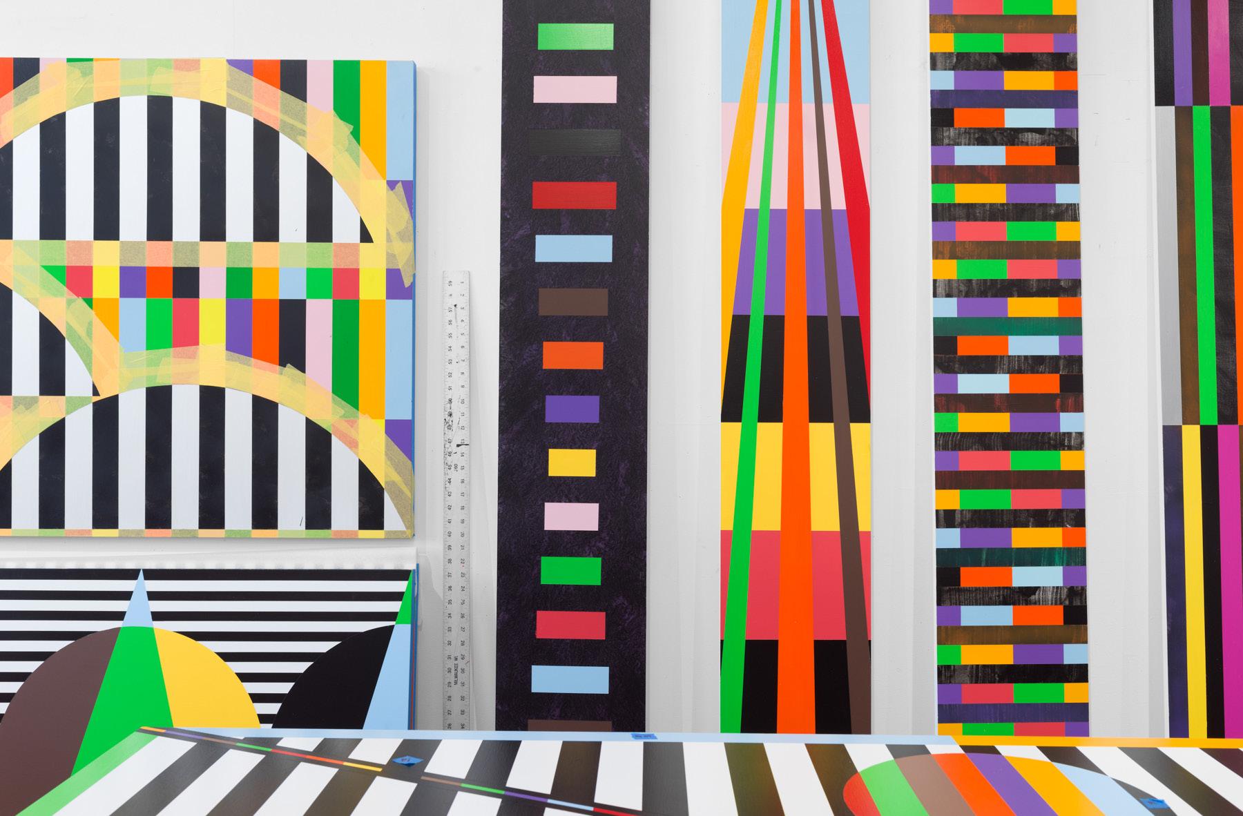 It’s high summer, and Gatson is working on the new paintings for this exhibition. The stereo plays Coltrane— John today, but Alice is also a favorite. The space is compact—not crowded so much as full, with works set close to one another. Those nearer to completion hang or rest against the wall. Those in earlier stages lay flat on tables and trestles. He has identified the form they will take and established the lines of the composition, but the colors are still hypotheses, some simply tentative letter codes jotted on the surface. They will find their values in the making.