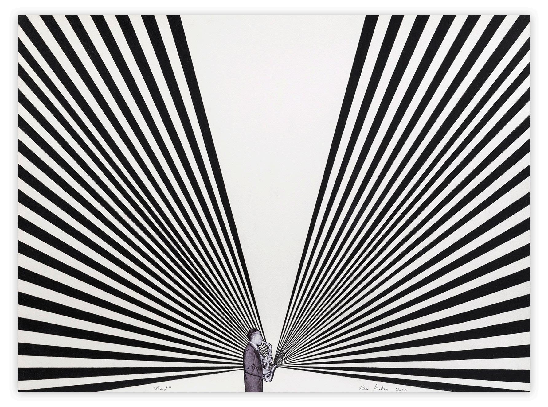 Similarly, Gatson, has incorporated a “bullseye” into the “Above and Below” series. The bullseye is represented by a fxed, primary-colored pinwheel. This effect can be observed in Untitled (After the Storm) through the placement of the bullseye within an oceanic seascape with several diagonal lightning bolts stacked on either side. Viewers may experience the center shape as a light source or deity. The winding circle leading into infnitude—nowhere and everywhere—is a consistent symbol on the handmade album covers of SUN RA and his bandmates.5 The black and white cover for SUN RA and the Myth Science Arkestra depicts a circle swirling with hand drawn staircases in a meditative spiral. Another version of the album cover shows SUN RA holding an orb-like sun fgure above his head, appearing to examine it on all sides.