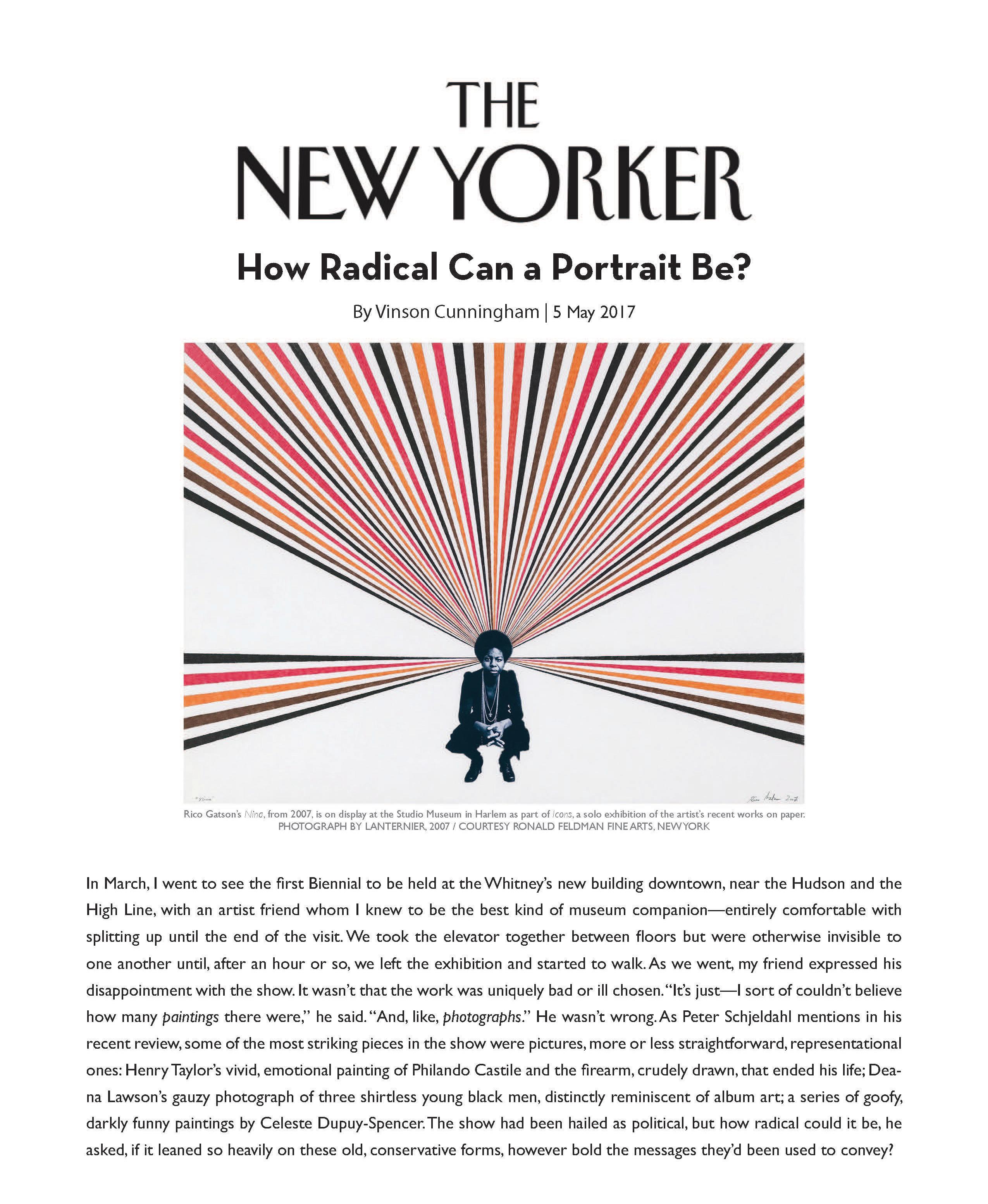 RICO GATSON (b. 1966 in Augusta, GA) received his Bachelor of Fine Arts from Bethel College in 1989 and his Master of Fine Arts from Yale School of Art in 1991.