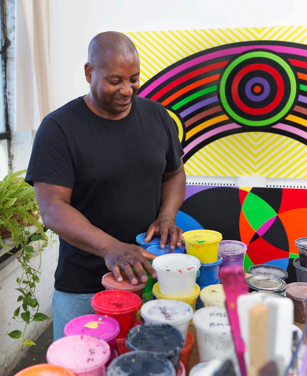 In the past year and a half, Gatson traveled several times to Birmingham, Alabama, where he was developing works for an atrium commission at the Birmingham Museum of Art. For one wall, he produced a painting in the Icons vein honoring the city’s Civil Rights movement hero, the Reverend Fred Shuttlesworth, with members of the community assisting in its completion. Opposite is a vinyl mural work that is all geometric forms. It is nonfgural