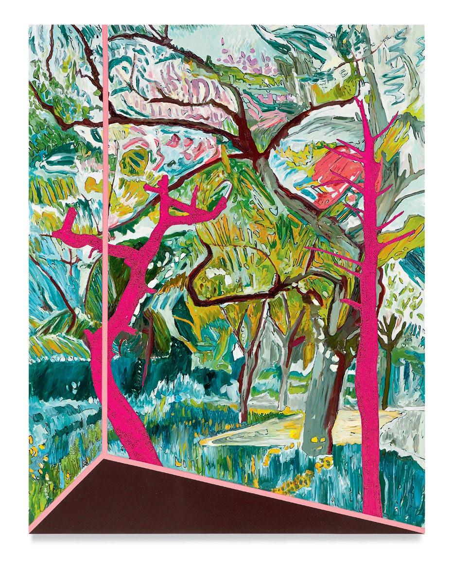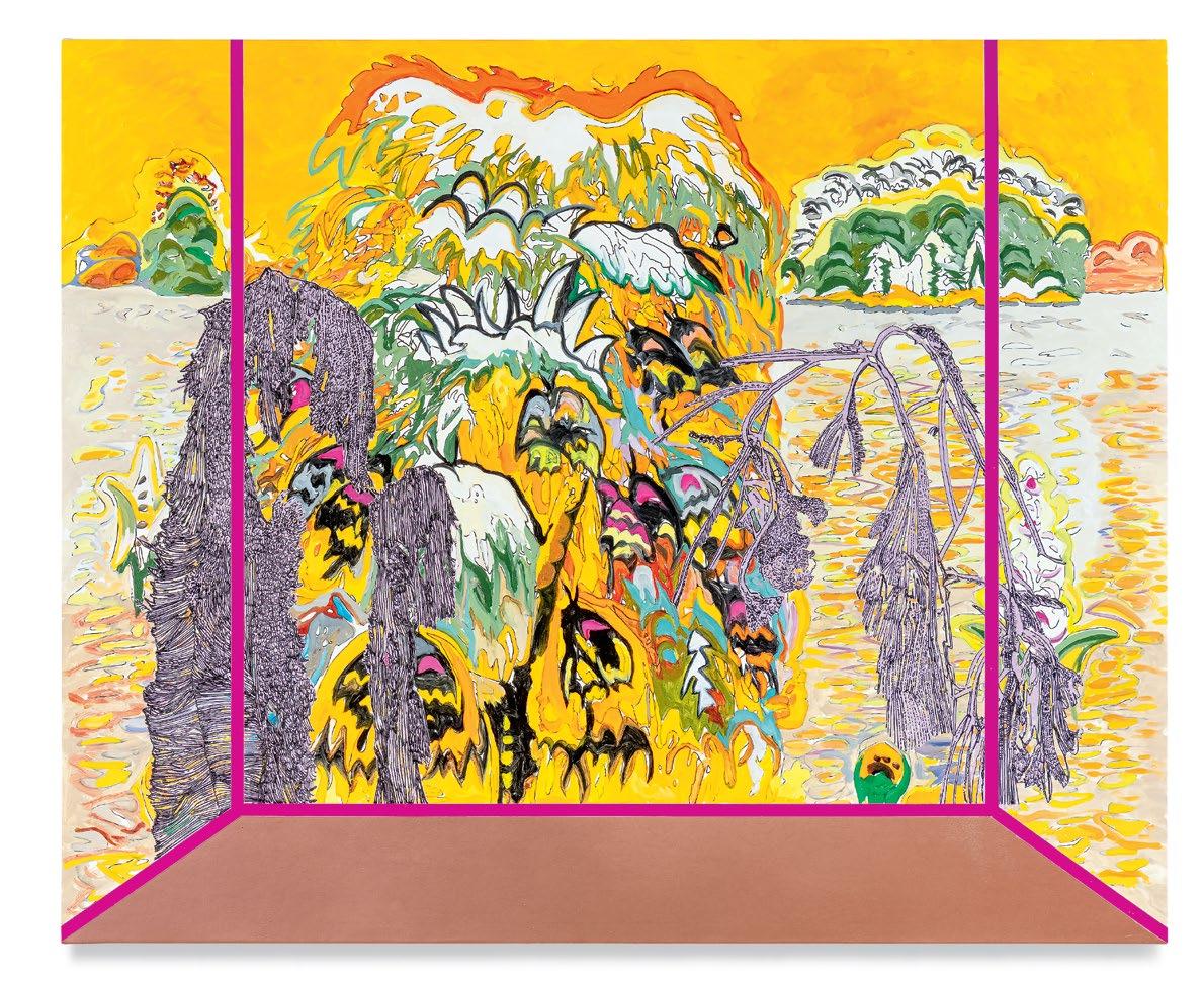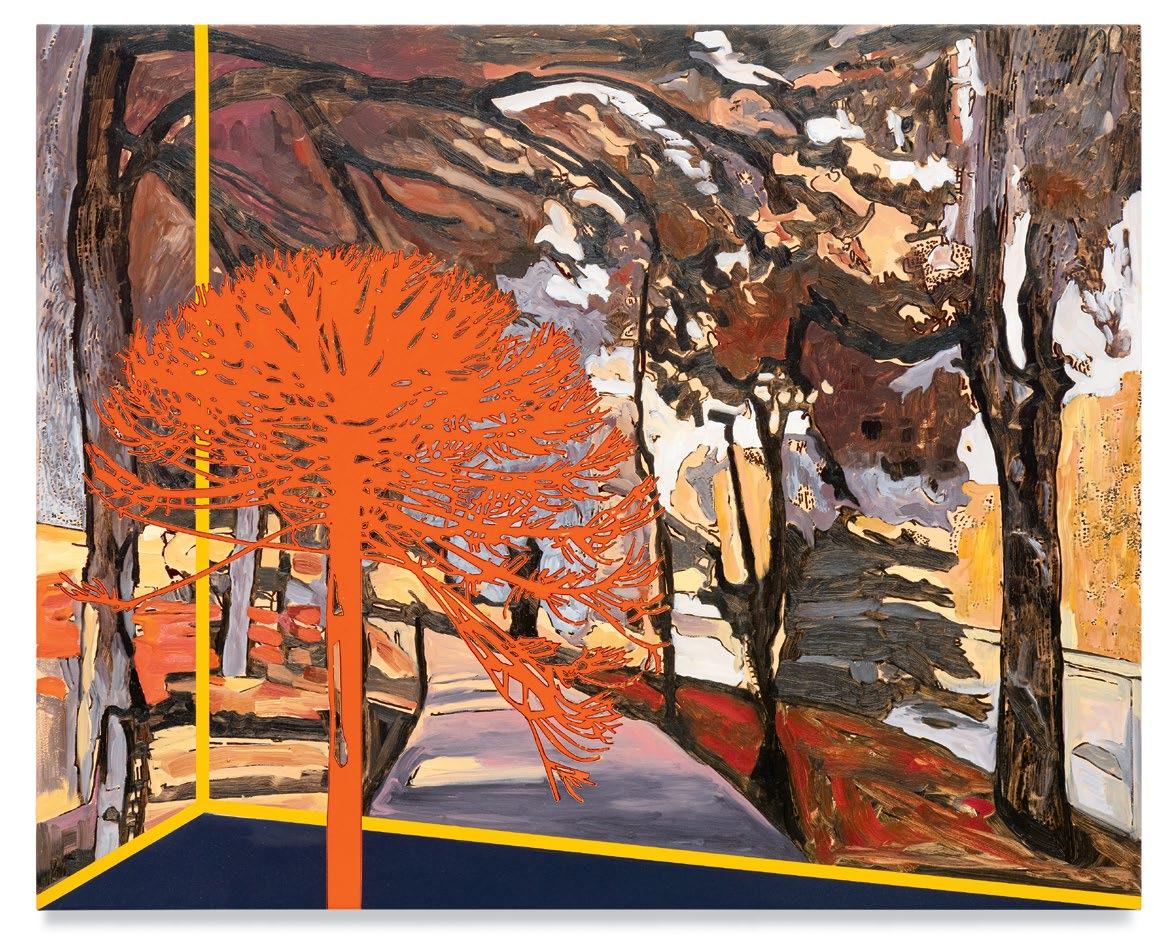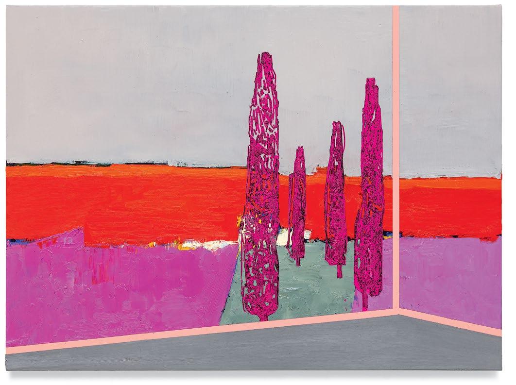 also includes silhoue ed images—again monochromatic though o en with added linear markings—of trees or shrubs. In some cases, these—unlike the more elaborate landscape imagery—do follow the angled perspectival planes of the imaginary room’s walls. In others, they parallel the plane of the painting surface itself, in which case, intersecting the bo om of the canvas, they represent a plane between the viewer and everything else seen in the painting—an extreme foreground.