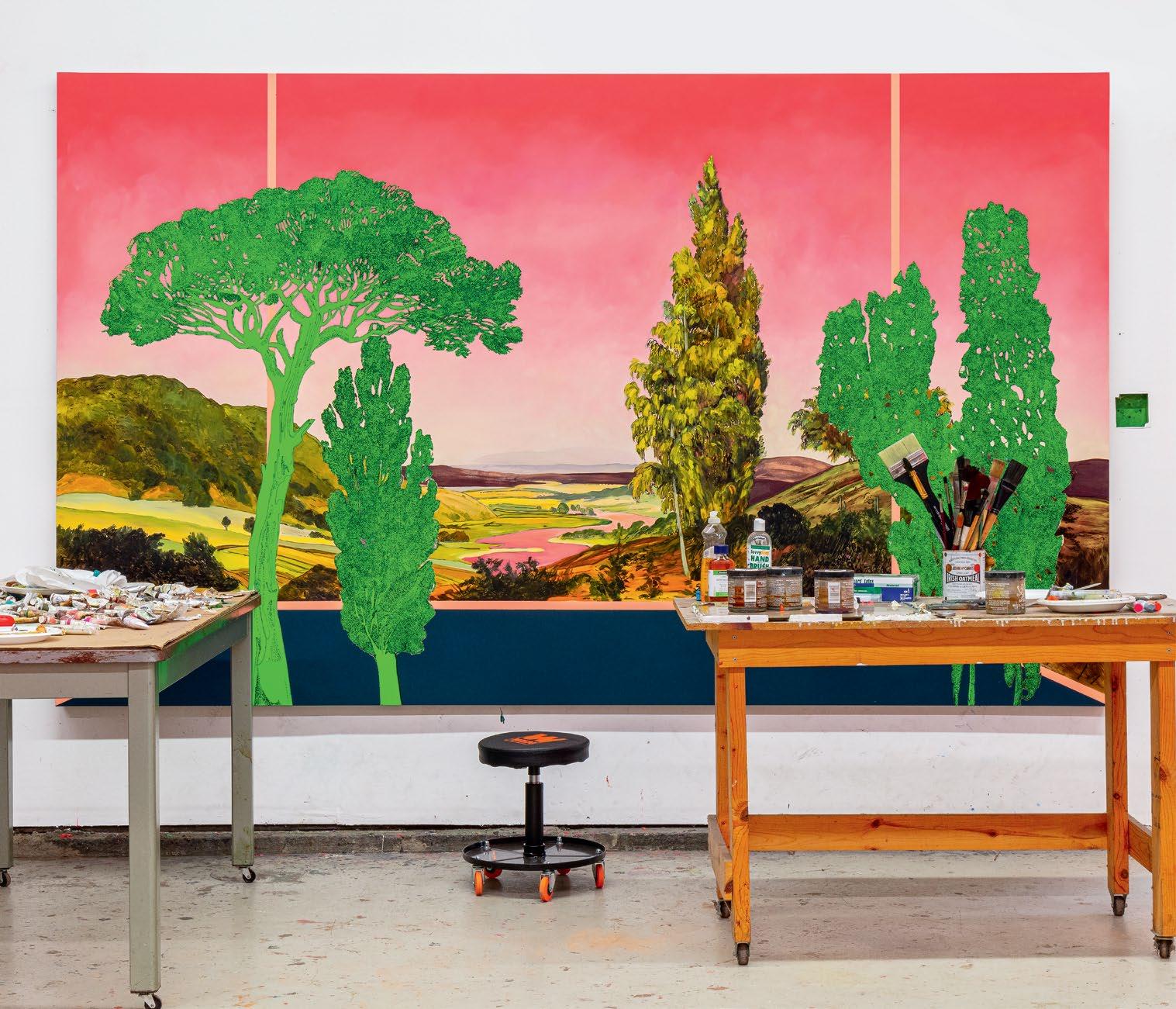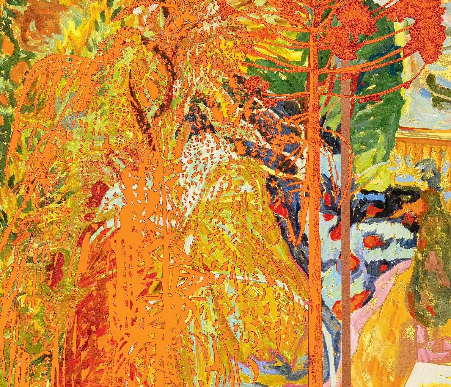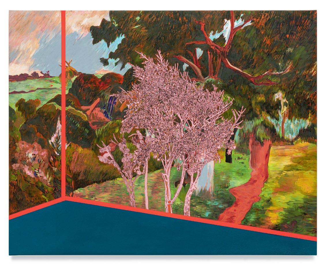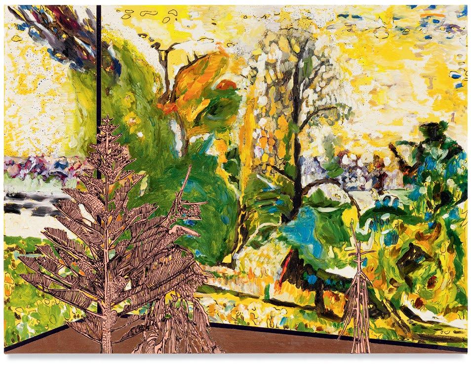 also includes silhoue ed images—again monochromatic though o en with added linear markings—of trees or shrubs. In some cases, these—unlike the more elaborate landscape imagery—do follow the angled perspectival planes of the imaginary room’s walls. In others, they parallel the plane of the painting surface itself, in which case, intersecting the bo om of the canvas, they represent a plane between the viewer and everything else seen in the painting—an extreme foreground.