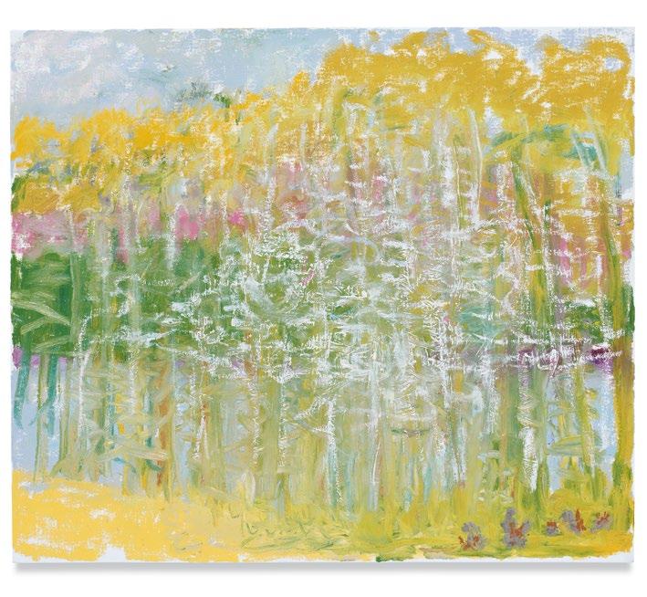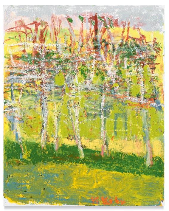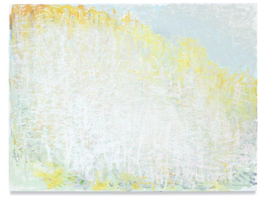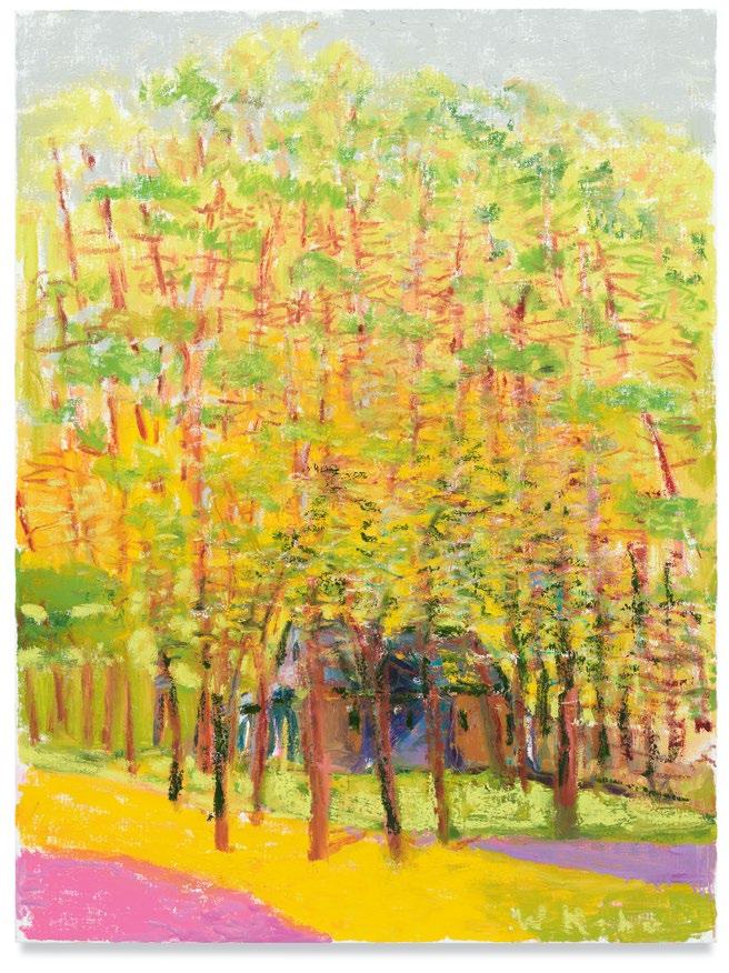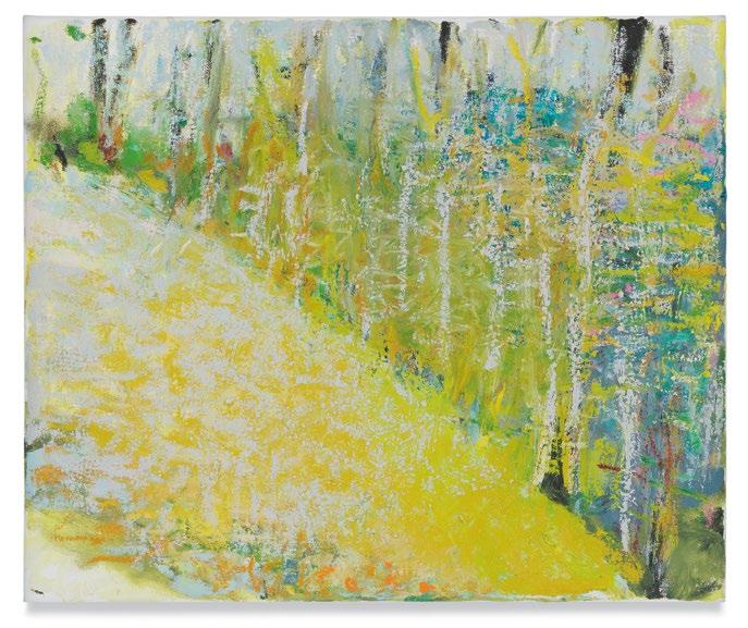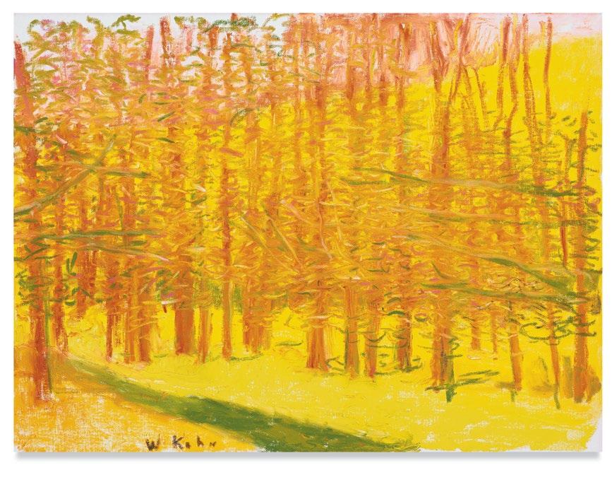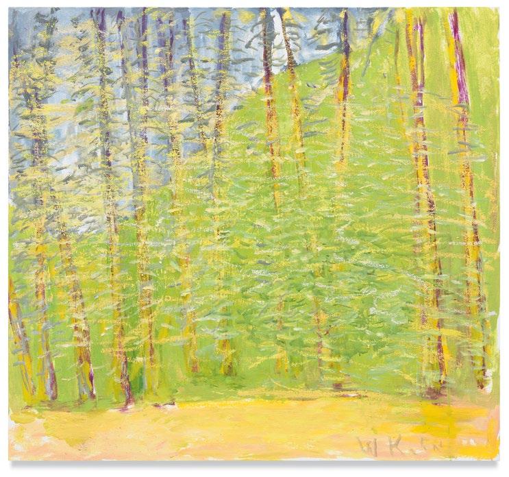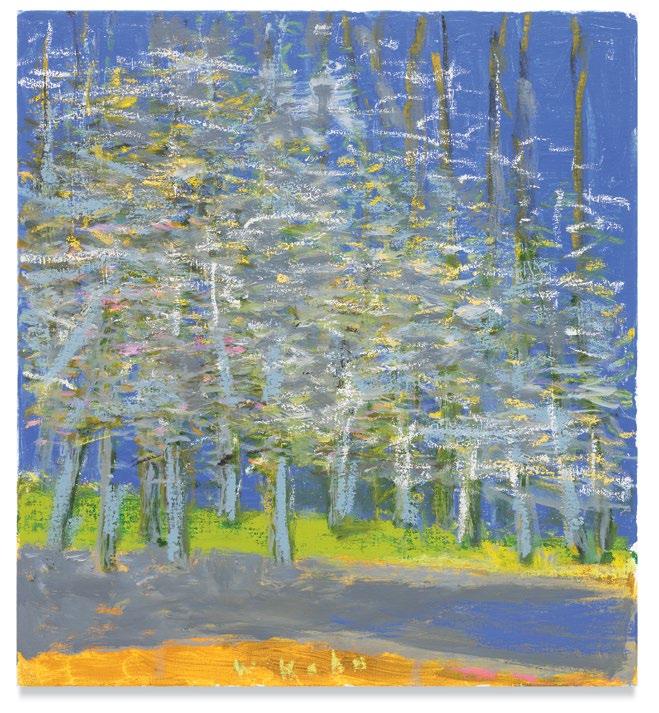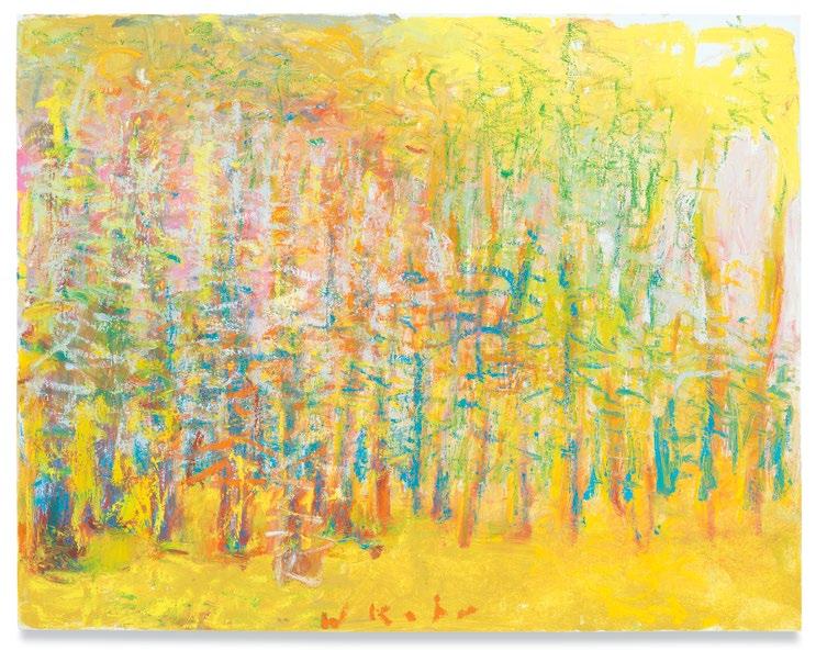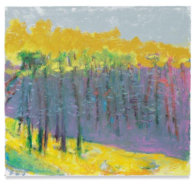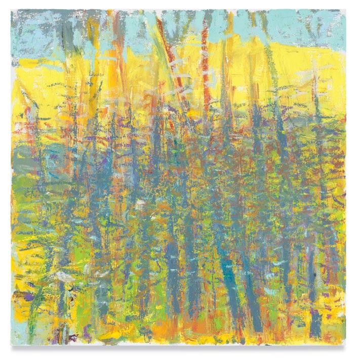 The exhibition of recent work reveals further developments in his innovative way of using oil sticks to suspend a veil over the brilliant colors of a receding landscape. Although these canvases are generally smaller than canvases from a few years ago, the new works have greater density and a more complex layering. Horizontal strokes weave through an array of magenta, yellow, and deep blue tree trunks, lending an active momentum that can energize an entire surface. A horizontal row of slender tree trunks evenly spaced across a canvas surface can present a compositional challenge to an artist who is habitually drawn to dramatic and di ffering perspectives. Yet Kahn has been using this image as a point of departure since the 1980s, perhaps with a nod to Monet’s poplar trees. In many ways, it has been a test of his virtuosity and a demonstration of an expertise that can evoke a birch grove with a series of wavering brush-drawn lines or turn a band of parallel verticals into a transition from a shadowy foreground to a sun-drenched middle distance.