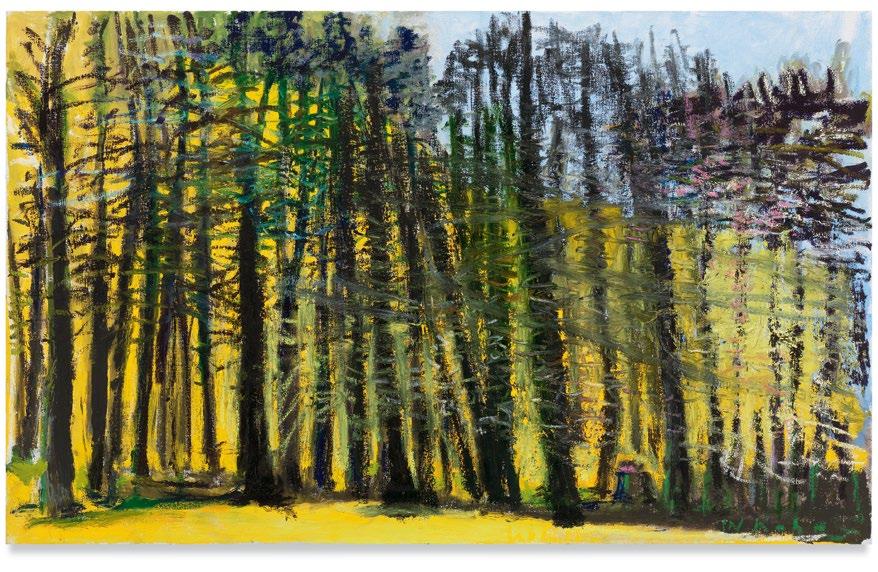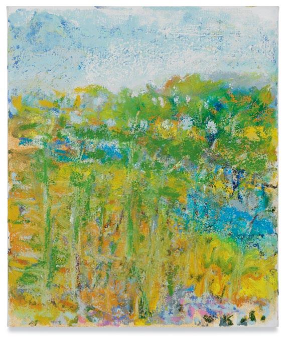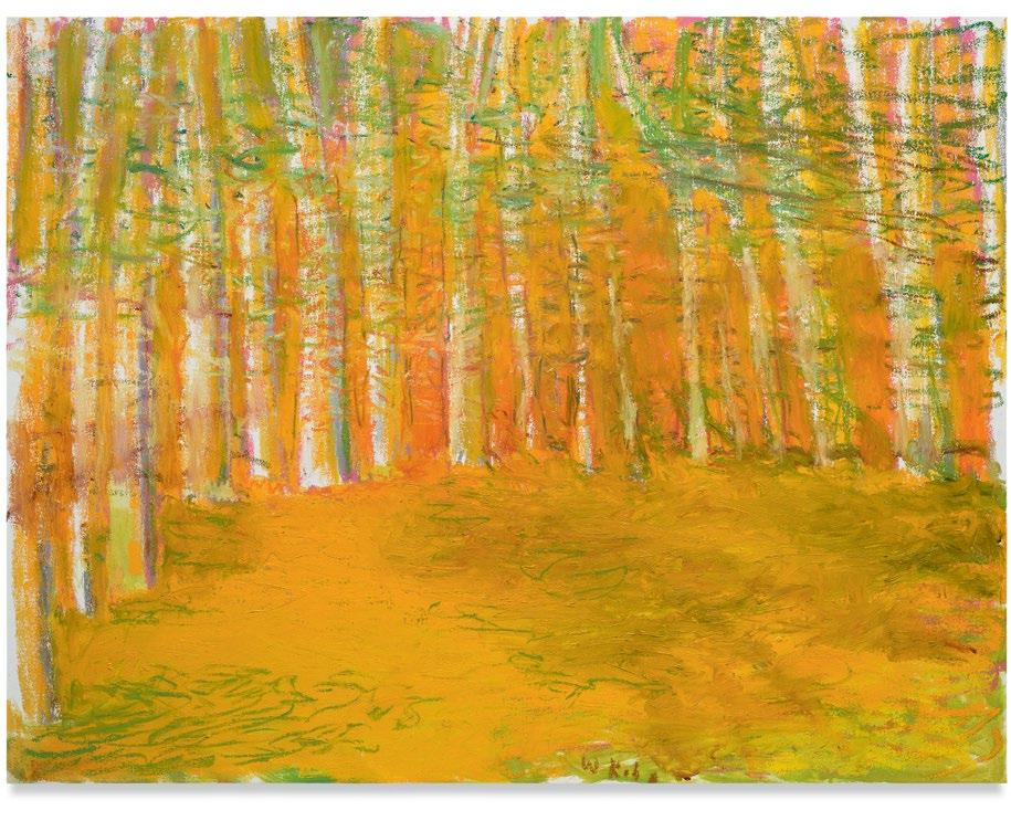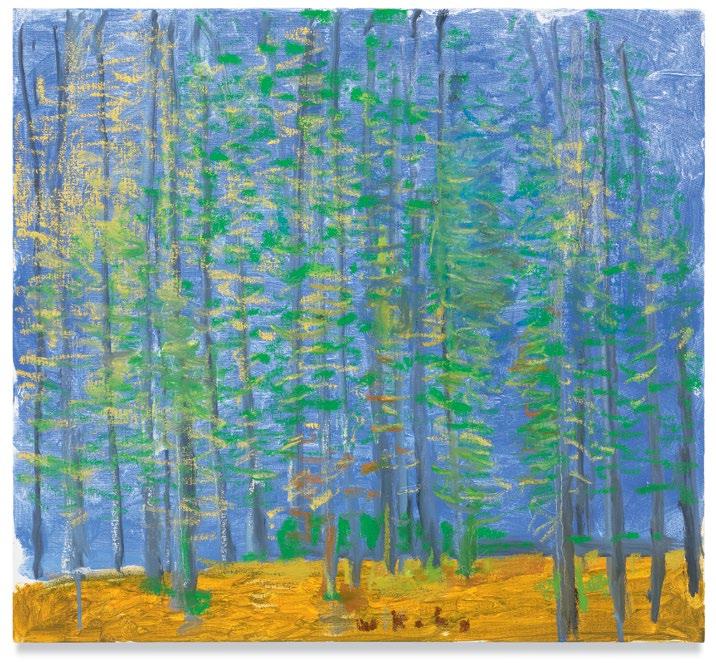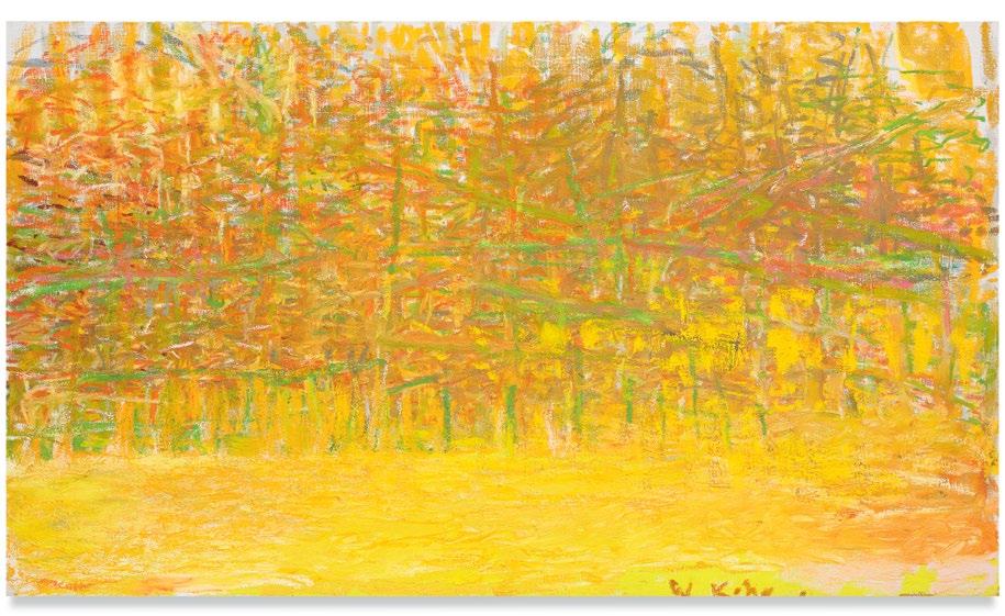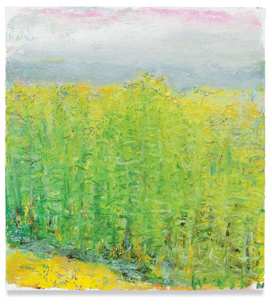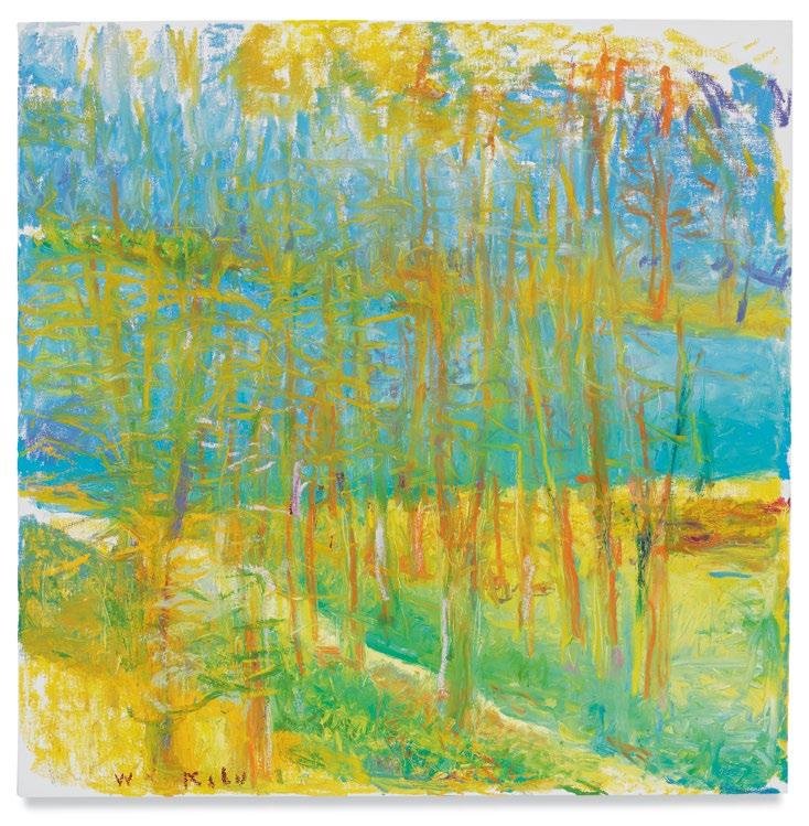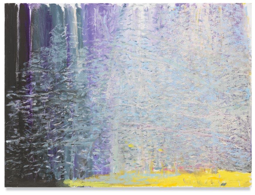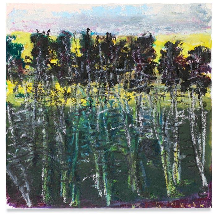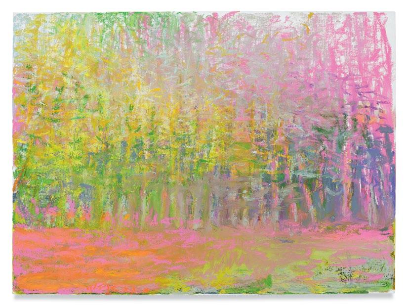 The exhibition of recent work reveals further developments in his innovative way of using oil sticks to suspend a veil over the brilliant colors of a receding landscape. Although these canvases are generally smaller than canvases from a few years ago, the new works have greater density and a more complex layering. Horizontal strokes weave through an array of magenta, yellow, and deep blue tree trunks, lending an active momentum that can energize an entire surface. A horizontal row of slender tree trunks evenly spaced across a canvas surface can present a compositional challenge to an artist who is habitually drawn to dramatic and di ffering perspectives. Yet Kahn has been using this image as a point of departure since the 1980s, perhaps with a nod to Monet’s poplar trees. In many ways, it has been a test of his virtuosity and a demonstration of an expertise that can evoke a birch grove with a series of wavering brush-drawn lines or turn a band of parallel verticals into a transition from a shadowy foreground to a sun-drenched middle distance.