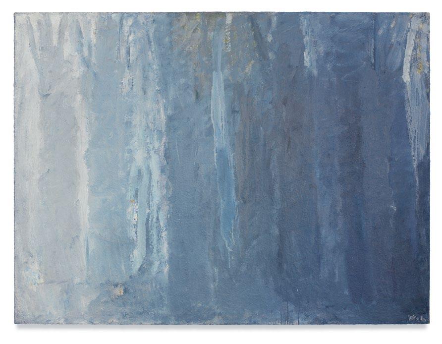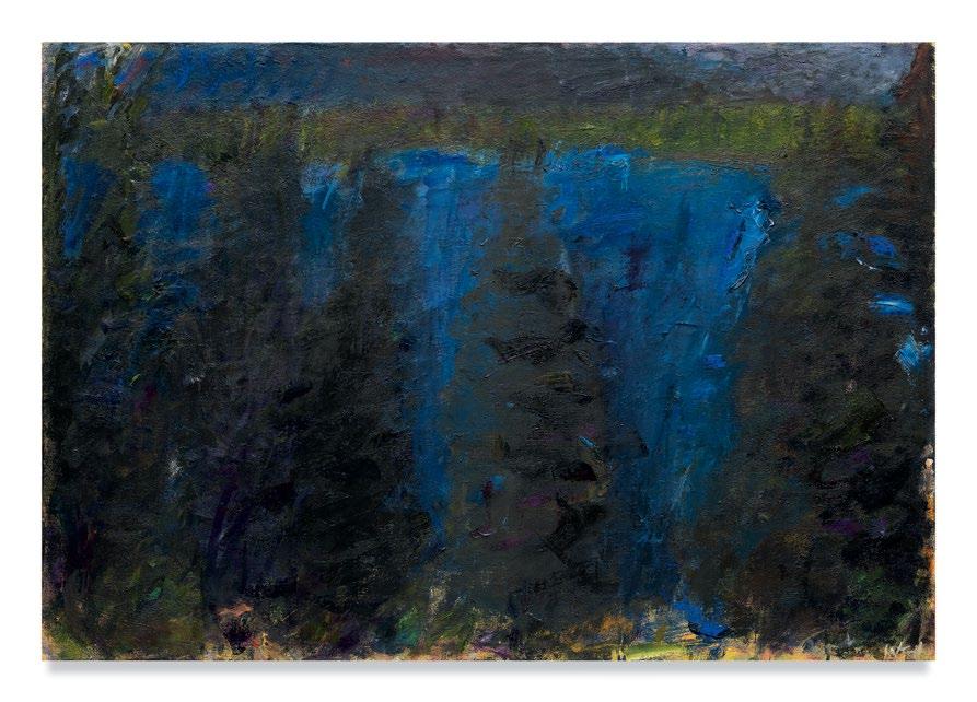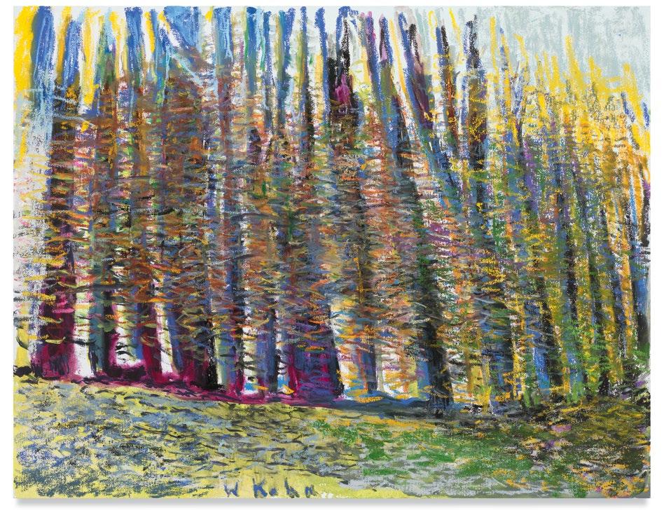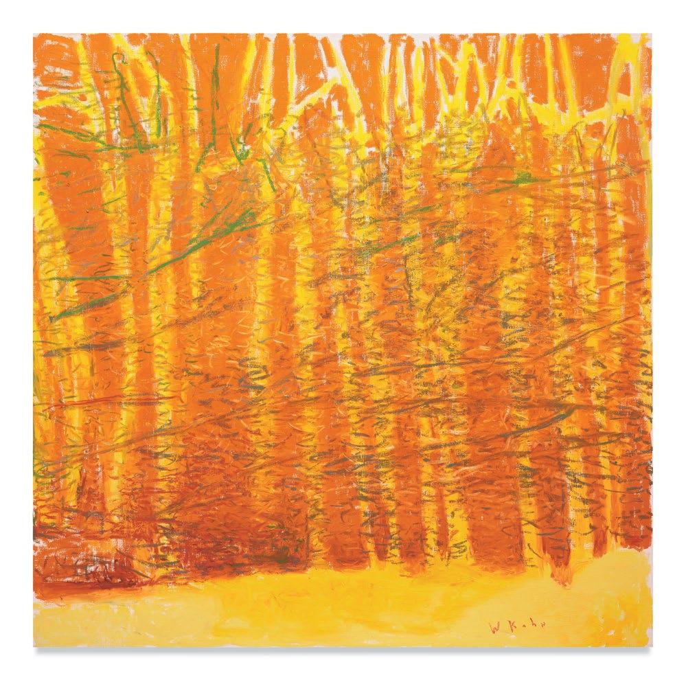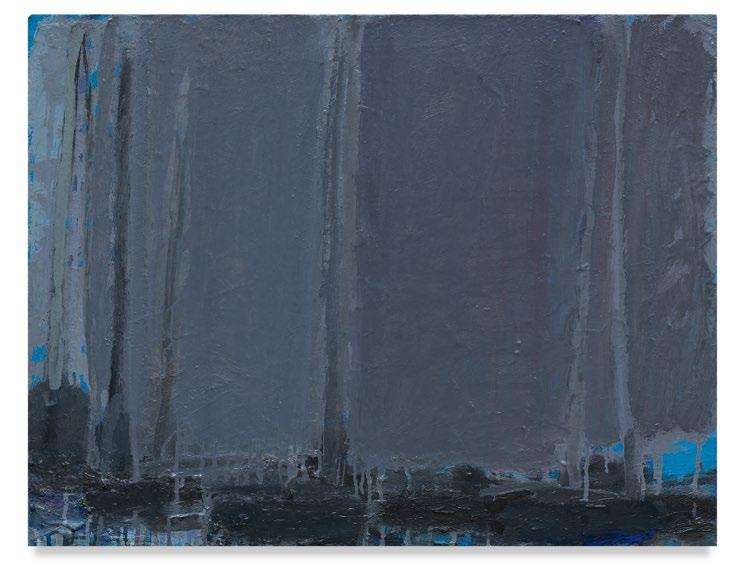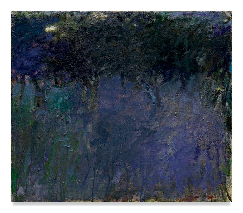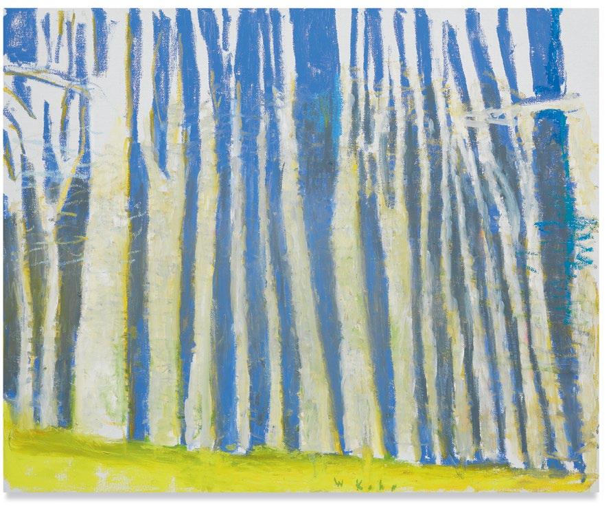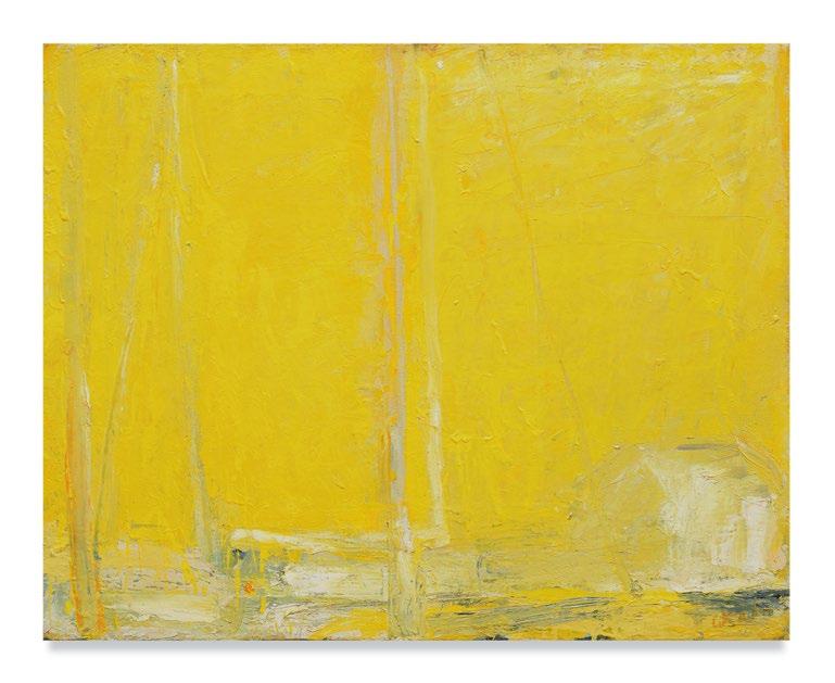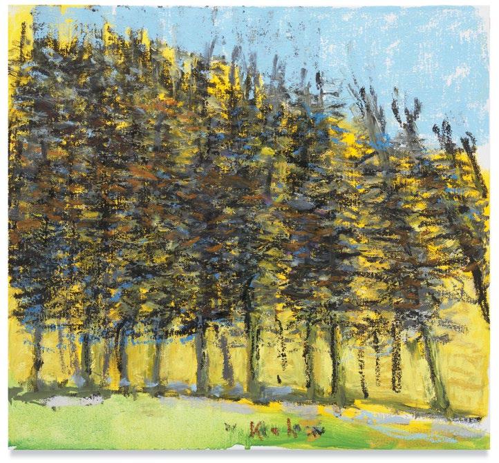 The exhibition of recent work reveals further developments in his innovative way of using oil sticks to suspend a veil over the brilliant colors of a receding landscape. Although these canvases are generally smaller than canvases from a few years ago, the new works have greater density and a more complex layering. Horizontal strokes weave through an array of magenta, yellow, and deep blue tree trunks, lending an active momentum that can energize an entire surface. A horizontal row of slender tree trunks evenly spaced across a canvas surface can present a compositional challenge to an artist who is habitually drawn to dramatic and di ffering perspectives. Yet Kahn has been using this image as a point of departure since the 1980s, perhaps with a nod to Monet’s poplar trees. In many ways, it has been a test of his virtuosity and a demonstration of an expertise that can evoke a birch grove with a series of wavering brush-drawn lines or turn a band of parallel verticals into a transition from a shadowy foreground to a sun-drenched middle distance.