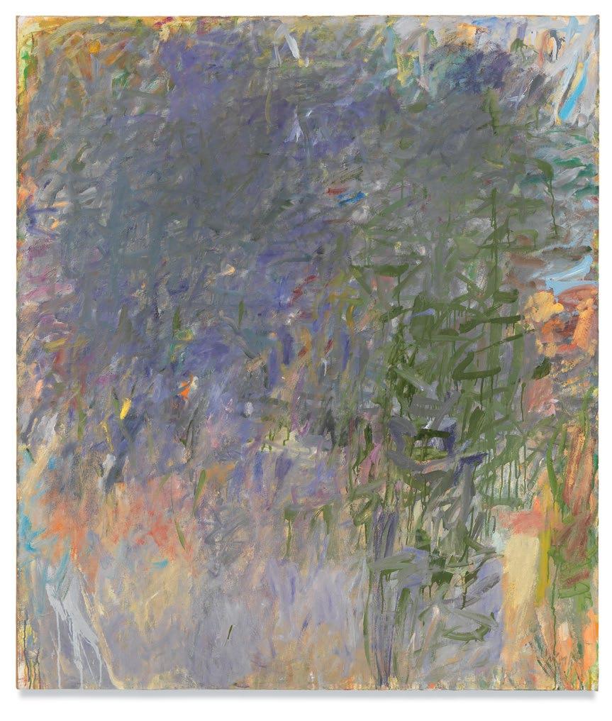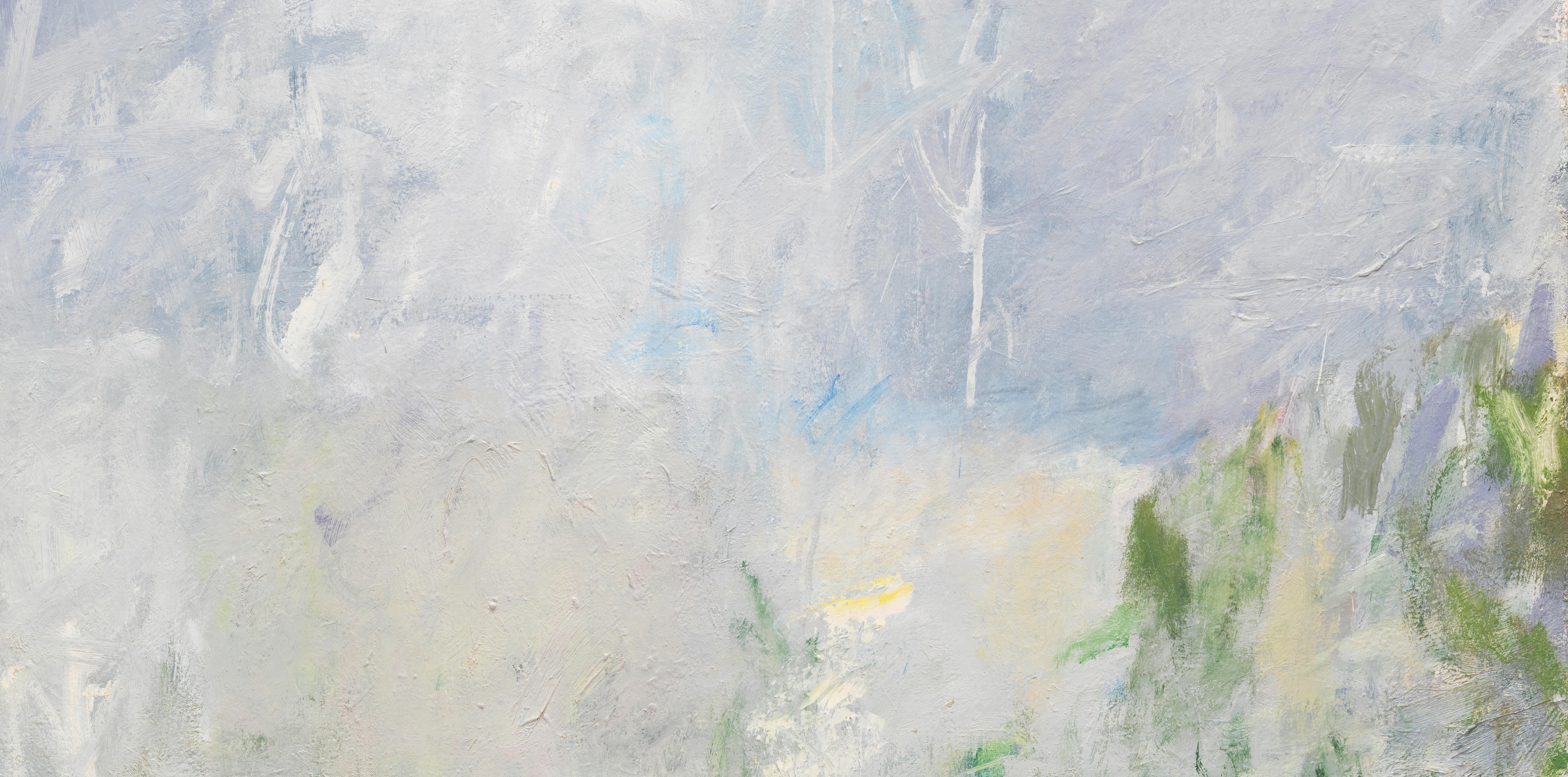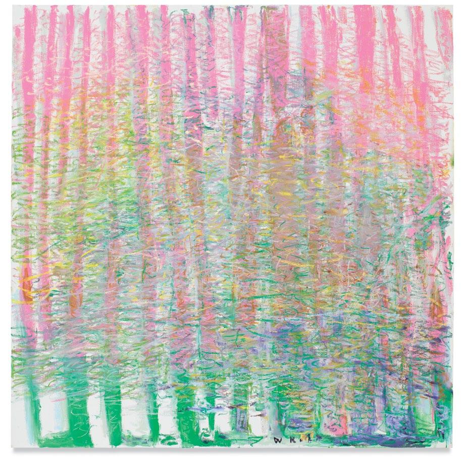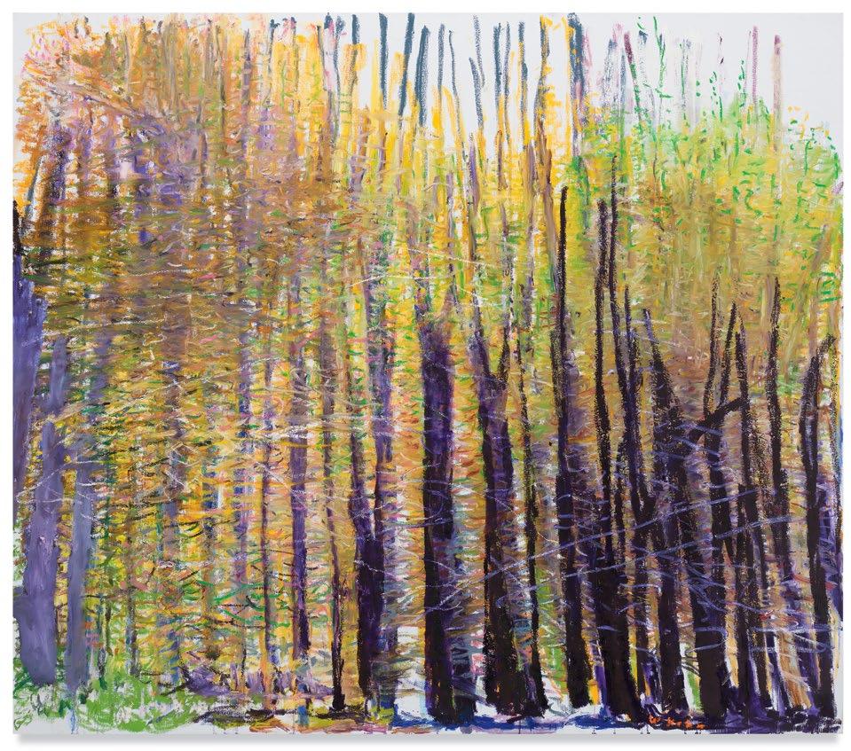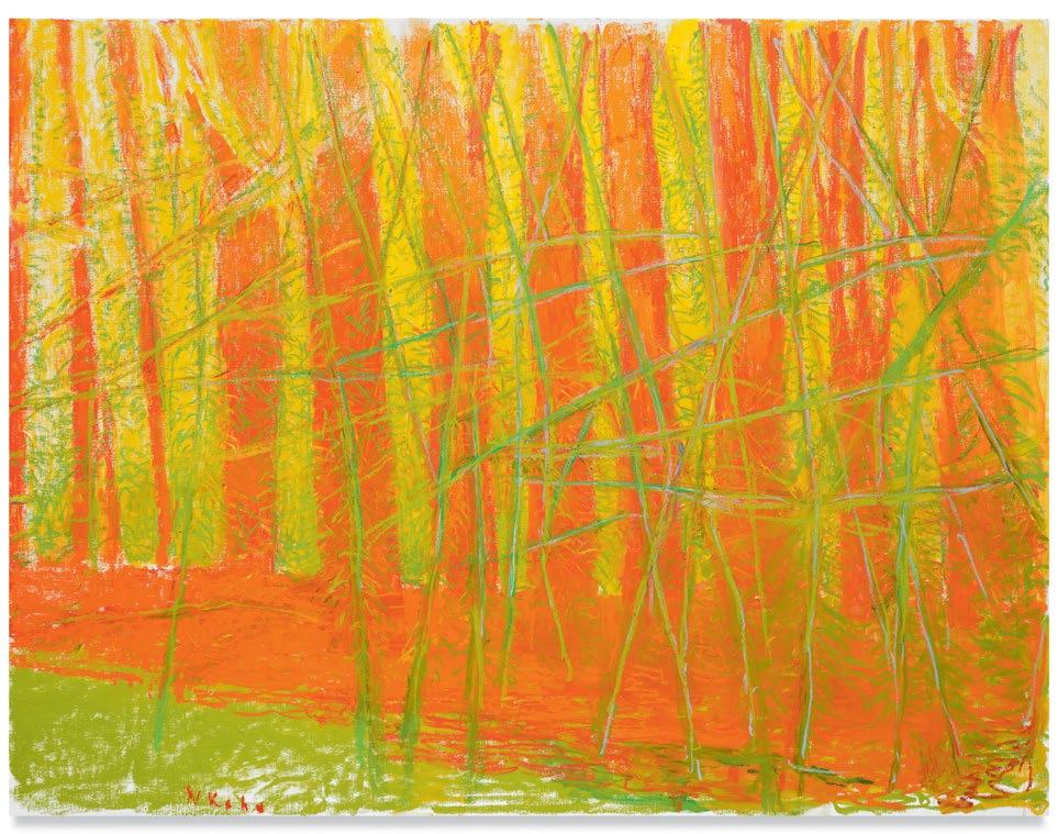 The new paintings lined up against the gallery wall, each ostensibly a view into a forested landscape, were based on an array of vertical bands of color, brushed on over layers of contrasting colors. Over these, the artist’s brush or oil stick had laid down short horizontal strokes in lighter tones, creating an alternate rhythm to the evenly spaced verticals. In some works, the long diagonal of a hillside divided the vista into near and far; in others, dense thickets of variegated color hinted at depth but kept the eye playing over the surface. Sometimes a single hue, perhaps a brilliant yellow-orange, expanded over three-quarters of a canvas to suggest a hayfield. The overall shimmering effect made looking at these paintings an ongoing process, so they never congealed into fixed images but continually drew the eye back.