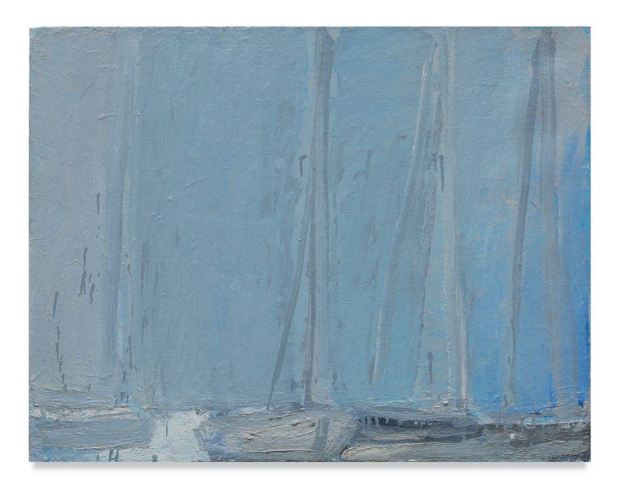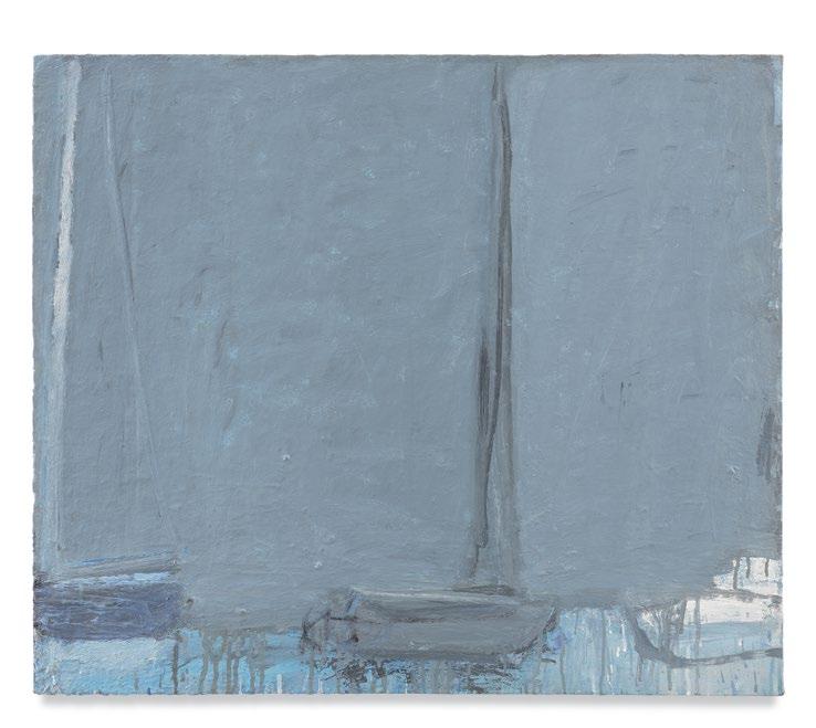 In Kahn’s many paintings of tall-masted sailboats, the thin vertical lines create an effective upward force, countering the pull of the sea that supports the floating vessels. Dispelling any rigidity resulting from the horizontal/vertical grid, light shimmers through the dominant misty greys with a dissolving effect. Similar to the rows of cypress trees, the slender vertical masts extending to the upper rim of the canvas in paintings like Sailboat Mooring (1965) become an ongoing organizing element. Over the years, he has often used a recurrent central vertical division to separate light areas from dark, perhaps the only synthetic device that he permits himself.