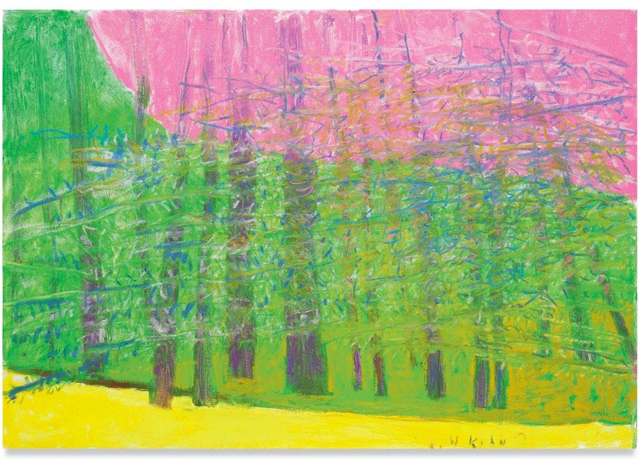 Every second year, he showed new landscapes at the Grace Borgenicht Gallery and more recently at Ameringer | McEnery | Yohe, now the Miles McEnery Gallery, as well as exhibiting in museums and galleries across the country. In his book, Wolf Kahn’s America, there are vivid descriptions of his confrontations with the landscape of the South and of Southwest, as well as accounts of the difficulties posed by changes of locale and light. The paintings grew larger and more complex, as he began to use areas of brilliant color and to draw over them with an oil stick, creating a screen of white calligraphy that veils the glimpsed landscape. The calligraphic movement of white lines over high-keyed color creates a scrim that seems to replicate the sensation one experiences in the actual process of seeing light dancing over a visual expanse.