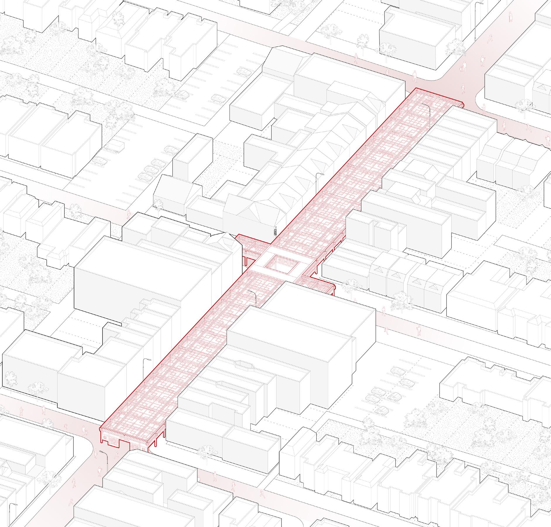 LEFT: Northwest axonometric drawing of study street.