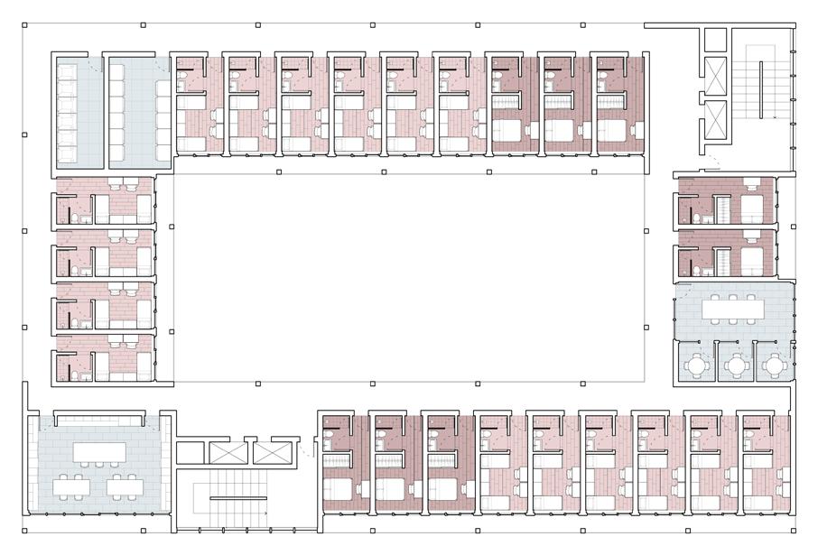 At the heart of the project is a central, hollowed-out courtyard that serves as the primary social anchor. Immediately accessible upon entry, this courtyard reinforces a sense of openness and connectivity. Two circulation cores and single-loaded corridors ensure that student units maintain a degree of privacy while still encouraging community: each unit at the rear faces the central courtyard, offering natural light, views, and opportunities for passive interaction. In this way, Lateral Habitat balances solitude and sociability, creating an inclusive living environment for students.