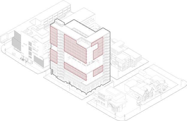 Located on the University of Toronto campus, Lateral Habitat is a student residence designed to foster social interaction and build a sense of community. The building is organized into distinct programmatic layers that gradually shift from public to private: the ground and second floors are open to the public, the third to fifth floors contain semi-public zones, and the upper levels house private student units interspersed with shared communal spaces.