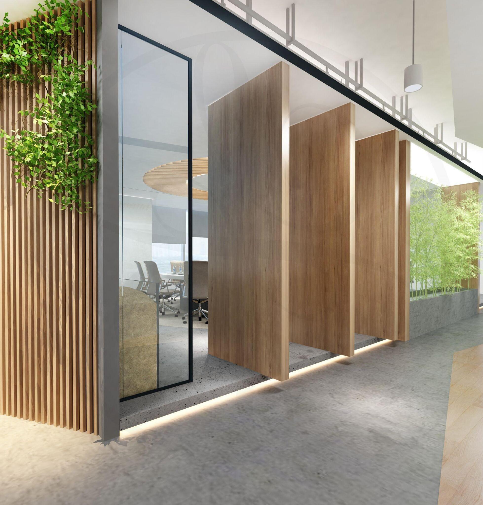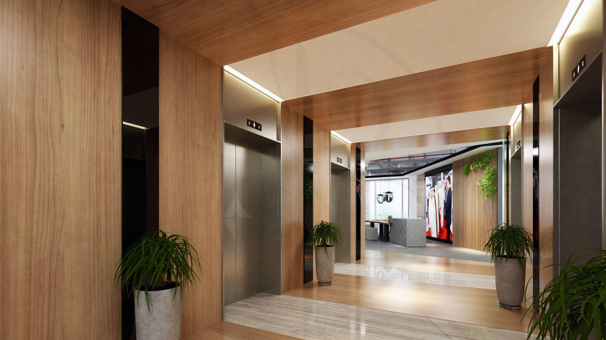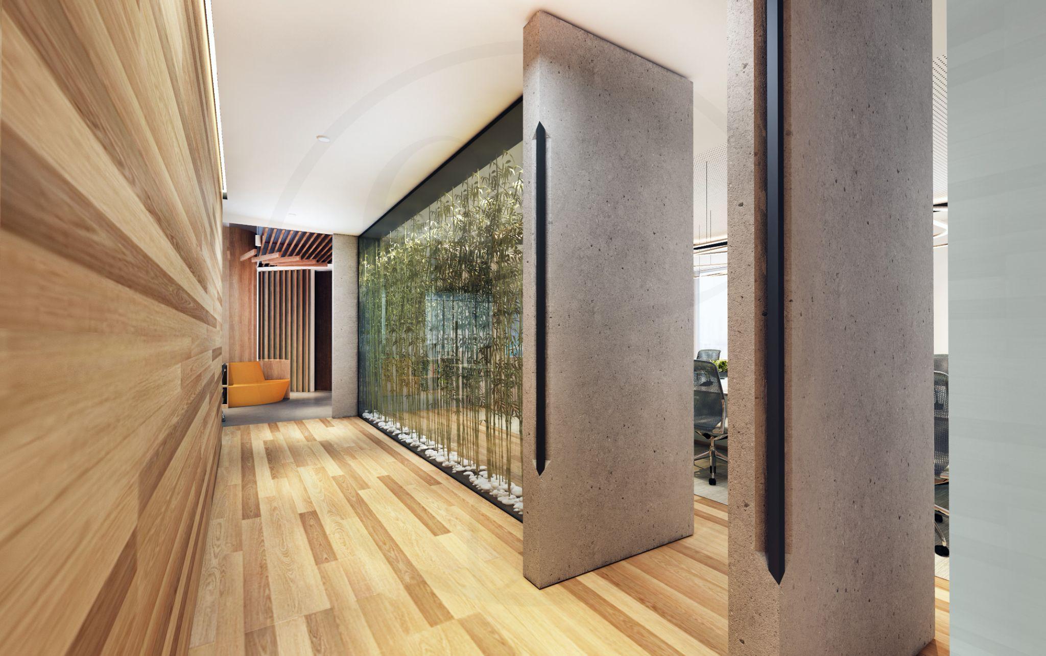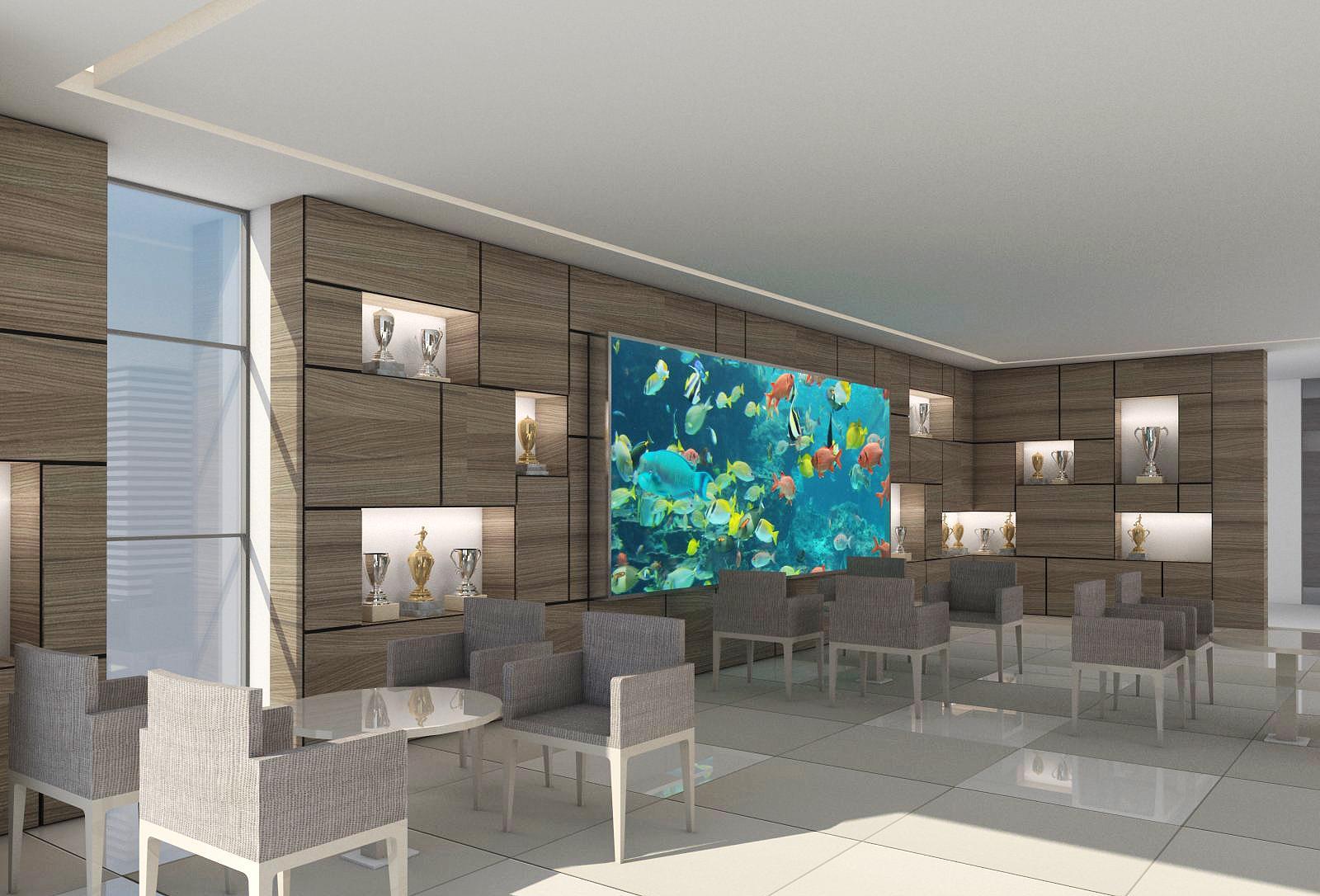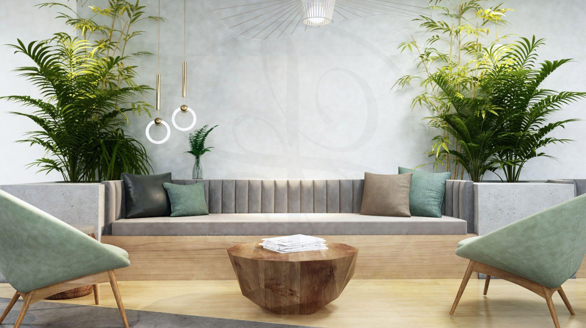 Natural design elements and indoor plants, along with a big fish tank completed lobby design for animpressivefirstsight..