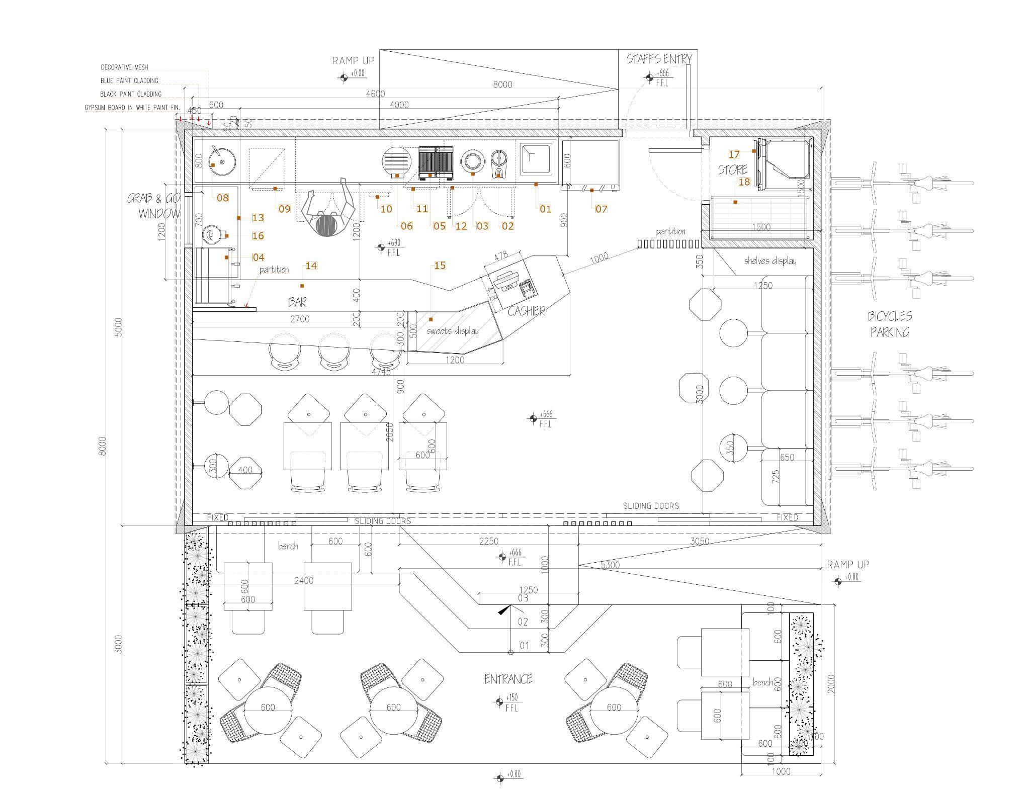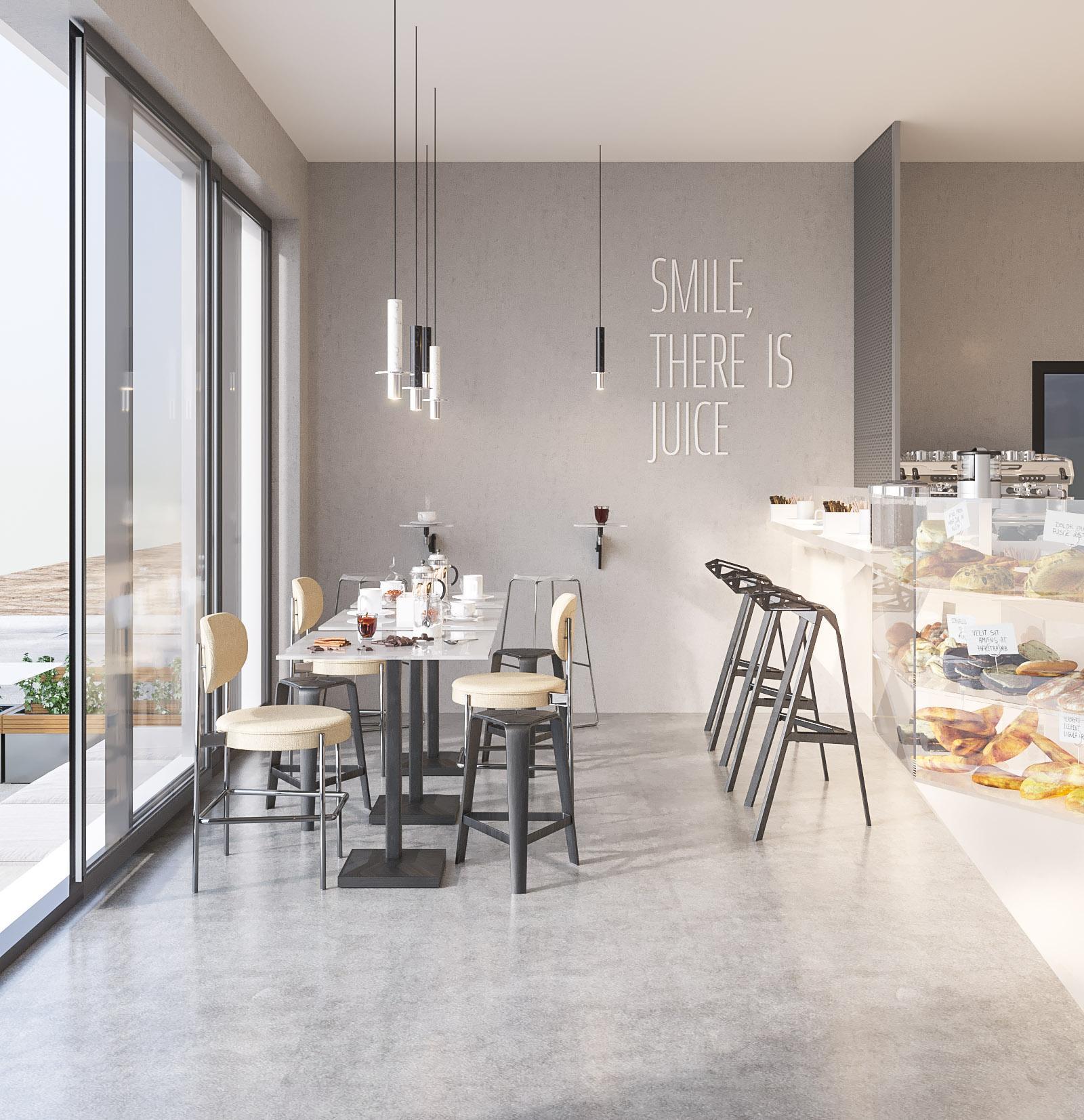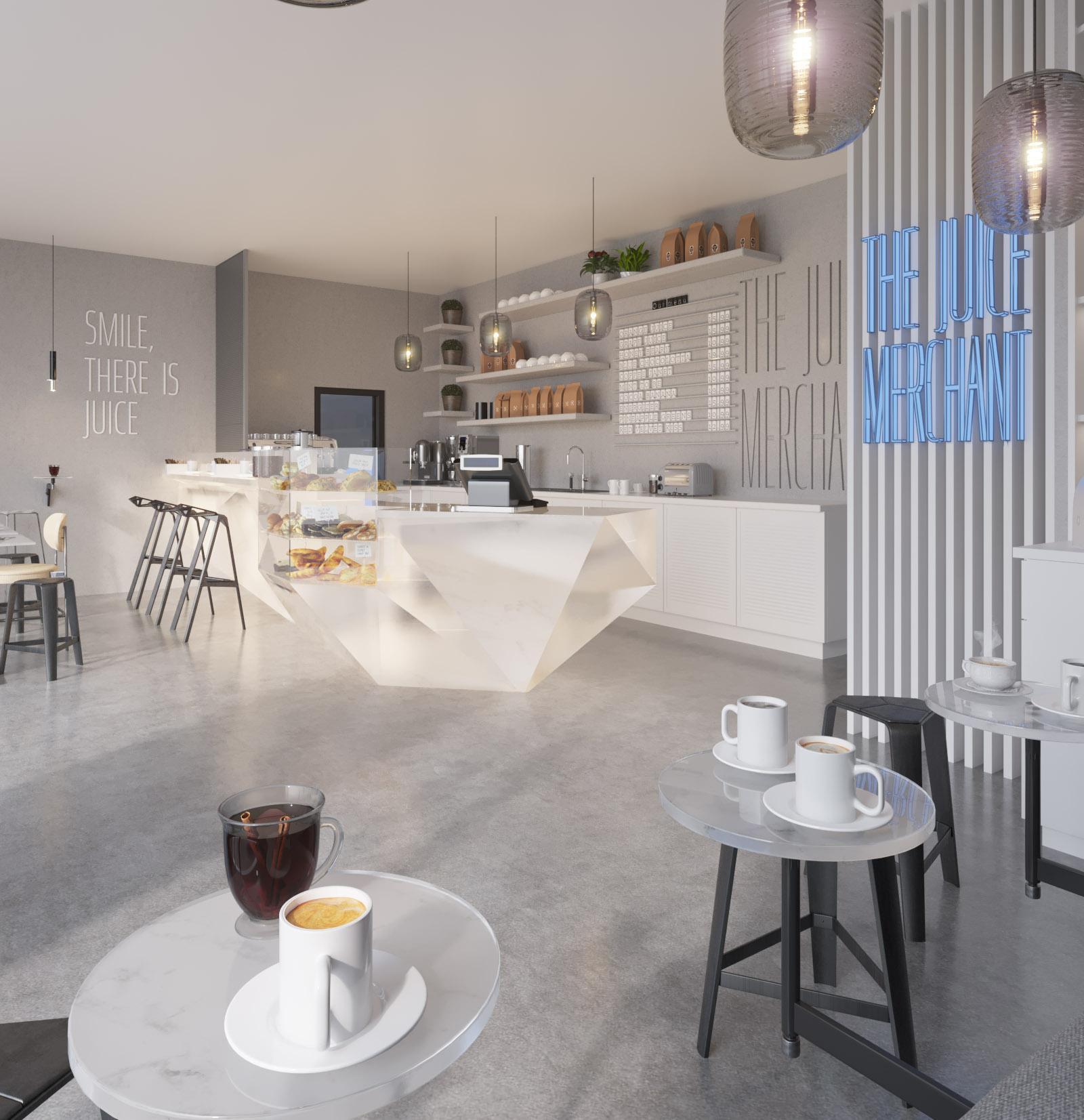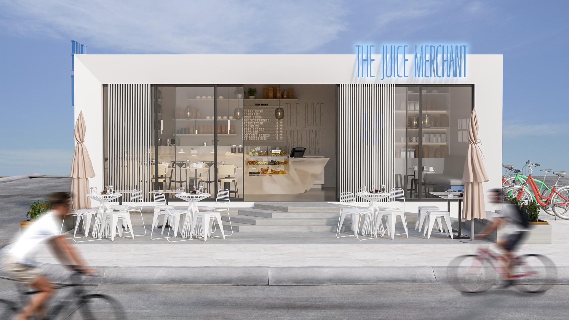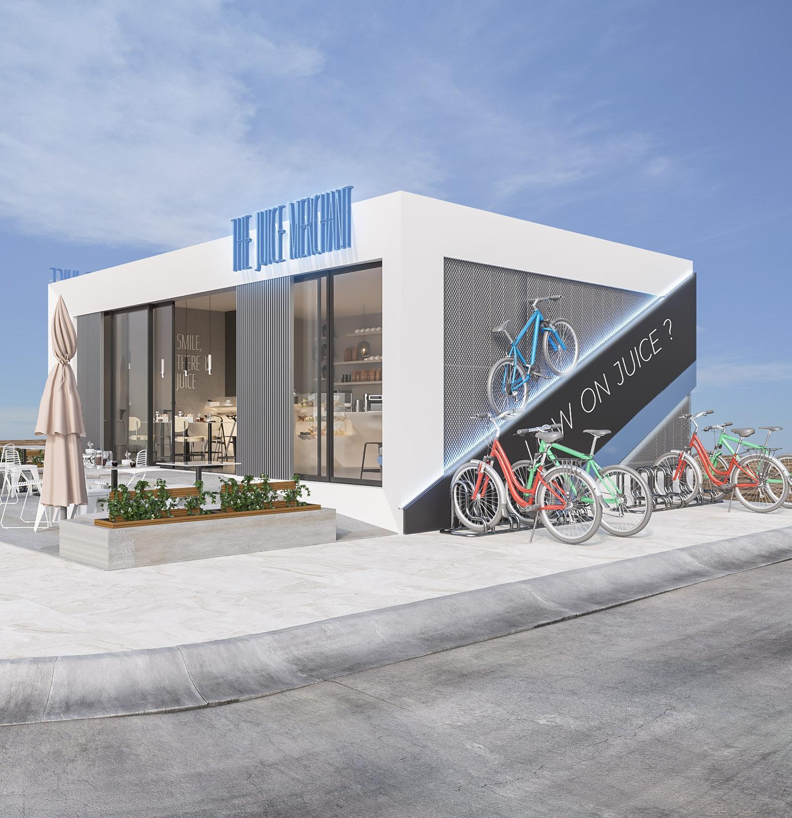 Tjmisaprojectlocatedat MEYDANNadAlSHEBA cyclingtrackoffering healthysnacksandfresh juicestoitsvisitors. Aportecabinintotal dimensions8x5m,with indoorandoutdoorsitting wasdeliveredespeciallyfor thisproject. Sportylinesinbluewhite andblackaccompany minimalisticgreyinteriors.