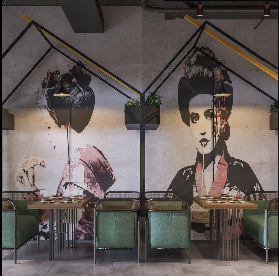 RestaurantisSharjah. Asian elements like chopsticks and cherry blossomtreeswereused in the design. Murals decorating the walls and incorporating Geishas enjoying pasta andpizza,arekeepingyu silent company during yourstay.