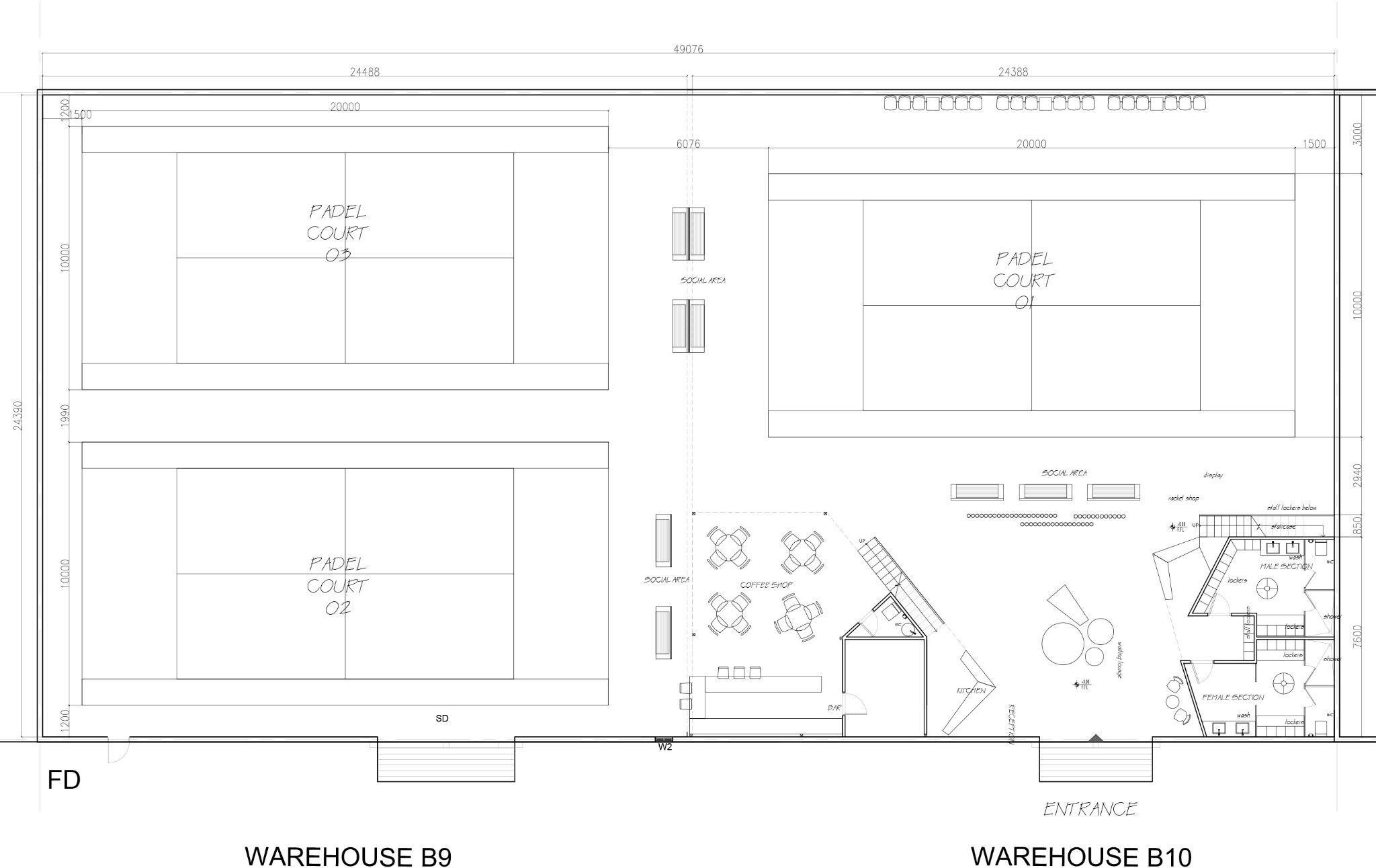 2 warehouses were connected to create the required space for 3 enclosed courts made of glassandmesh.