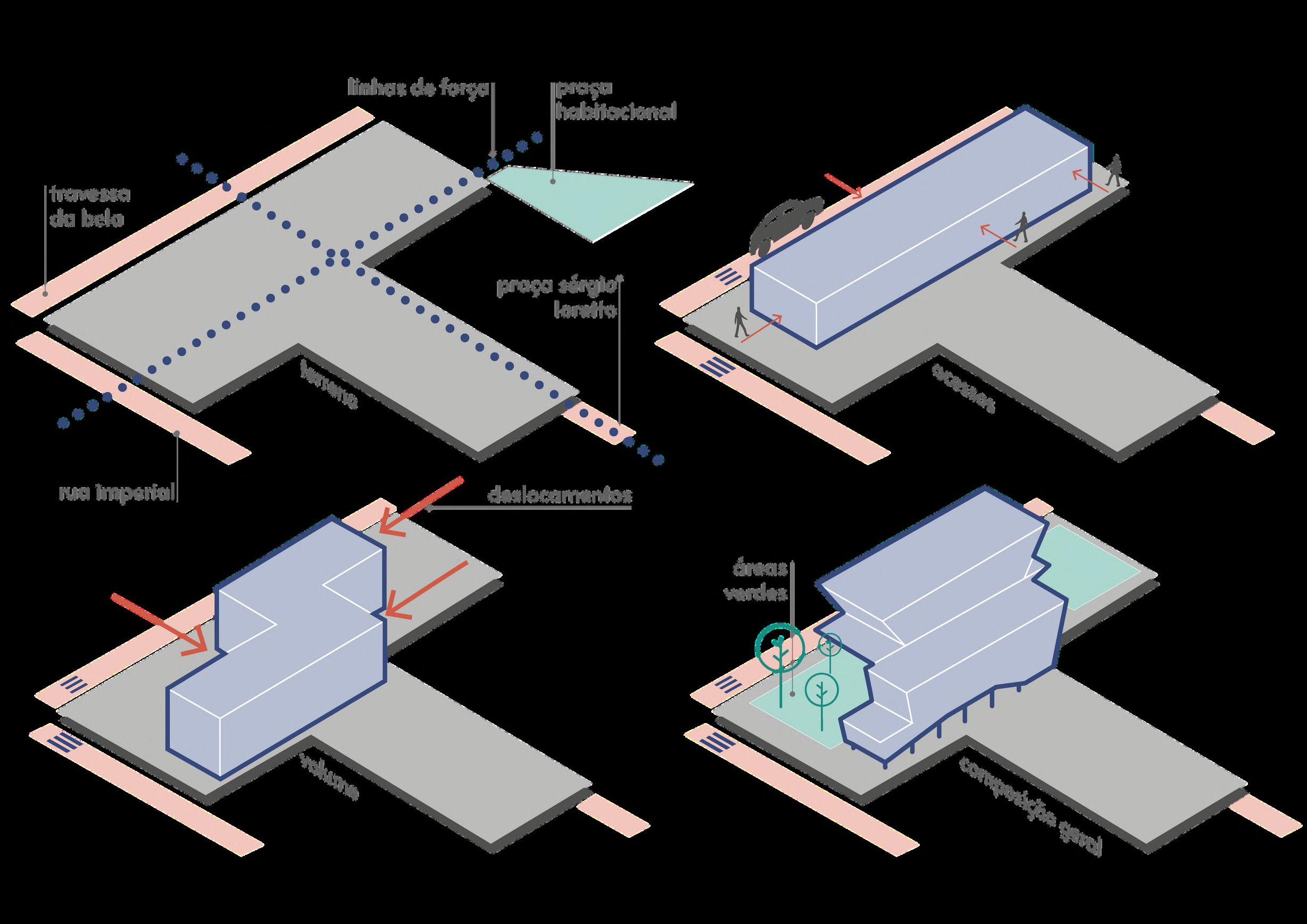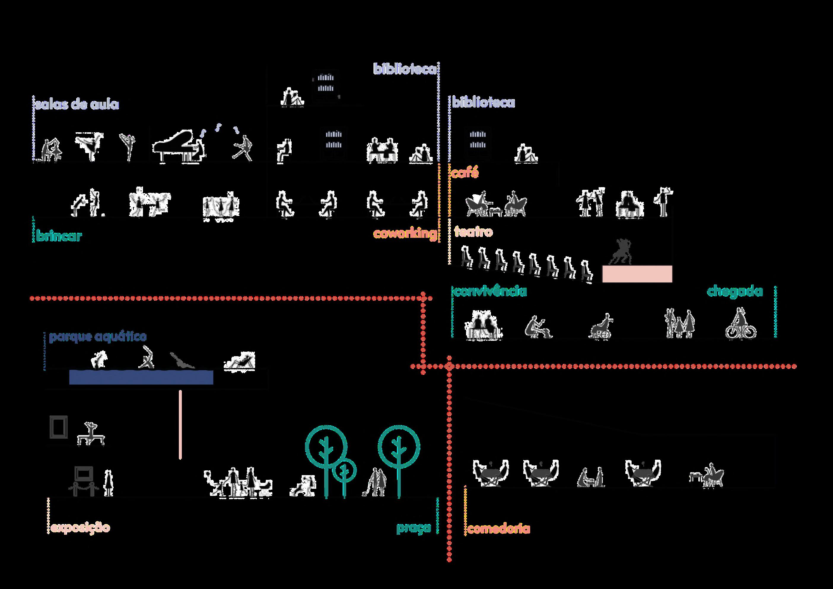 Sob tal ótica, a proposta consiste na criação de um espaço diverso e encorajador, favorável ao desenvolvimento de uma arquitetura como lugar de encontro, geradora de terceiros lugares (Farr, 2013) capazes de promover o convívio humano e o desenvolvimento de suas atividades. O caráter público da justaposição de atividades culturais, educacionais e esportivas presente no programa de necessidades estimula a produção de um espaço que tenha definido um caráter urbano em seu interior, e que também seja elemento indutor do desenvolvimento urbano no seu