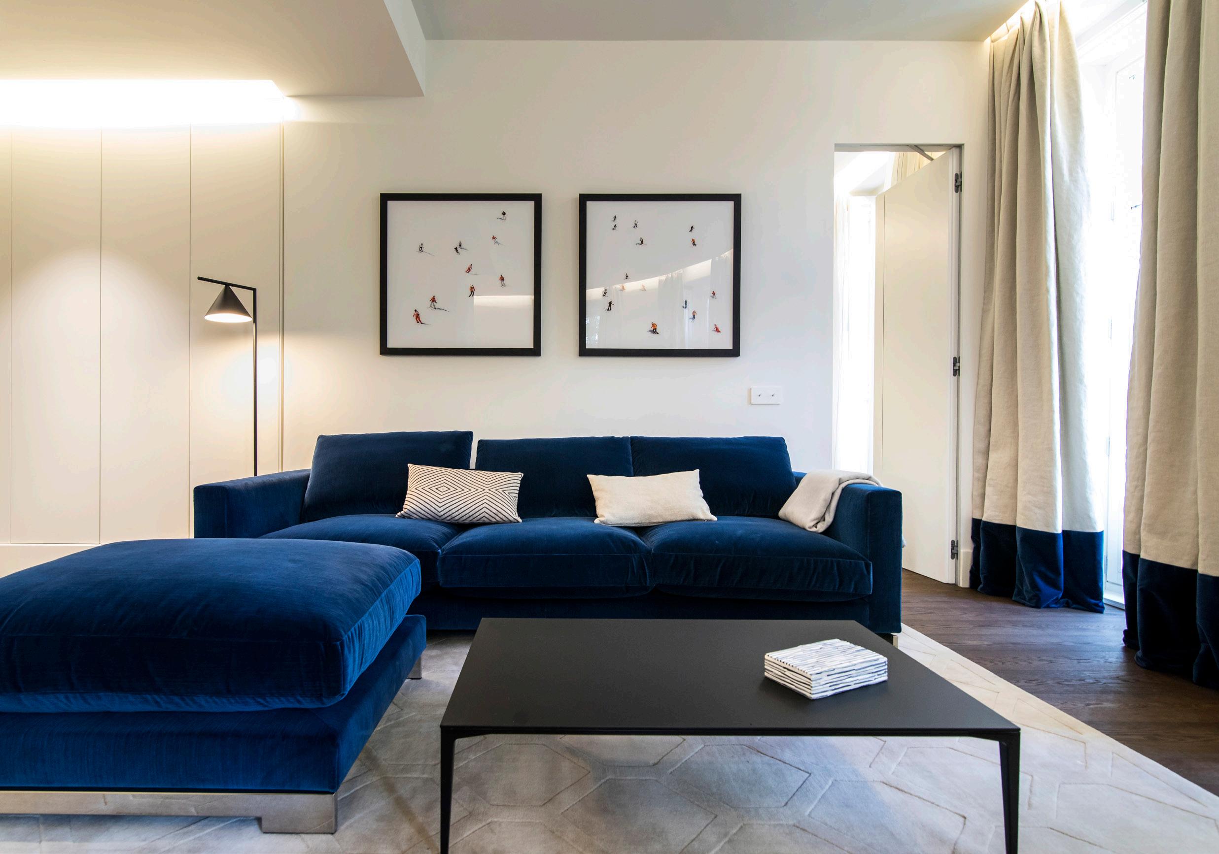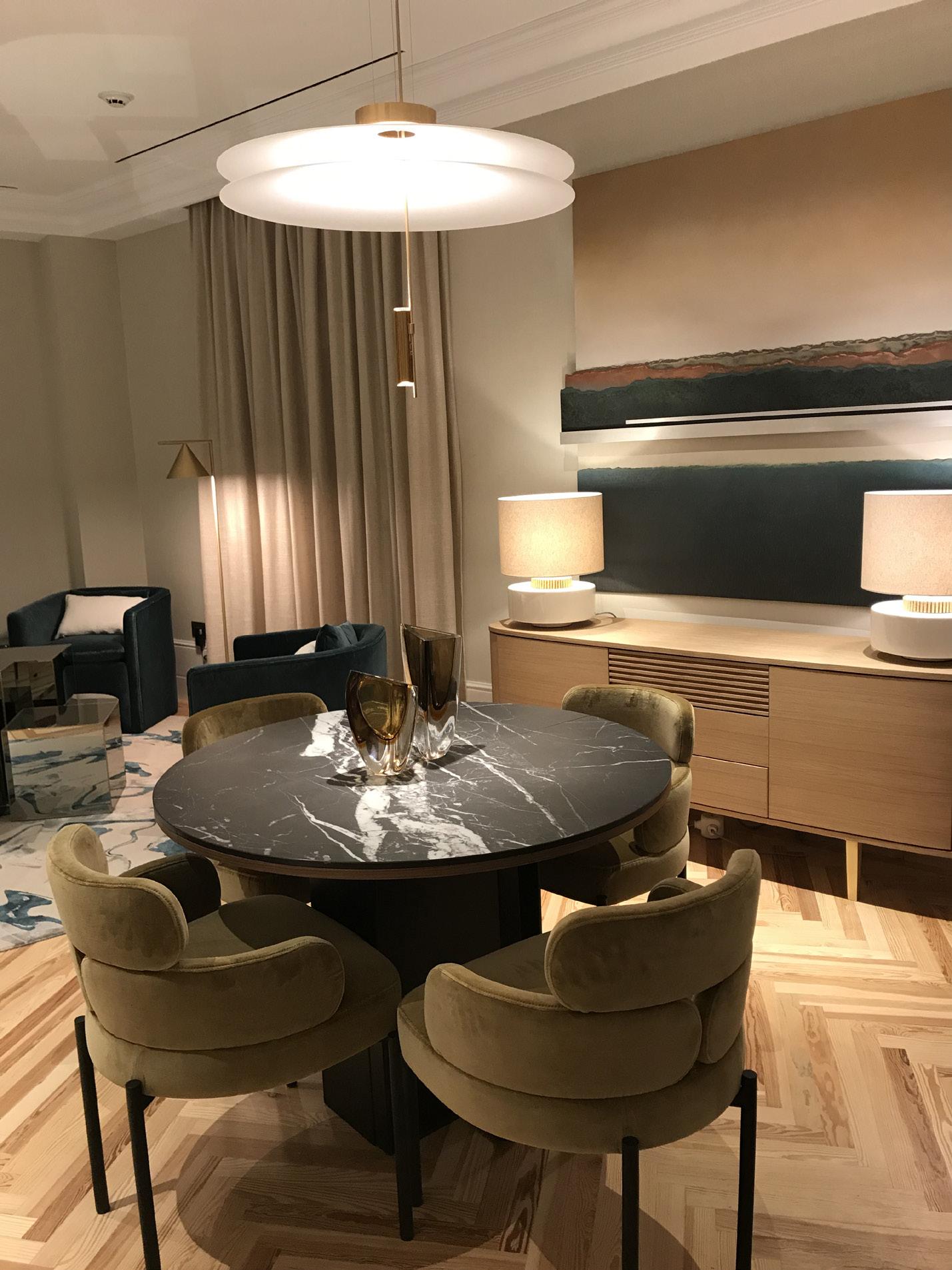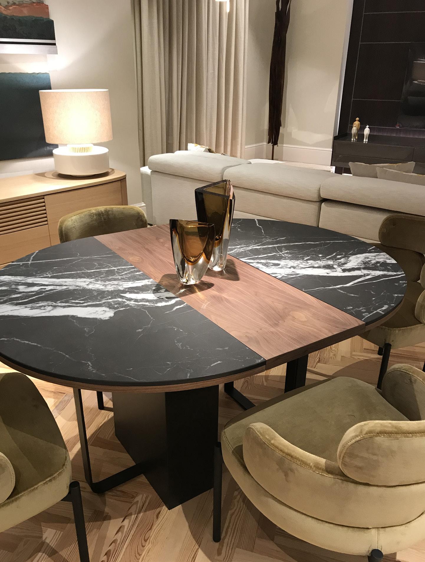 La mesa de juego extensible, también ha sido proyectada por el estudio, empleando materiales naturales que son una constante en todo el proyecto. La zona más relajada de la estancia, se encuentra delimitida por una alfombra redonda en tonos azules. Otra de las piezas exclusivas realizadas por artesanos locales son las mesas coffee en espejo y canteadas en latón.