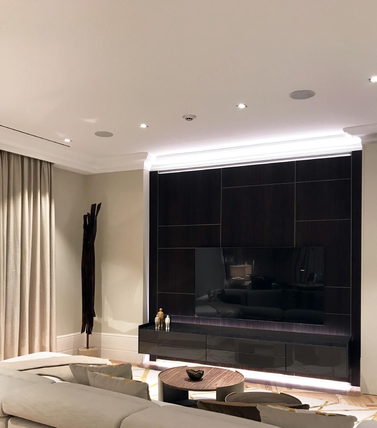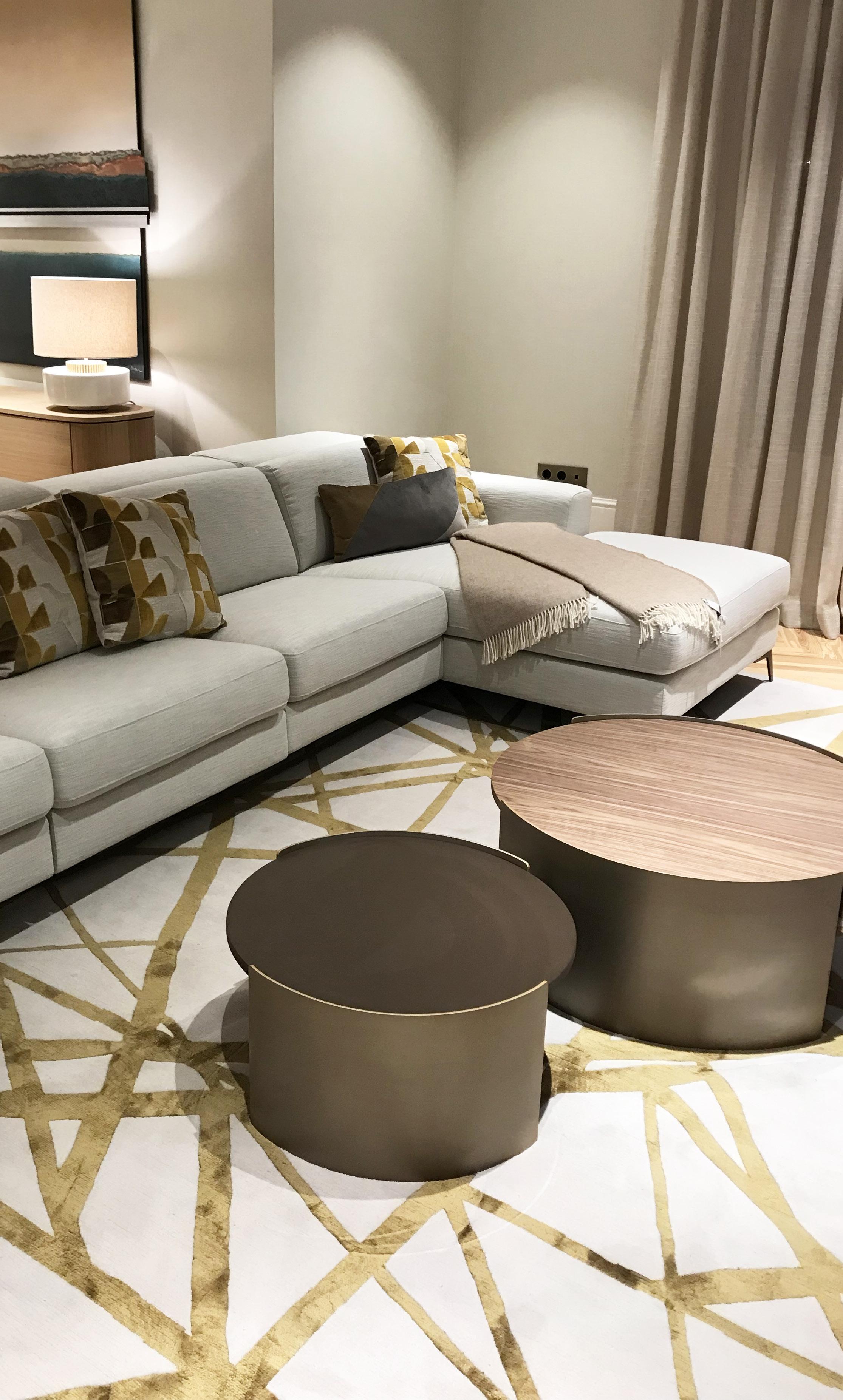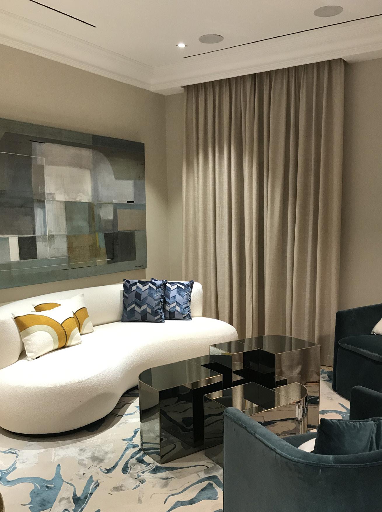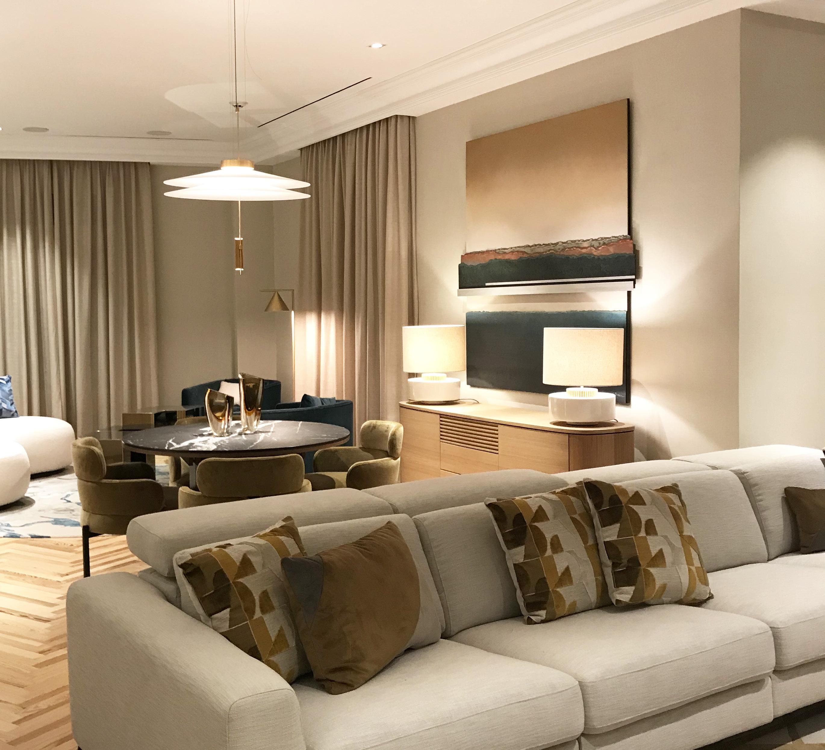 Una paleta de colores cálida, piezas de mobiliario únicas y las obras de arte, definen el estilo contemporáneo de esta vivienda. En el salón se observan dos ambientes, una amplia zona de TV para disfrutar en familia y una zona más social. En la zona de TV, destaca una gran alfombra de rayas de seda metalizada sobre un fondo de lana tibetana. El gran sofá con chaise lounge y módulos abatibles, separa la zona de TV de la mesa de juego.