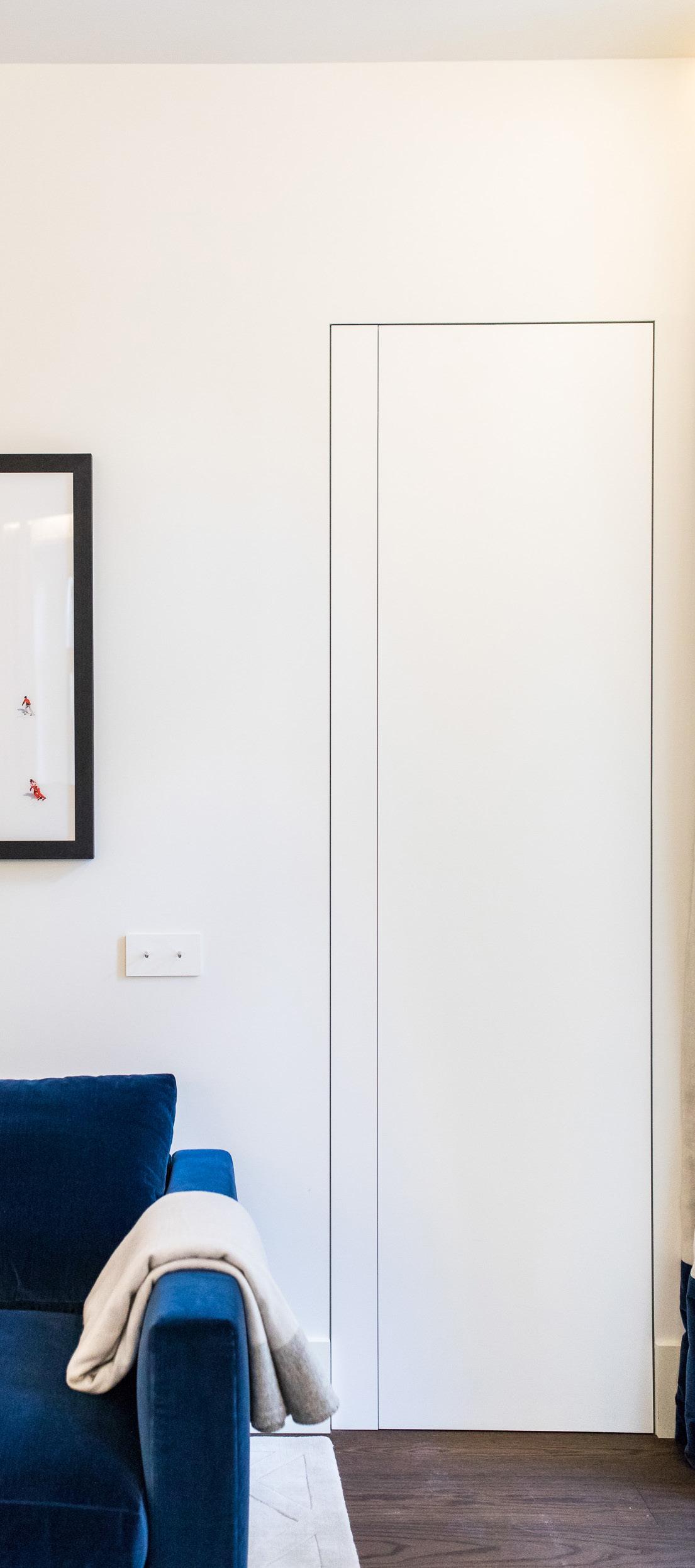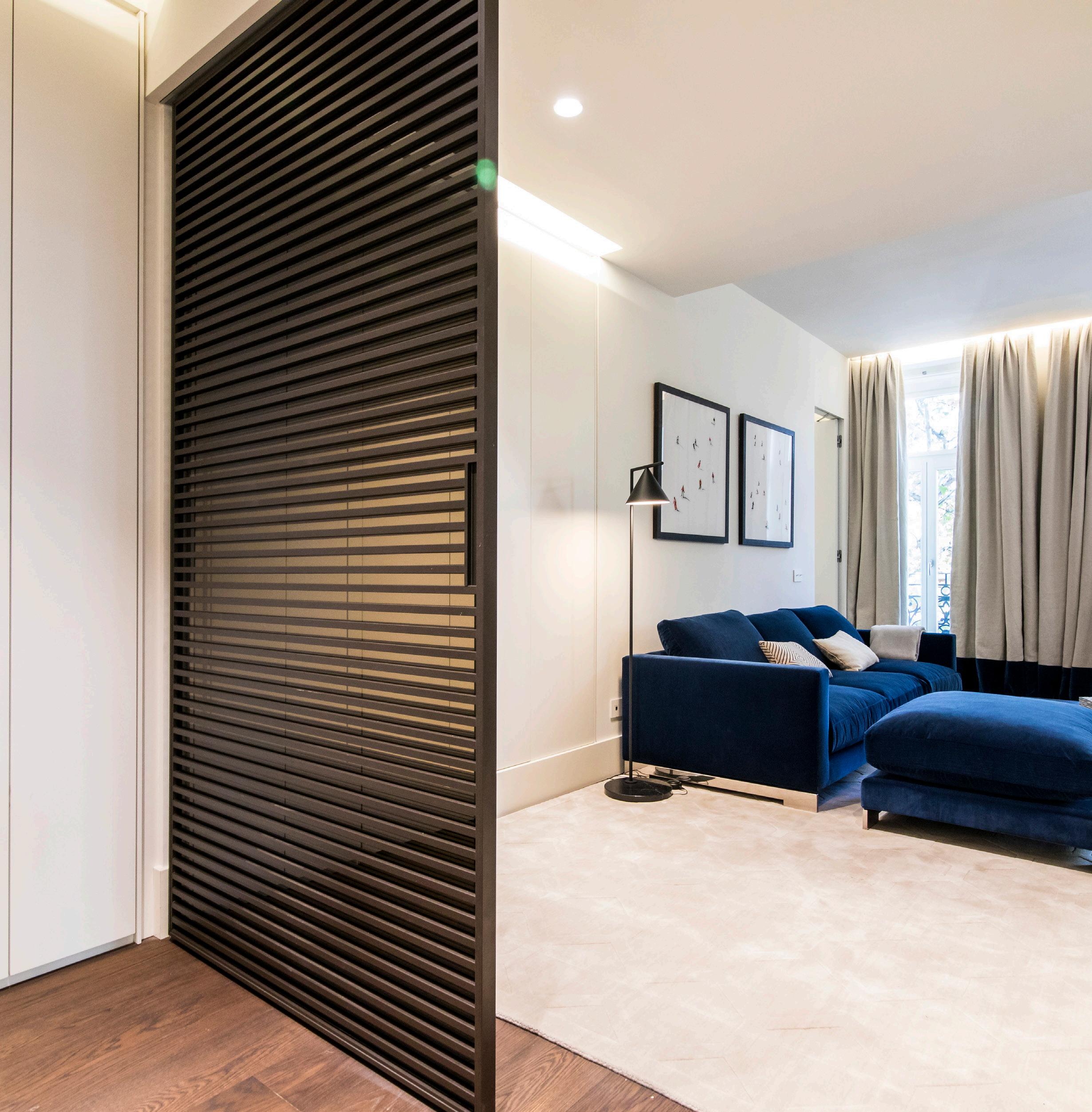 En las paredes blancas destacan las obras realizadas por la madre del propietario, fotógrafa de profesión. Otros elementos llamativos son las puertas de paso enrasadas, con sistema de apertura oculto o la puerta que divide el salón de la zona de entrada y que ayuda a preservar la intimidad de la zona de estar.