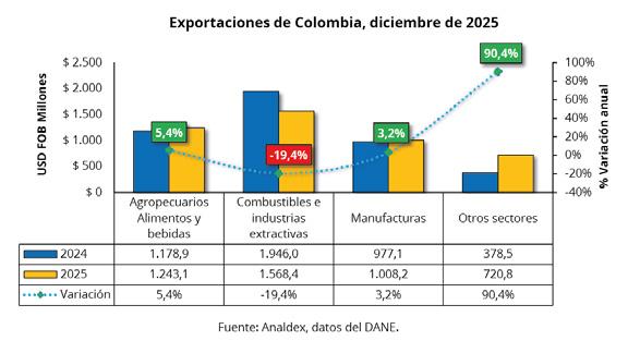 El aumento del valor de las importaciones colombianas en diciembre fue explicado principalmente por el crecimiento en vehículos de carretera (38,0%), Aparatos y equipo para telecomunicaciones y para grabación y reproducción de sonido (19,6%) y Demás agropecuarios, alimentos y bebidas (38%) que en conjunto contribuyeron con 5,3 puntos porcentuales positivos a la variación total.