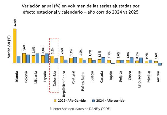 Finalmente, al comparar con algunos países de la OCDE que ya han publicado este dato del PIB corrido del año 2025, Colombia se ubica en la quinta posición con mayor crecimiento, aunque las cifras son parciales, ya que varios países aún no tienen la cifra para el total del 2025.