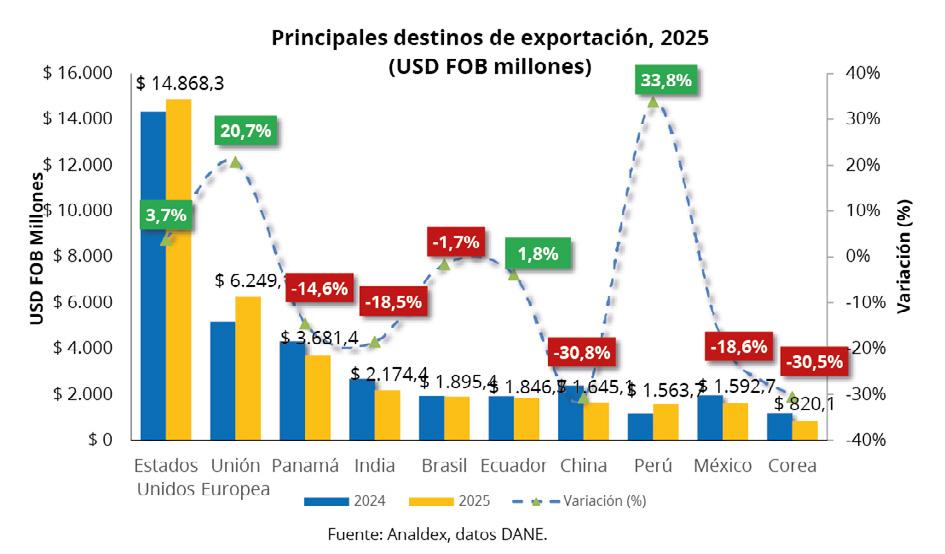 3.651,5 millones, seguido de Países Bajos con USD FOB $ 1.453,5 millones, y en tercer lugar Ecuador con USD FOB $ 1016,5 millones.