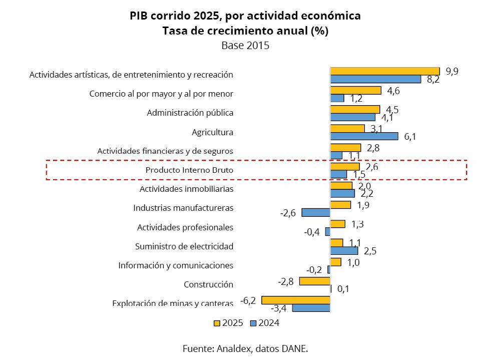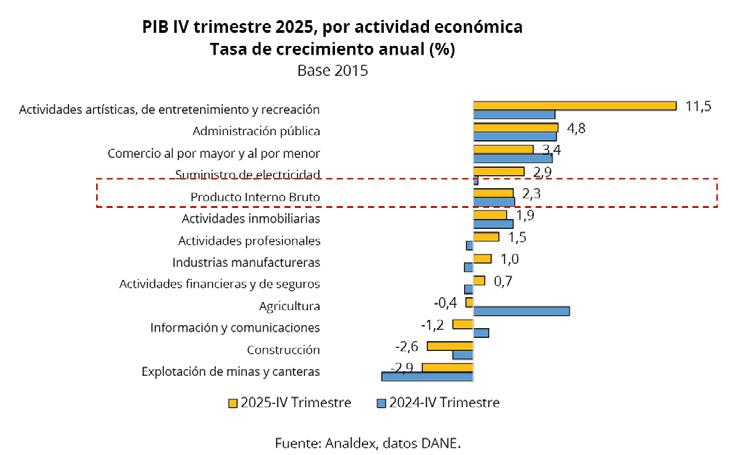 Respecto al cuarto trimestre de 2025, también se evidenció un crecimiento de ocho actividades productivas frente al mismo periodo del 2024 creciendo de la siguiente manera: Actividades artísticas, entretenimiento y recreación (11,5%), administración pública y defensa (4,8%), comercio al por mayor y al por menor (3,4%), suministro de electricidad, gas, vapor y aire (2,9%), actividades inmobiliarias (1,9%), actividades profesionales (1,5%), industrias manufactureras (1,0%) y actividades financieras (0,7%). Por su parte, hubo un decrecimiento de agricultura y ganadería (-0.4%), información y comunicaciones (-1,2), construcción (-2,6%), y explotación de minas y canteras (-2,9%).