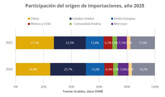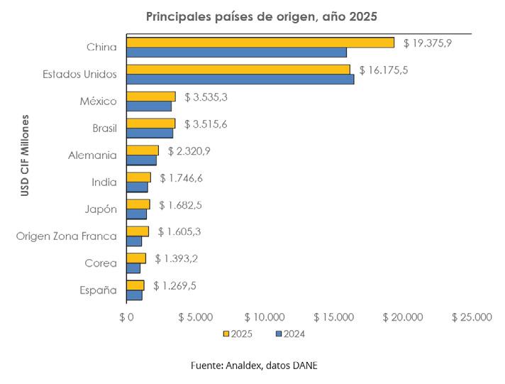 Al analizar los países de origen de los productos importados, para el año 2025, China sigue manteniendo el primer lugar con una participación de 27,48%, cerrando de esta manera el año como nuestro principal proveedor. Para este mismo periodo se registraron compras a este país por un valor de USD CIF $ 19.375,9 millones y una variación positiva de 21,6% respecto al periodo de referencia en el año 2024.