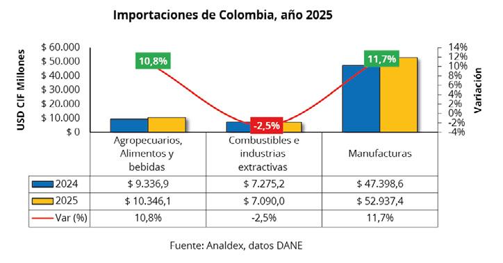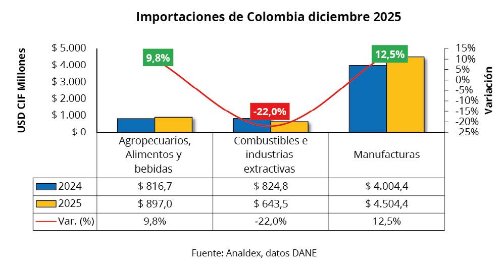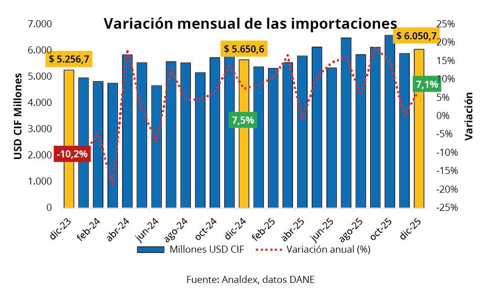 En el registro mensual correspondiente al mes de diciembre de 2025, las importaciones colombianas alcanzaron la cifra de USD CIF $ 6.050,7 millones, lo que representa un crecimiento en su valor del 7,1% frente al nivel del