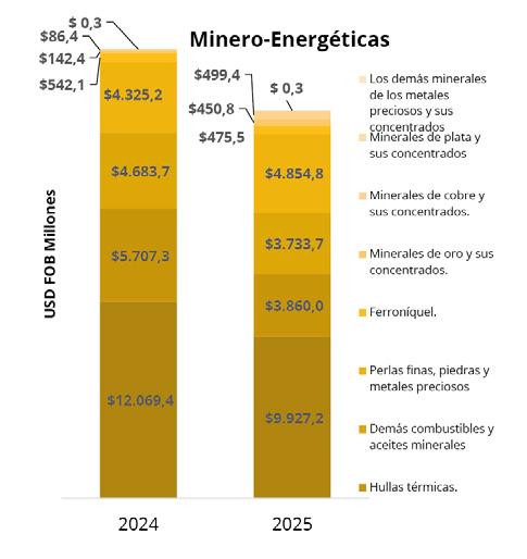 Finalmente, En el año 2025, el saldo comercial de mercancías es negativo, alcanzando para este periodo un déficit de USD FOB $16.337,3 millones, mientras que para el año 2024 el déficit fue de USD FOB $10.806,7 millones. Por tanto, se evidencia un aumento